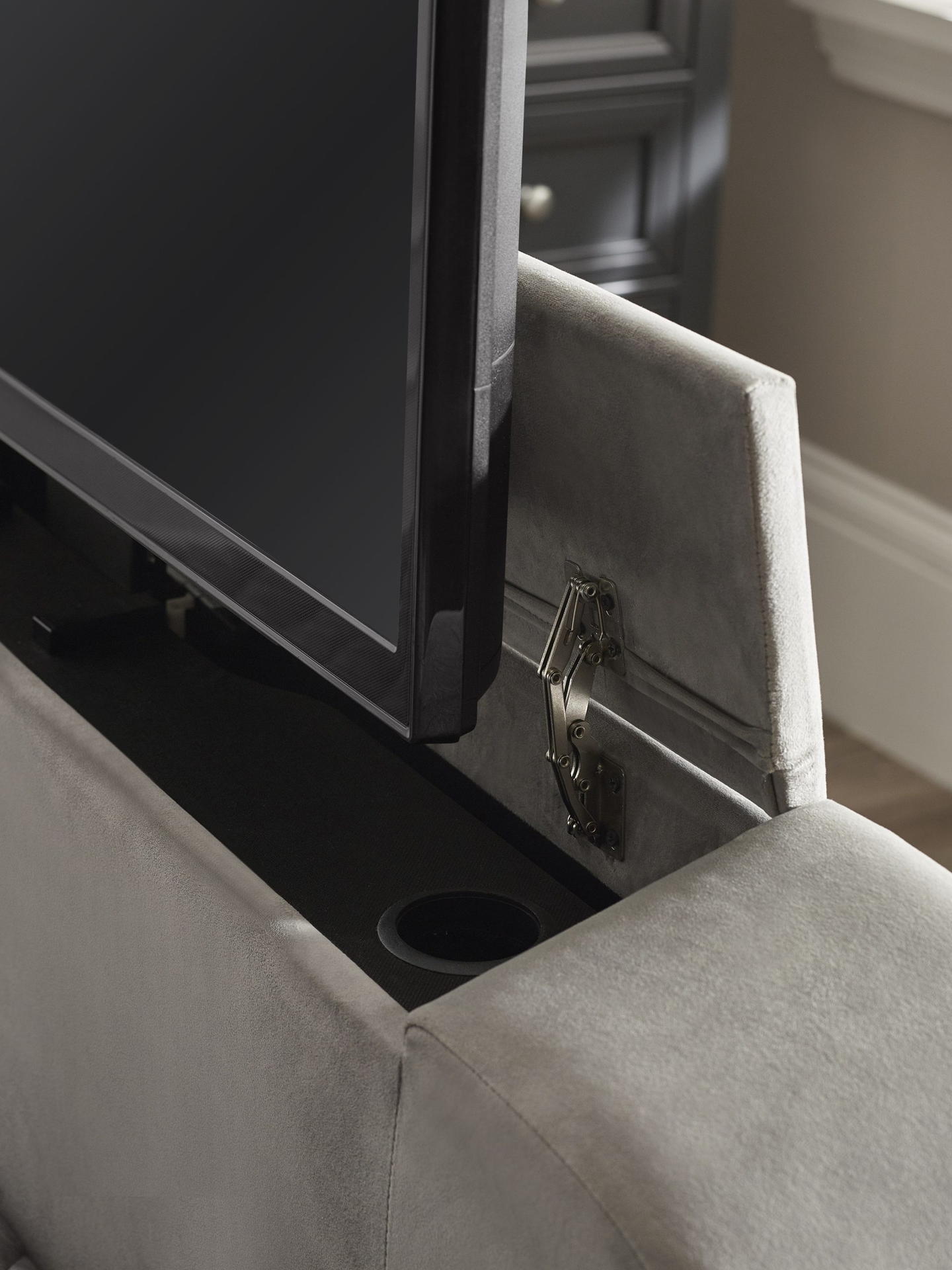 Remote-controlled TV lift functionality included.