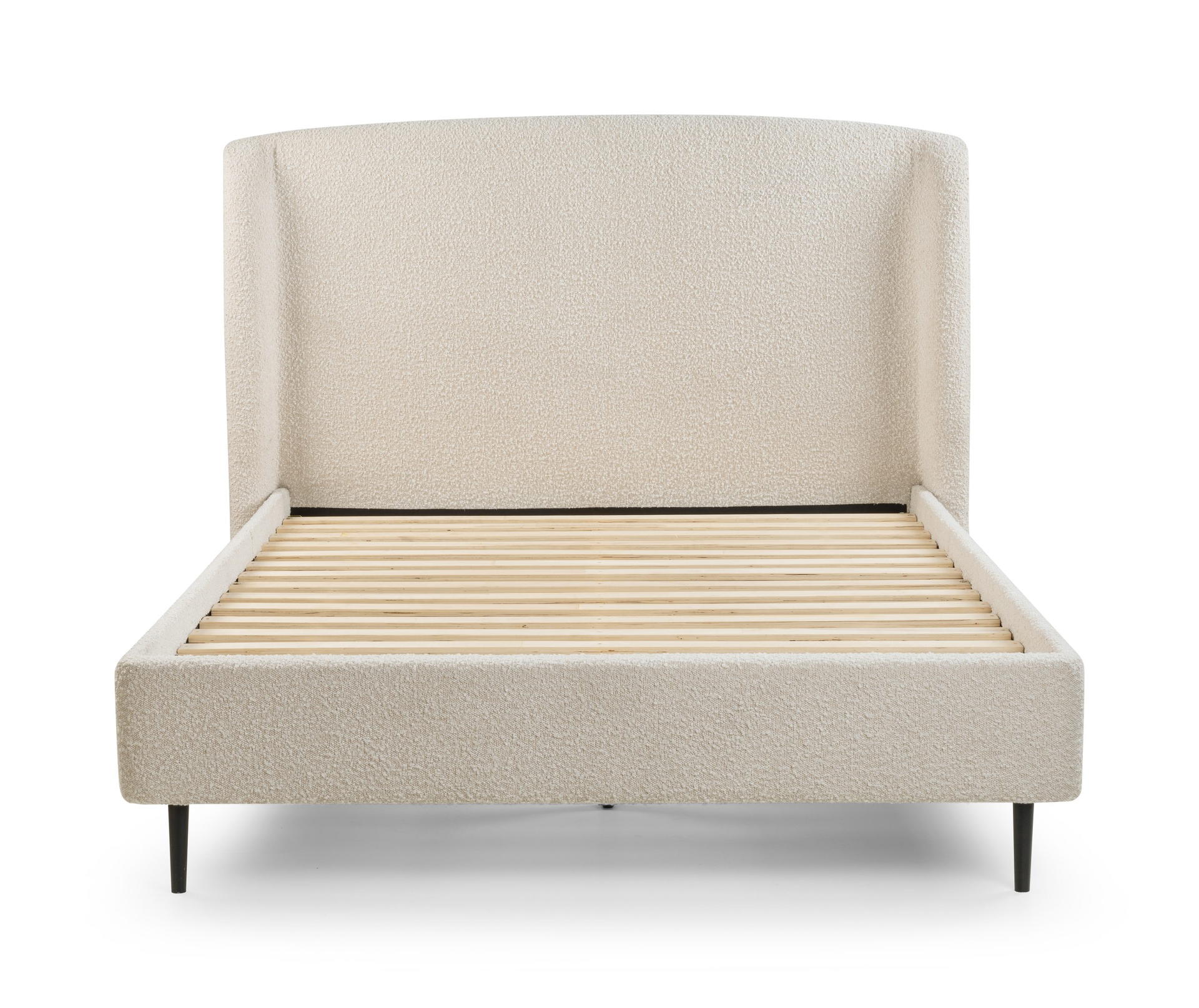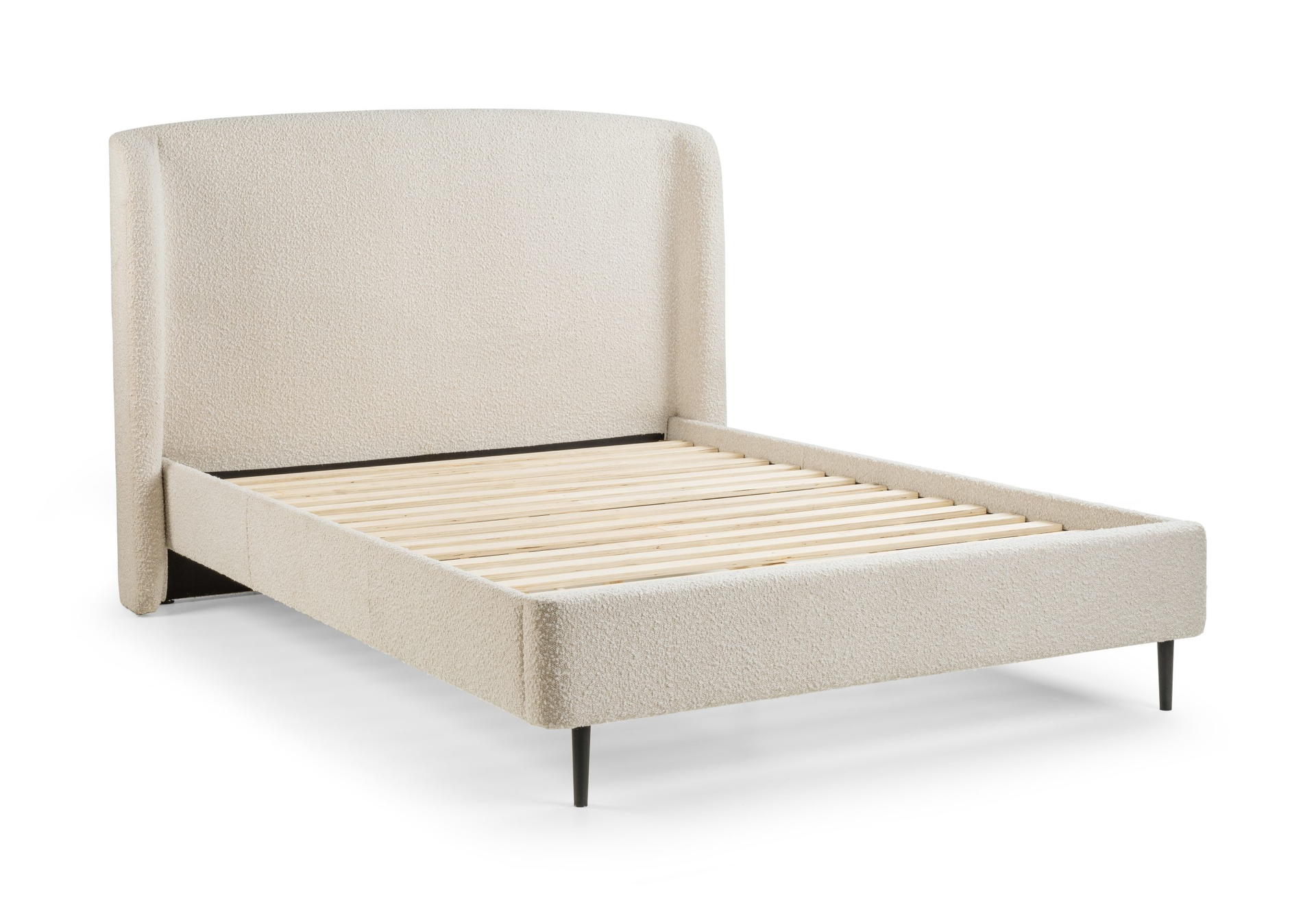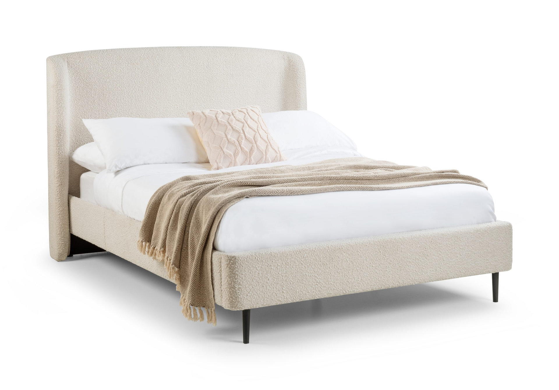 The Eden Boucle Bed excels in class and elegance bringing a sense of style and comfort to any modern bedroom space. Featuring a curved headboard and finished in a stunning ivory boucle with black legs.