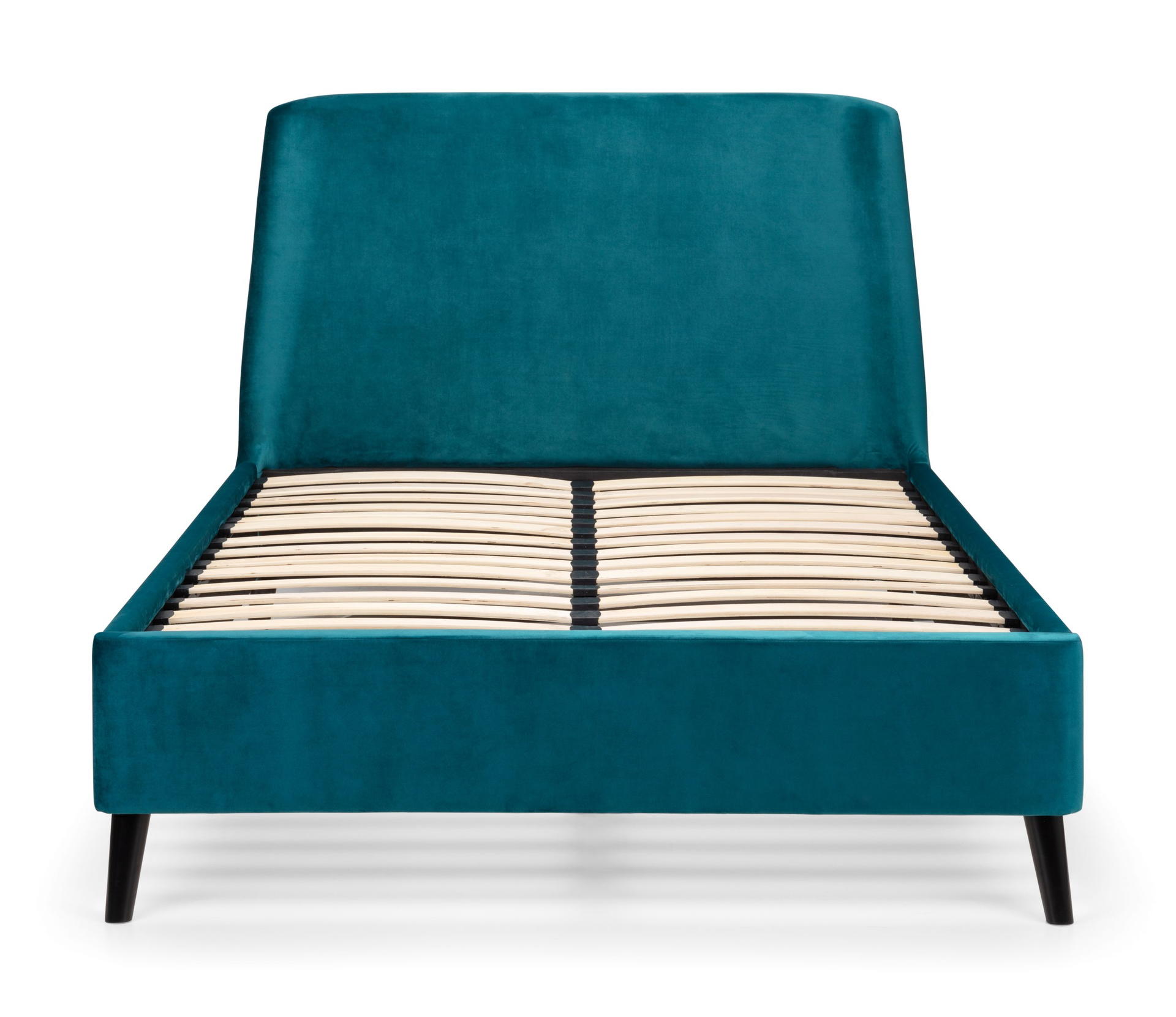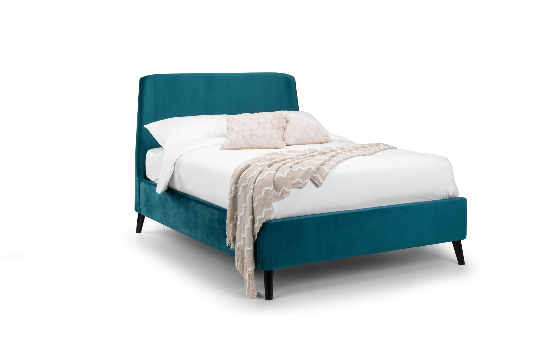 Featuring a gorgeous, curved headboard, the Frida bed exudes elegance and comfort. The black contrasting legs paired with the smooth velvet gives a modern look – and is likely to be the statement piece in any bedroom. It is also available in an ottoman version, perfect for those with smaller bedroom areas as it provides that extra storage space. Available in two beautiful shades of teal and grey.