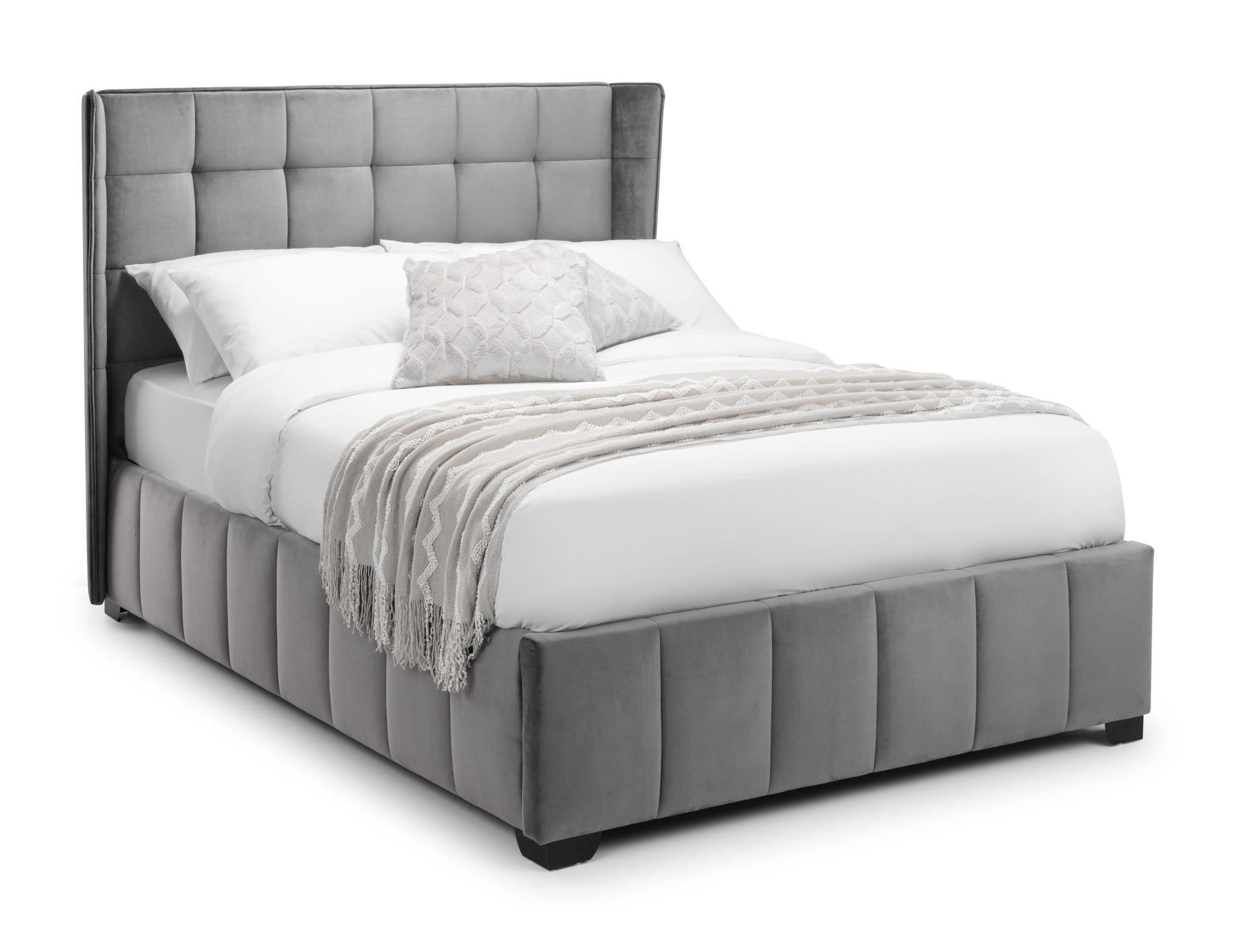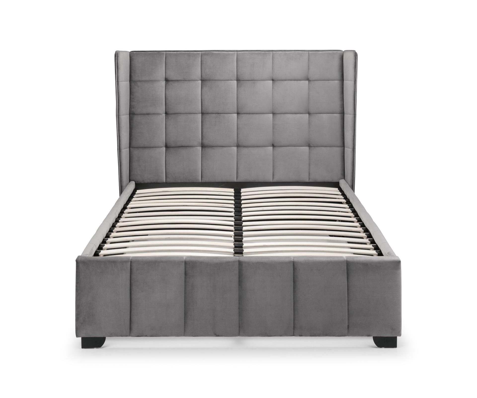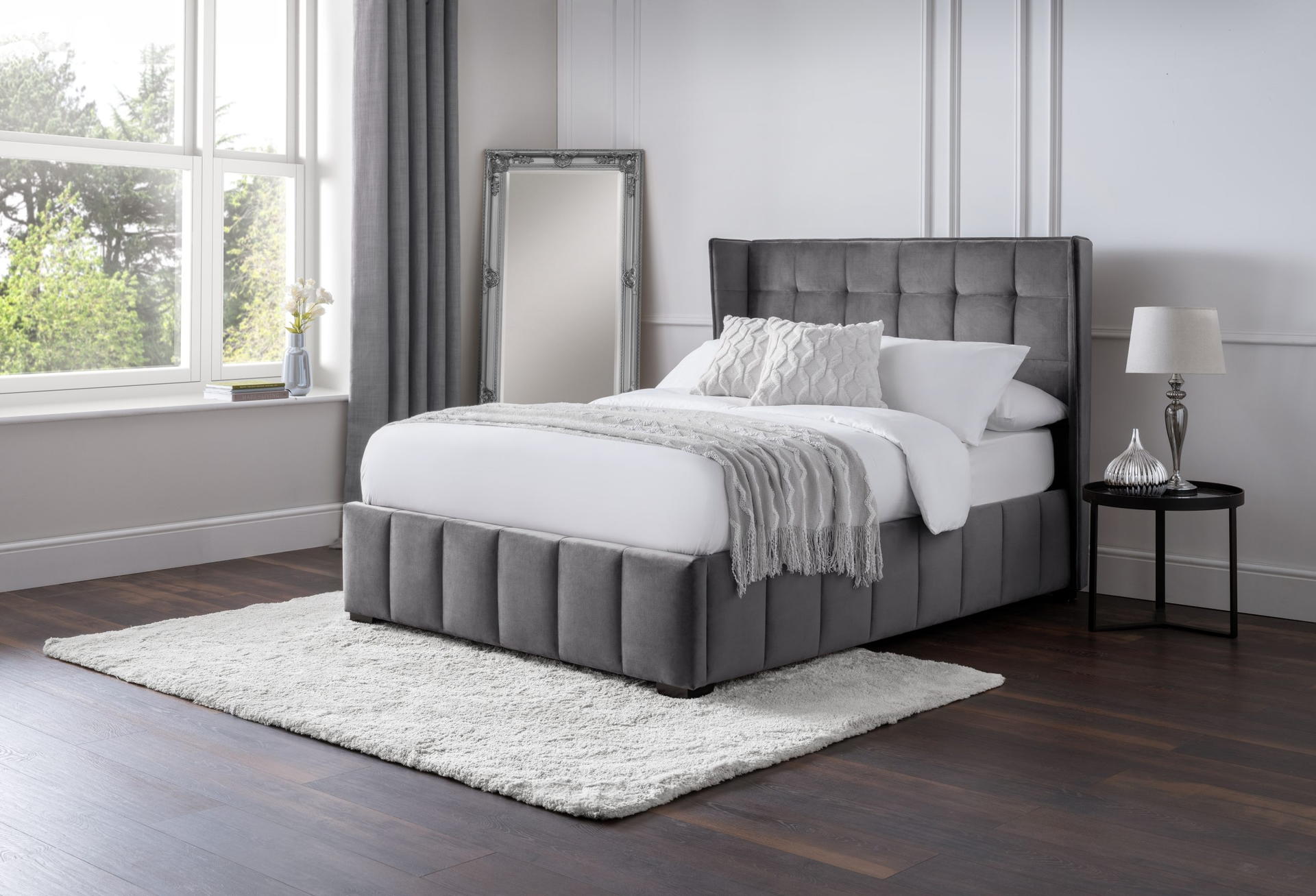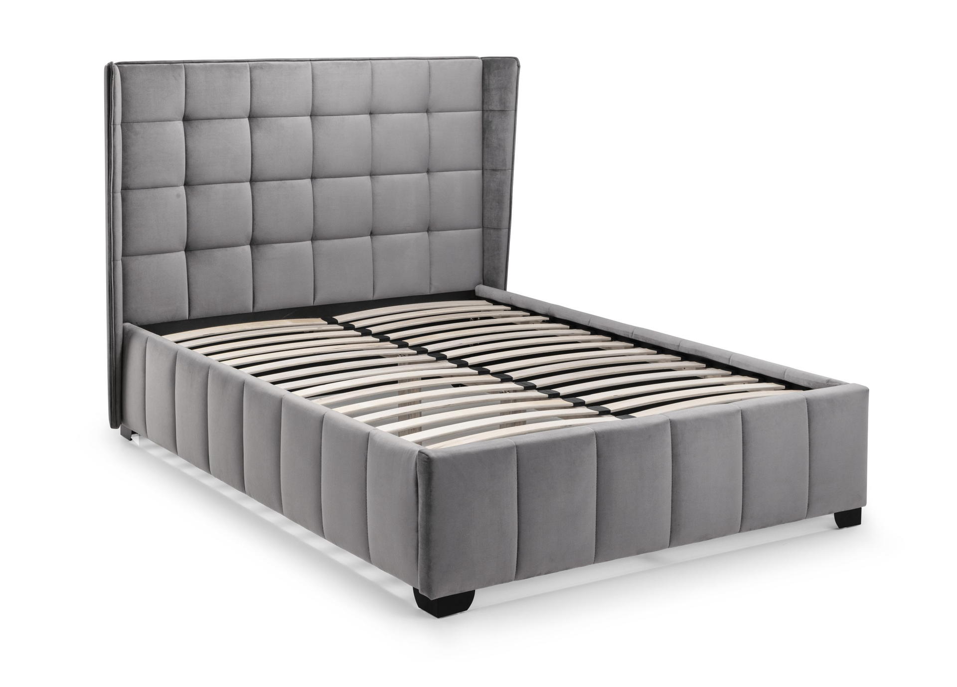Indulge in timeless elegance with the Gatsby Bed, a tribute to refined style and grace. The centerpiece of this exquisite bed is its beautiful winged headboard, adding a touch of sophistication to your bedroom sanctuary. Finished in a sumptuous light grey velvet, the bed exudes luxury, while the detailed headboard introduces adds a modern twist to its classic charm. Elevate your bedroom decor to new heights, where every detail speaks of opulence and enduring allure.