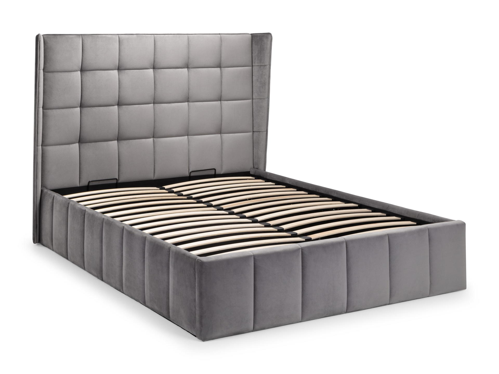Step into the realm of timeless elegance with the Gatsby Ottoman Bed, a perfect fusion of inspired design and functional luxury. The beautiful winged headboard brings a touch of sophistication to your bedroom, while the pull-up ottoman space beneath enhances your storage solutions with both convenience and refinement. Finished in a stunning grey velvet, the bed exudes an aura of luxury and comfort. The detailed headboard adds a distinctive and stylish touch, creating a bedroom centerpiece that seamlessly blends opulence with practicality.
