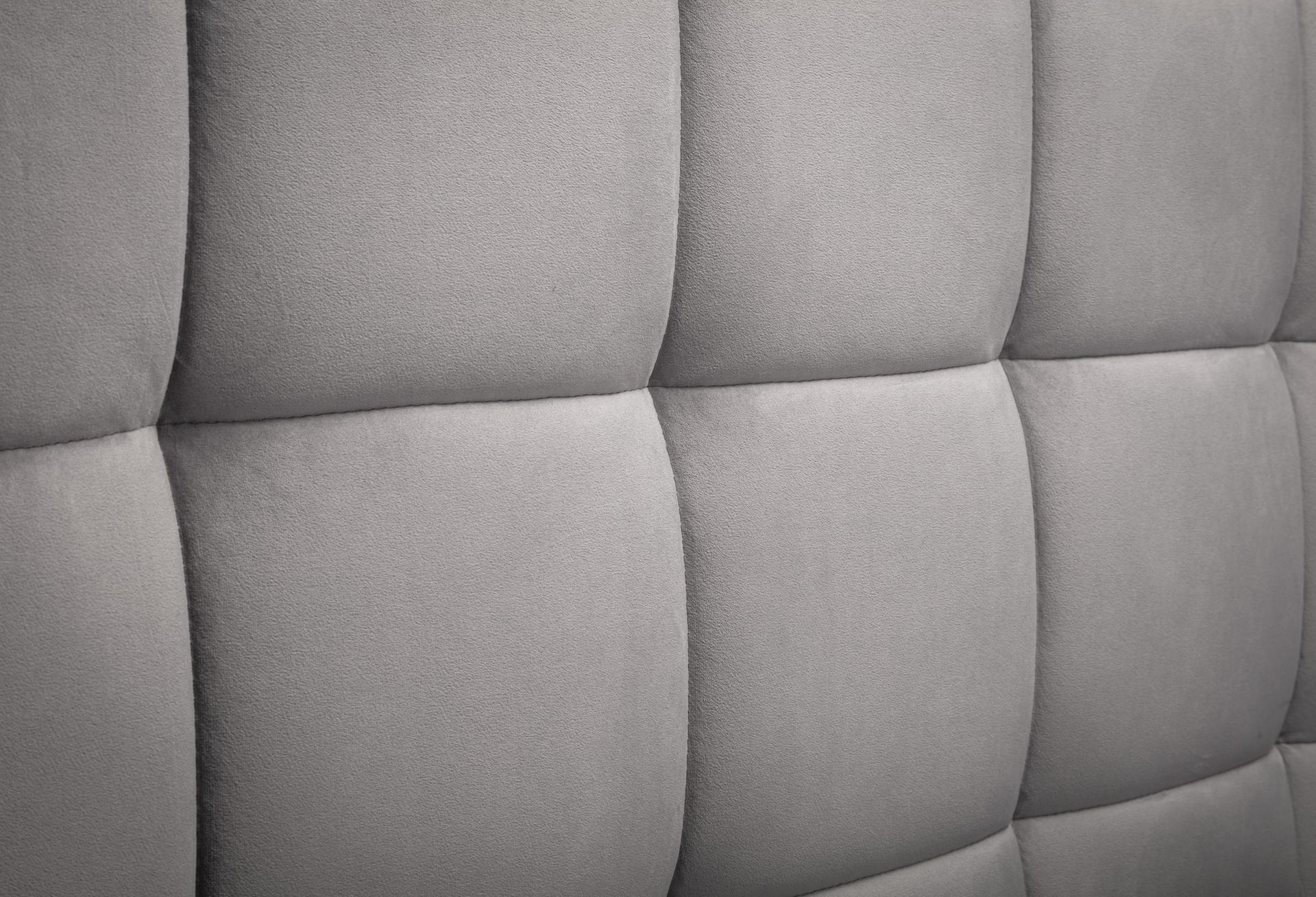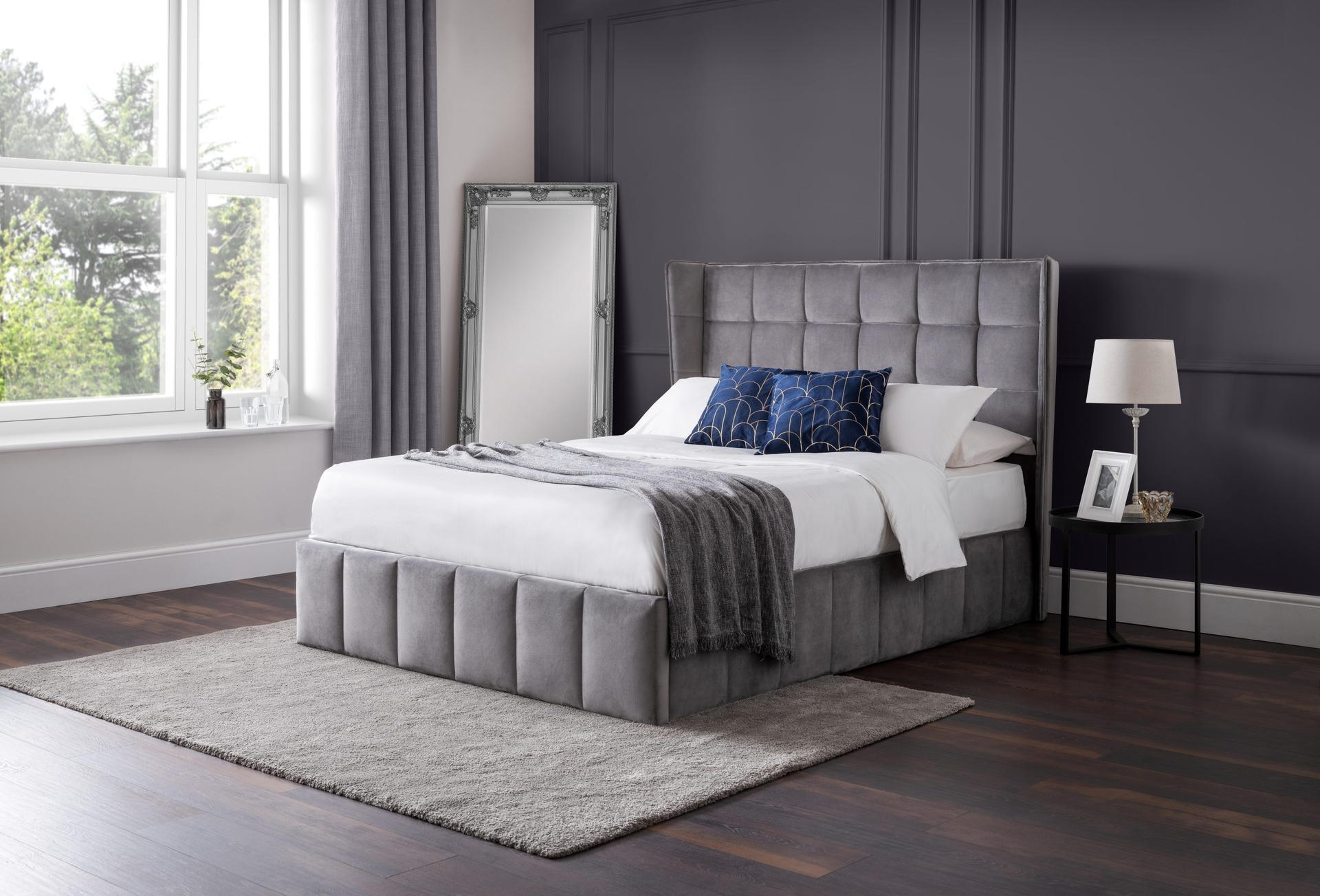 Finished in stunning light grey velvet for a luxurious and comfortable bedroom haven.