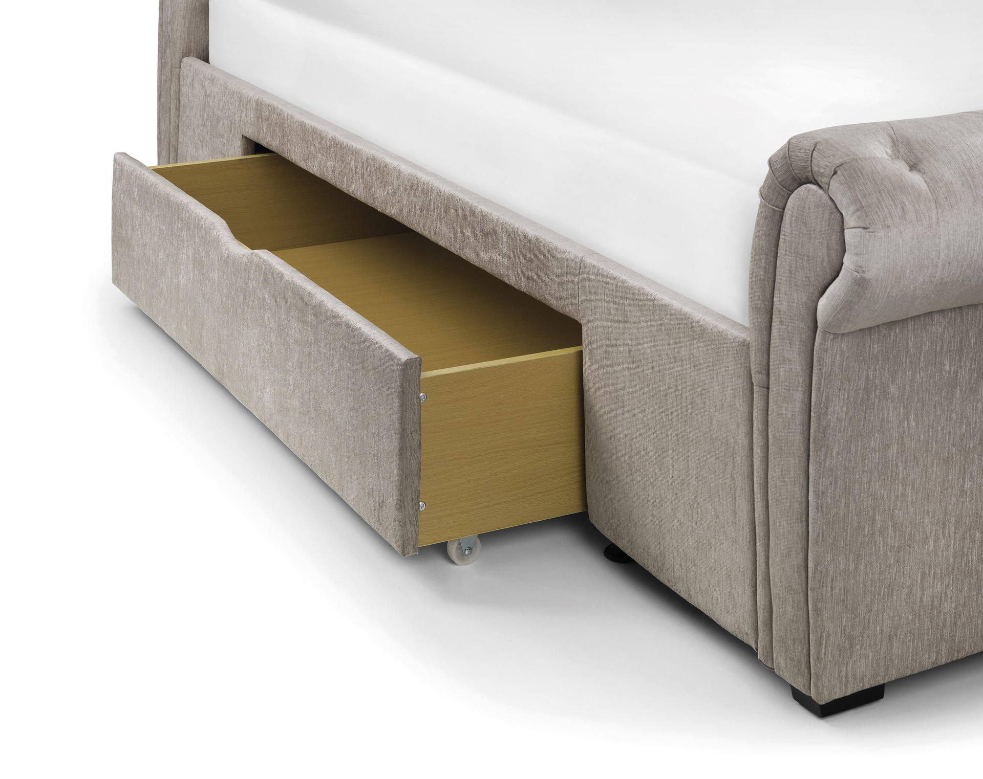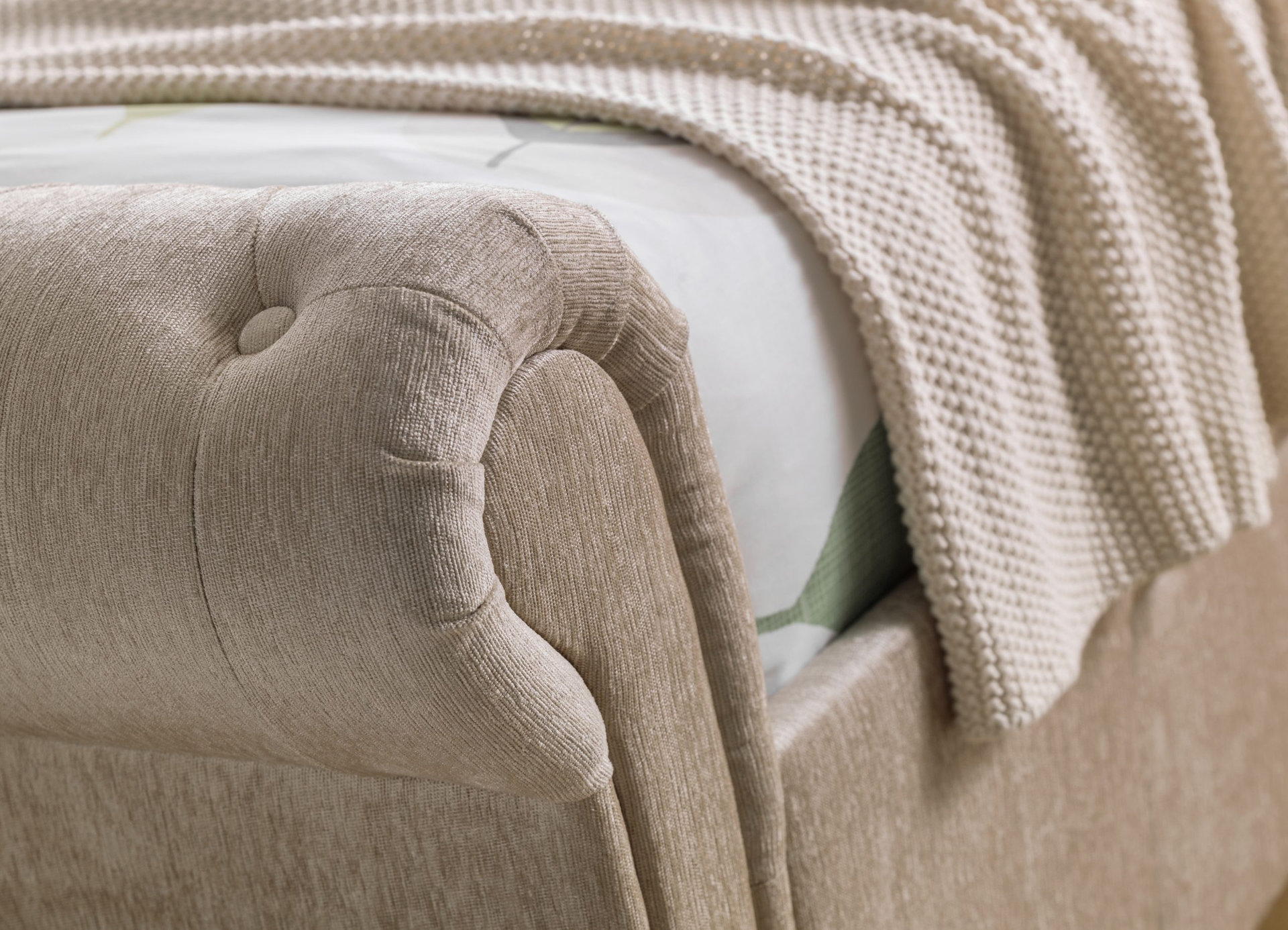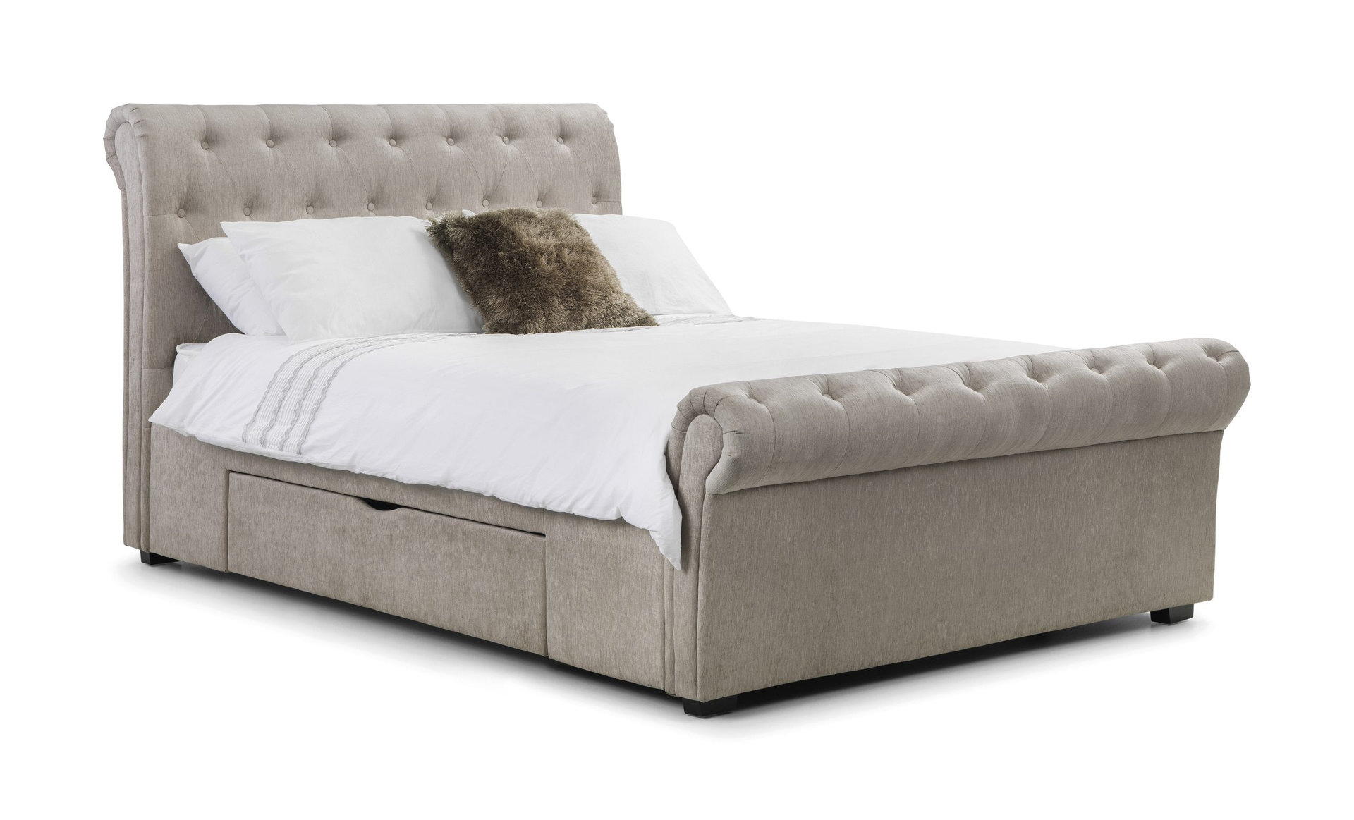 Ravello is a stunning fabric bed in a classic scroll design, finished in a lovely soft touch mink chenille. It is a substantial bed characterised by exquisitely finished, sumptuous upholstery and a striking deep buttoned, high headboard with matching footboard. Two large under bed drawers add phenomenal amount of storage space. Ravello adds a wow factor to any bedroom and is a perfect match for traditional and contemporary interiors alike. A sprung slatted base ensures extra comfort and prolonged mattress life.