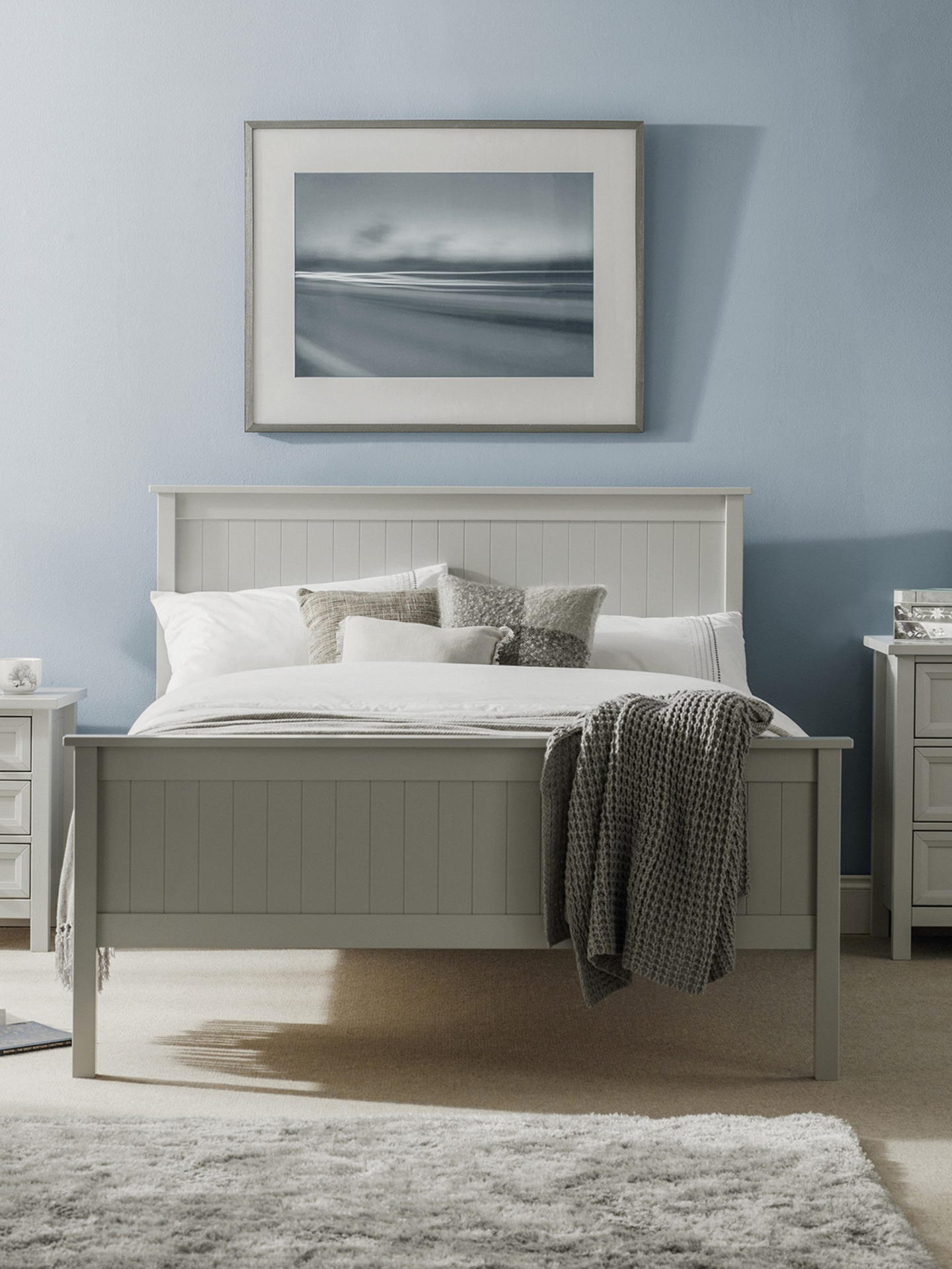 An elegant and simple New England style bed whose characteristic panelling is beautifully finished in an exquisite dove grey lacquer to create a soothing and refined aesthetic with timeless appeal. A solid slatted base ensures supreme comfort and prolonged mattress life.