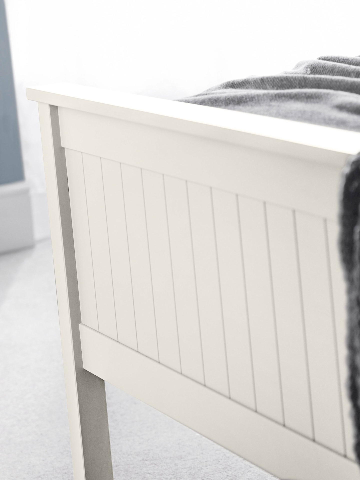 An elegant and simple New England style bed whose characteristic panelling is beautifully finished in an exquisite surf white lacquer to create a soothing and refined aesthetic with timeless appeal. A solid slatted base ensures supreme comfort and prolonged mattress life.
