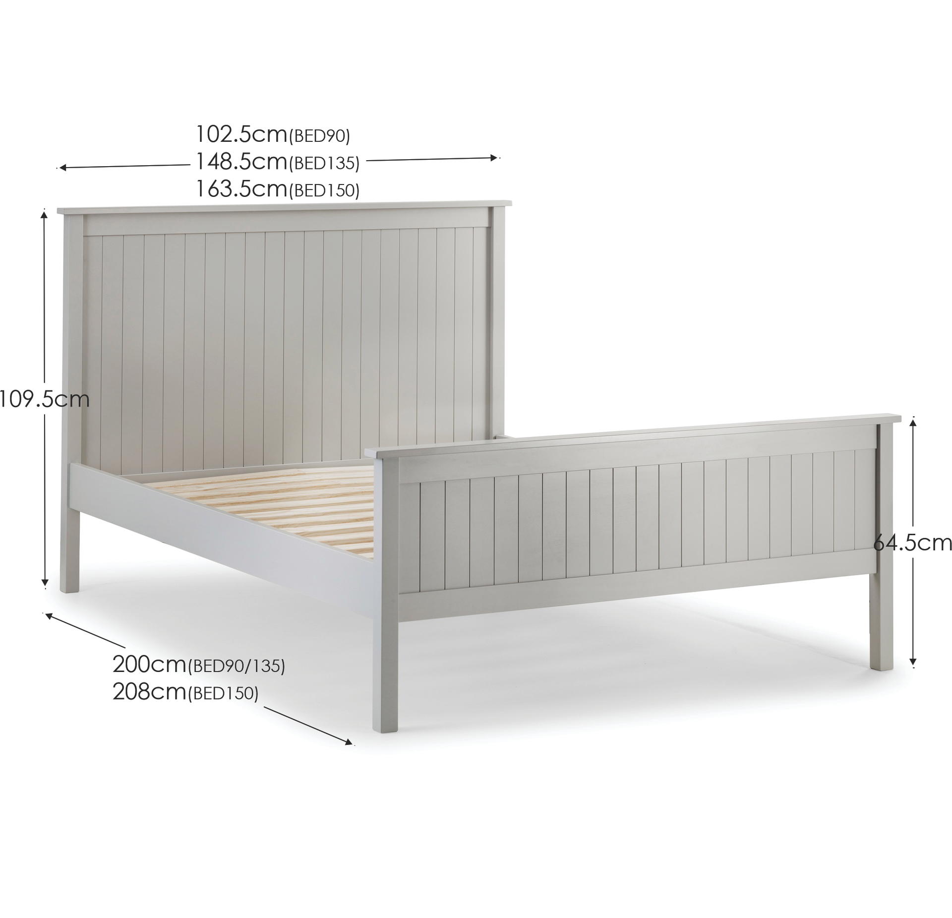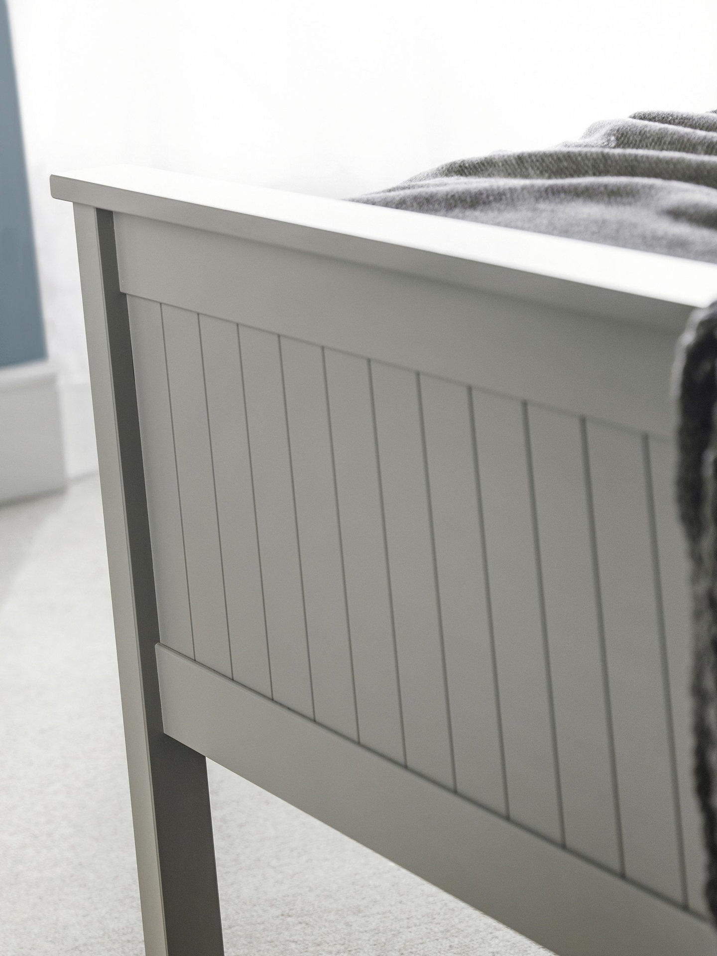 An elegant and simple New England style bed whose characteristic panelling is beautifully finished in an exquisite dove grey lacquer to create a soothing and refined aesthetic with timeless appeal. A solid slatted base ensures supreme comfort and prolonged mattress life.