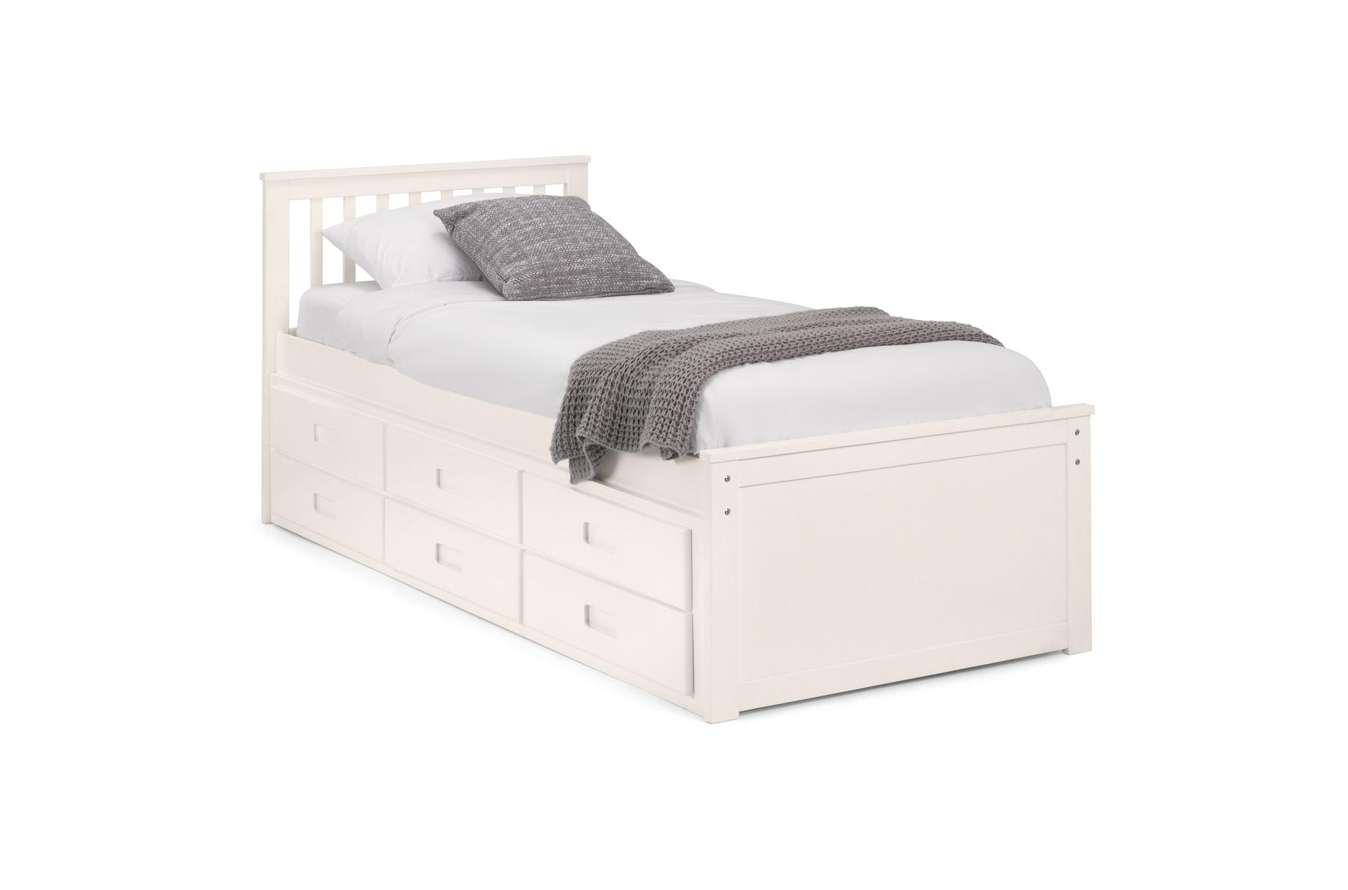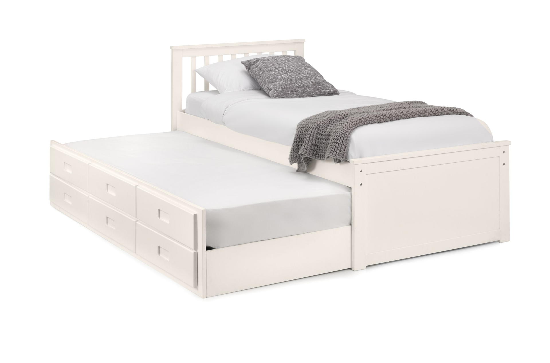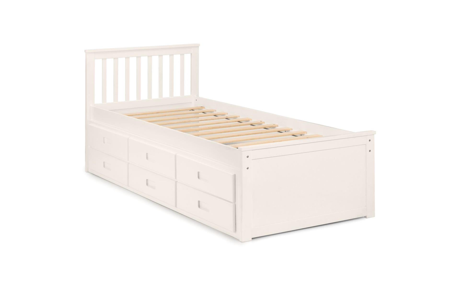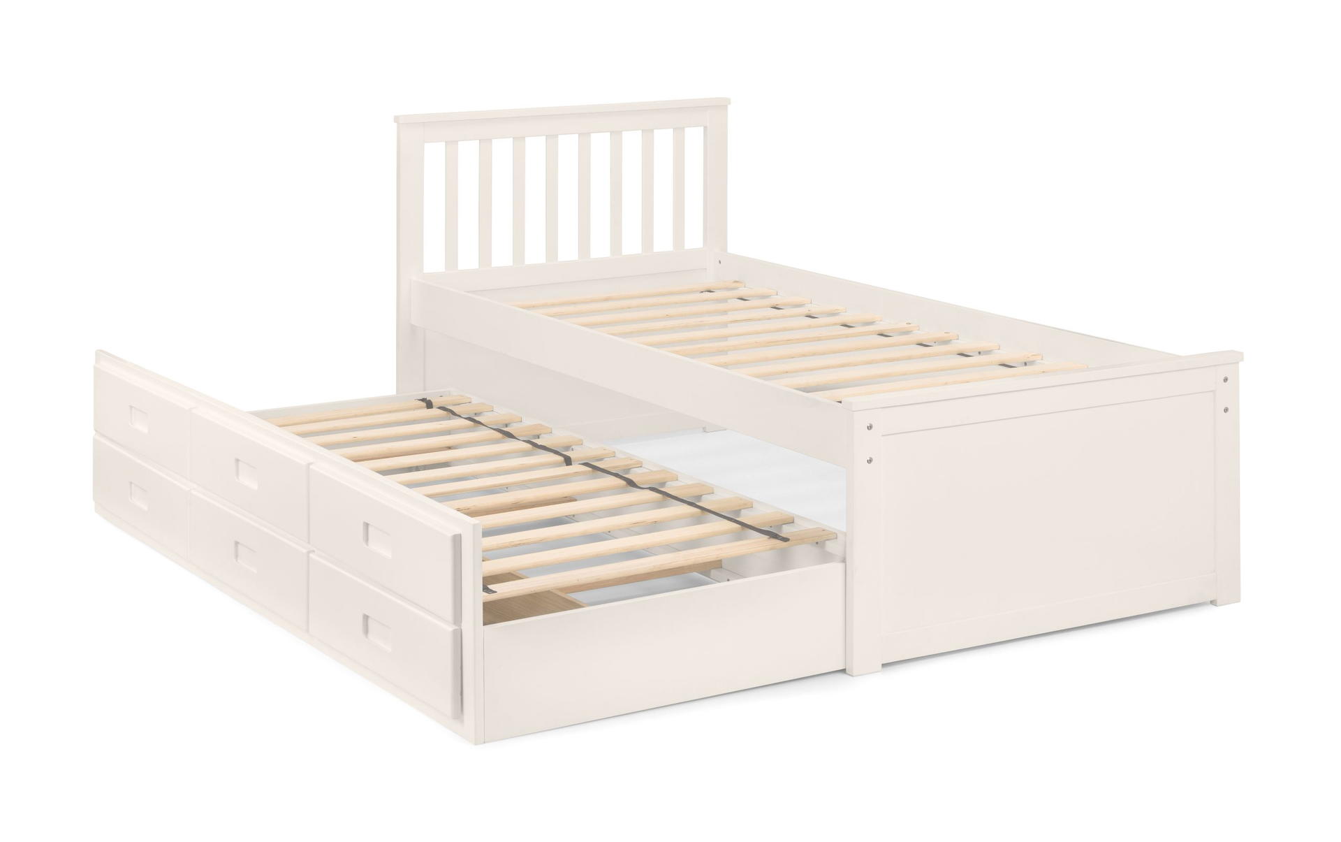 Finished in a crisp lacquer, the Maisie bed features a traditional slatted headboard. Providing sleeping space for two people, this bed includes a pull-out underbed and additional storage drawers, maximising the available floor space. Perfect for any children’s bedroom or guest room.