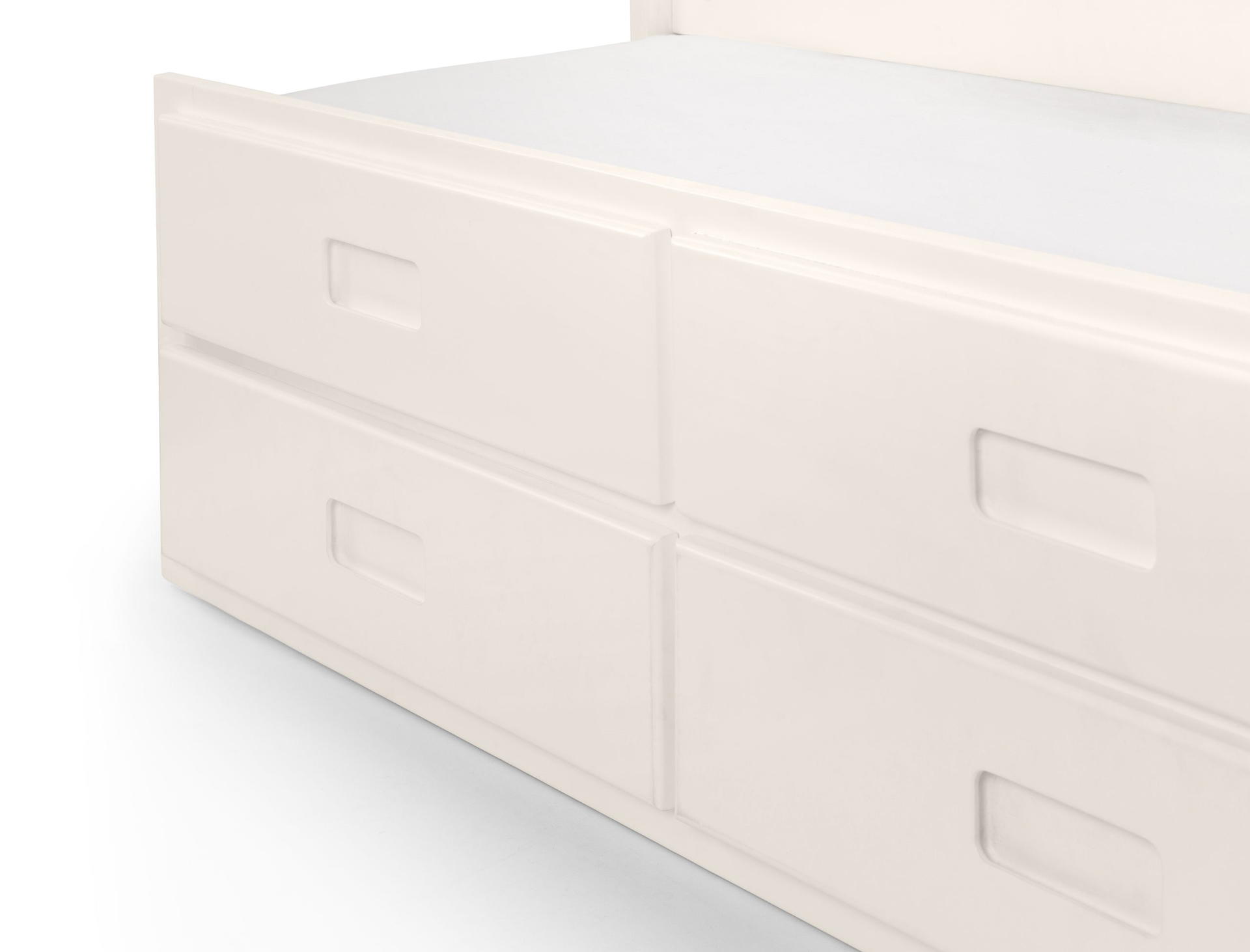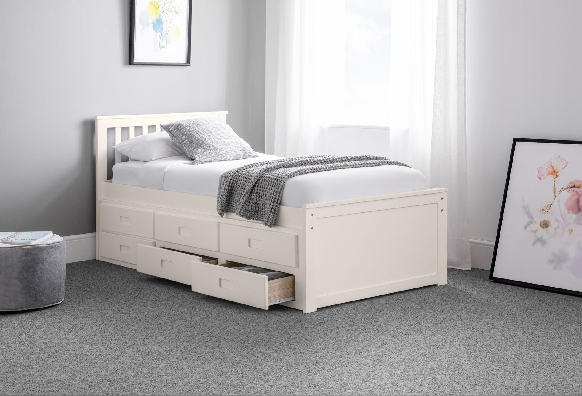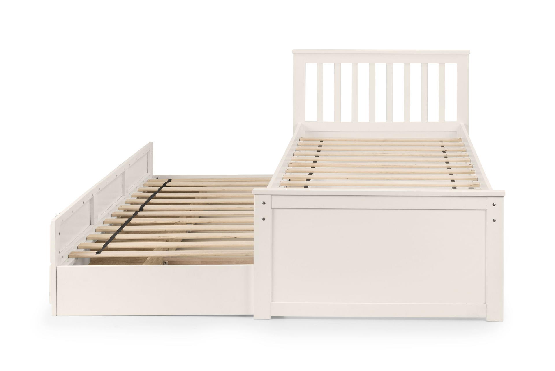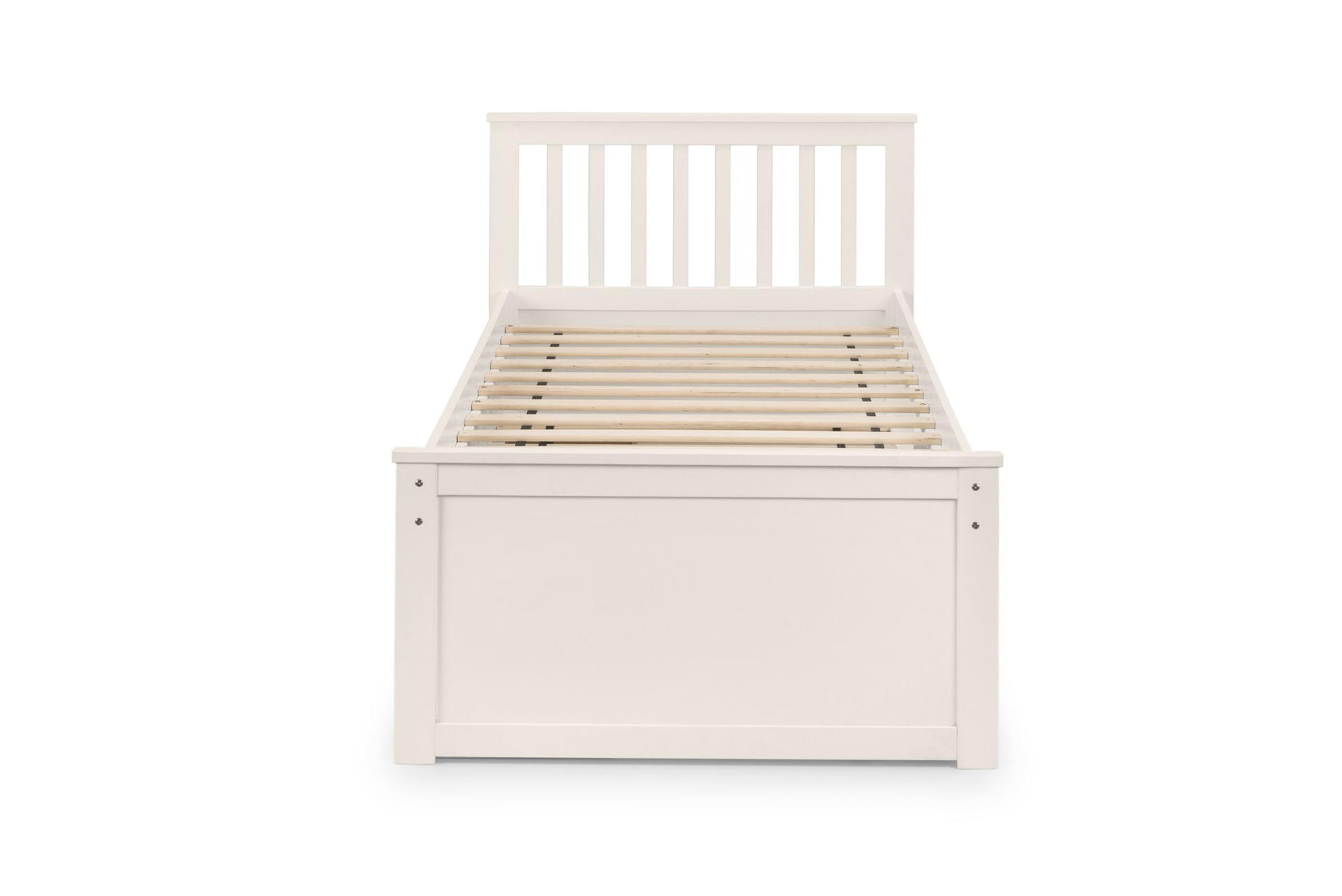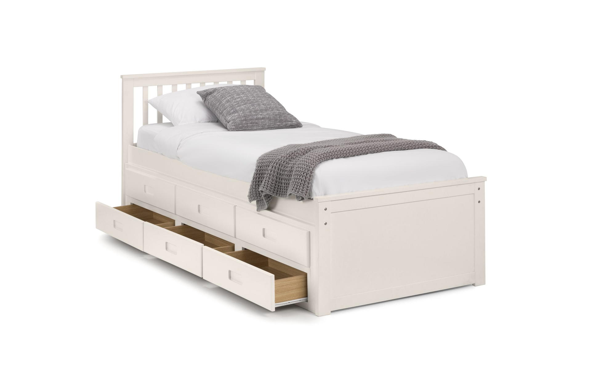 Finished in a crisp lacquer, the Maisie bed features a traditional slatted headboard. Providing sleeping space for two people, this bed includes a pull-out underbed and additional storage drawers, maximising the available floor space. Perfect for any children’s bedroom or guest room.