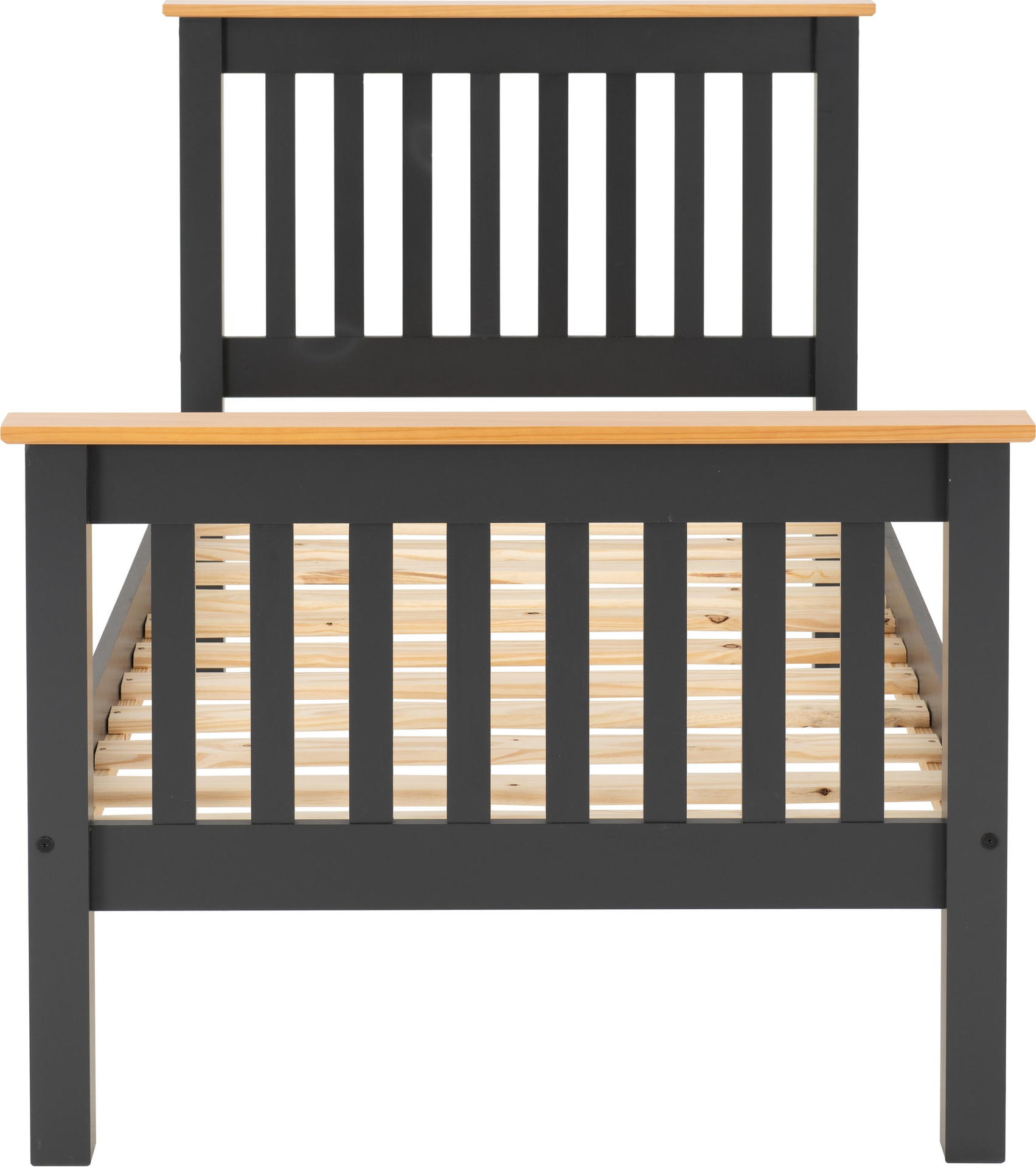 Solid wood construction waxed finish Solid slatted base- which allows air to circulate around your mattress Shaker-styled slatted headboard and high footboard. The Monaco High Foot End Bed Frame offers the best in modest yet stylish bedroom design. Utilising the functional and timeless Shaker style aesthetic allows for further emphasis to be placed on providing you supportive and comfortable place to sleep every night. This strong bed frame is effortlessly effective in terms of both style and support.