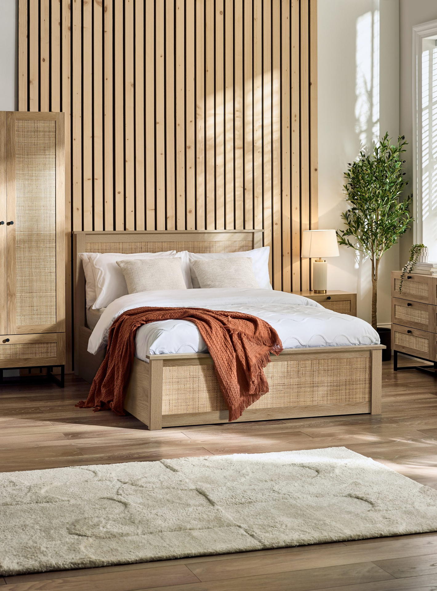 Stylish rattan headboard and footboard complement the contemporary minimalist aesthetic.