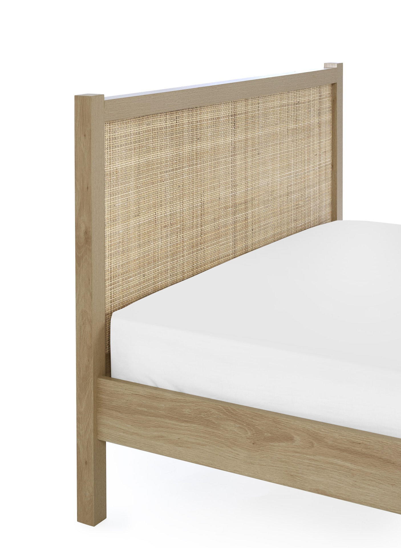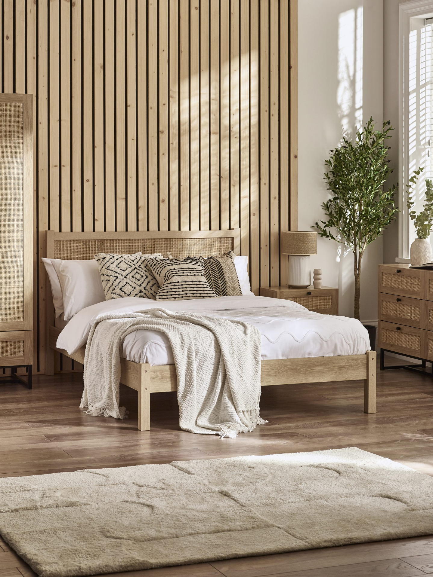 Transform your bedroom into a haven of style with the Padstow Rattan Bed in Oak. This exquisite bed features an ornate weaved rattan headboard that brings a hint of retro charm and modern elegance to your space. The bohemian-inspired design seamlessly blends timeless aesthetics with contemporary flair, while the sturdy construction ensures reliable support for a restful night’s sleep. The rich oak finish adds warmth and character, creating a cosy yet sophisticated ambiance that enhances any room. Mattress sold separately.