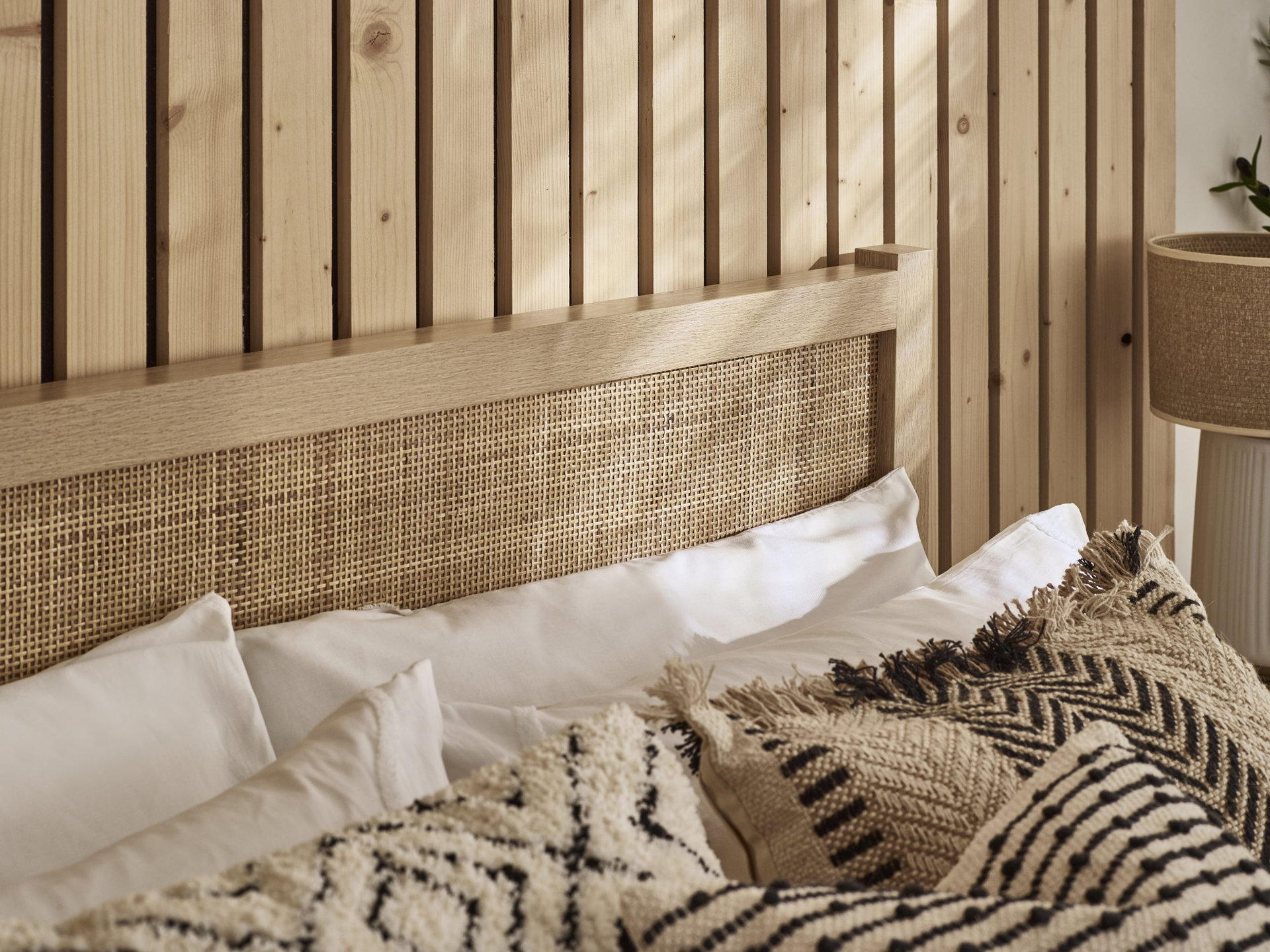 Rattan headboard design adds a touch of retro charm to your bedroom.