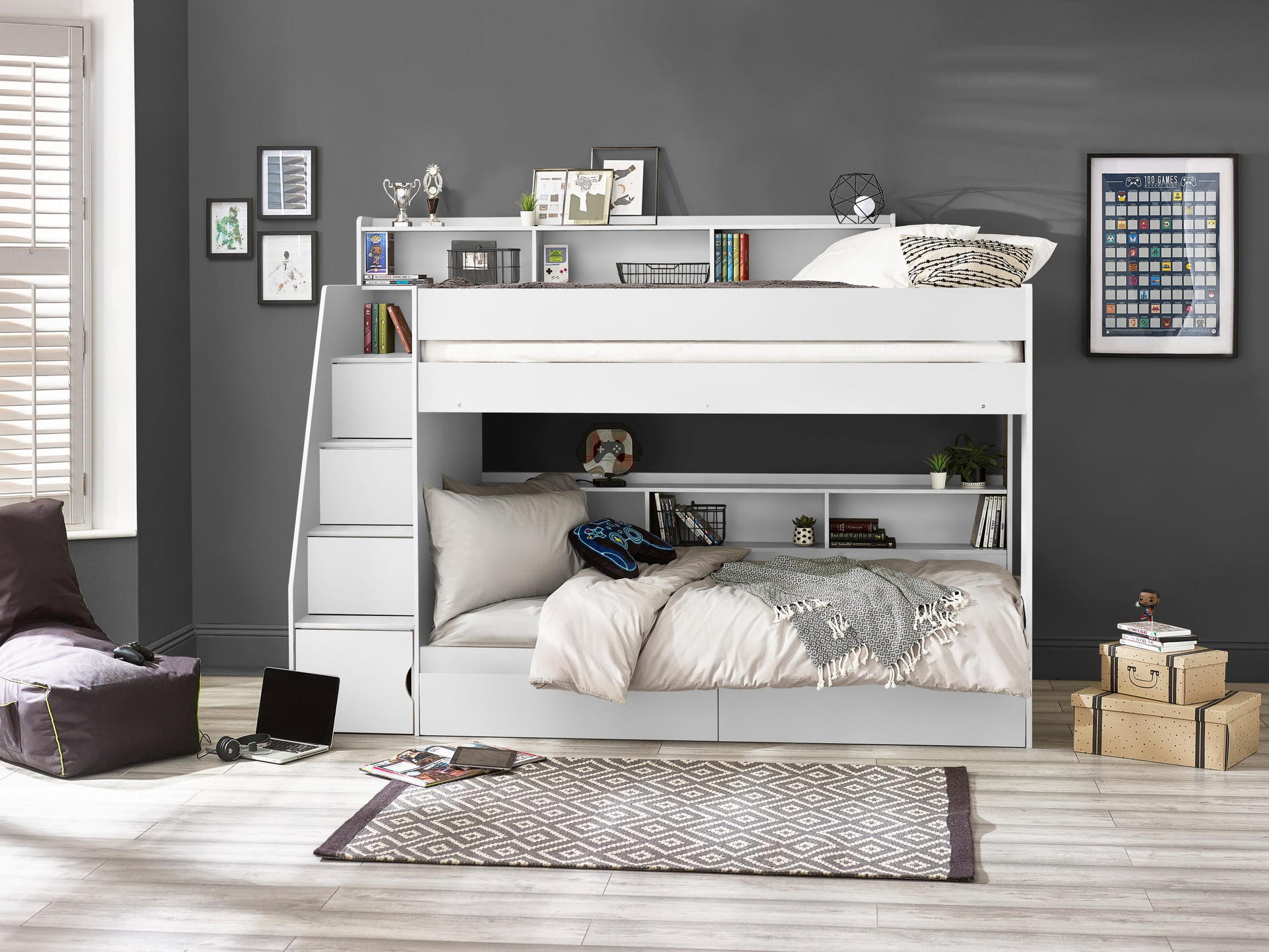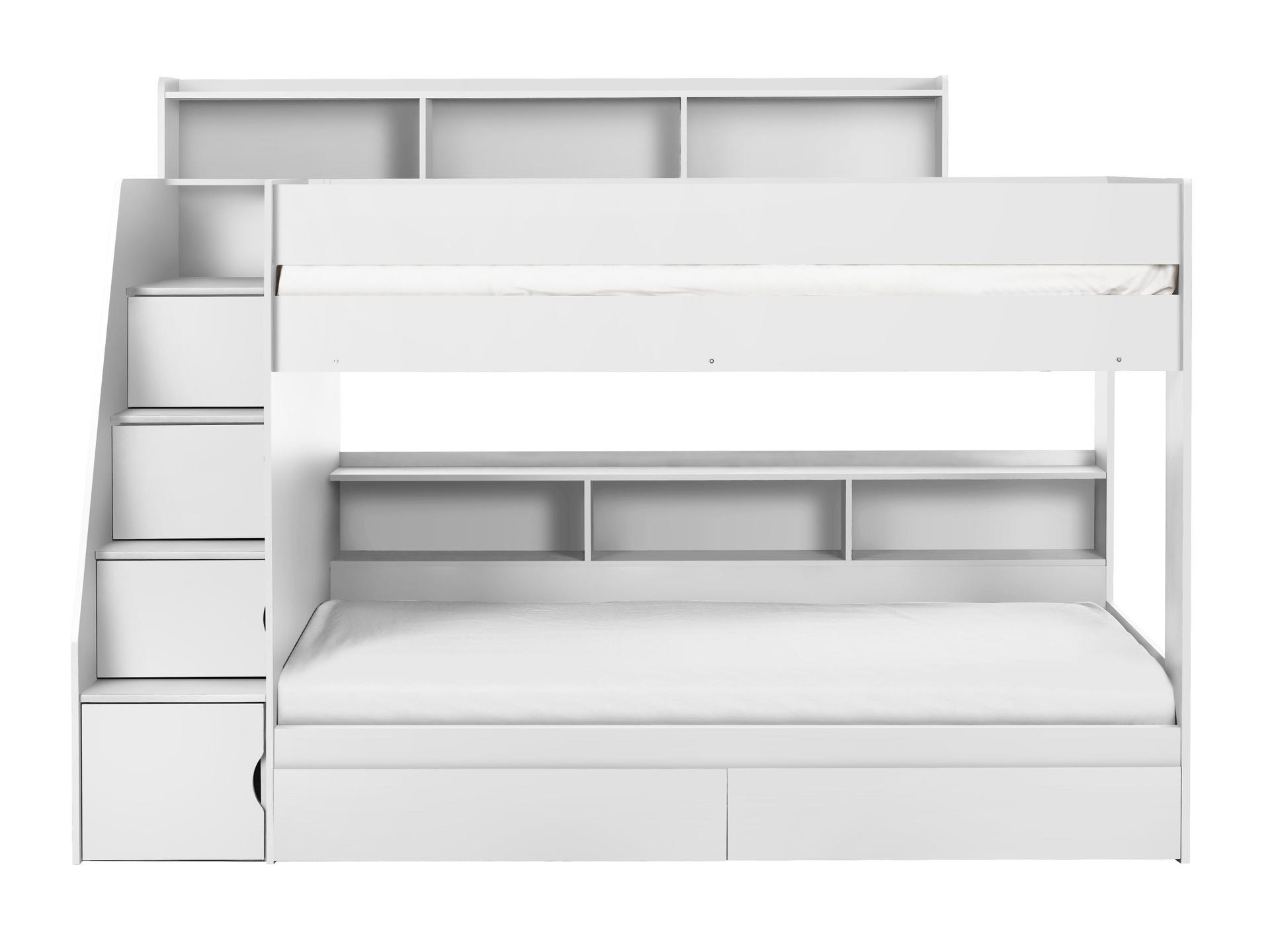 Camelot Staircase Bunk is a lacquered bunk bed created with innovative and functional construction. With spacious storage in the stairs, bottom bunk, top bunk and additional storage drawers at the bottom of the bunk – you’ll never be short on space! Finished in an easily wipeable all white, the Camelot keeps your child’s room looking clean and fresh with minimal upkeep, and will suit any decor style.
