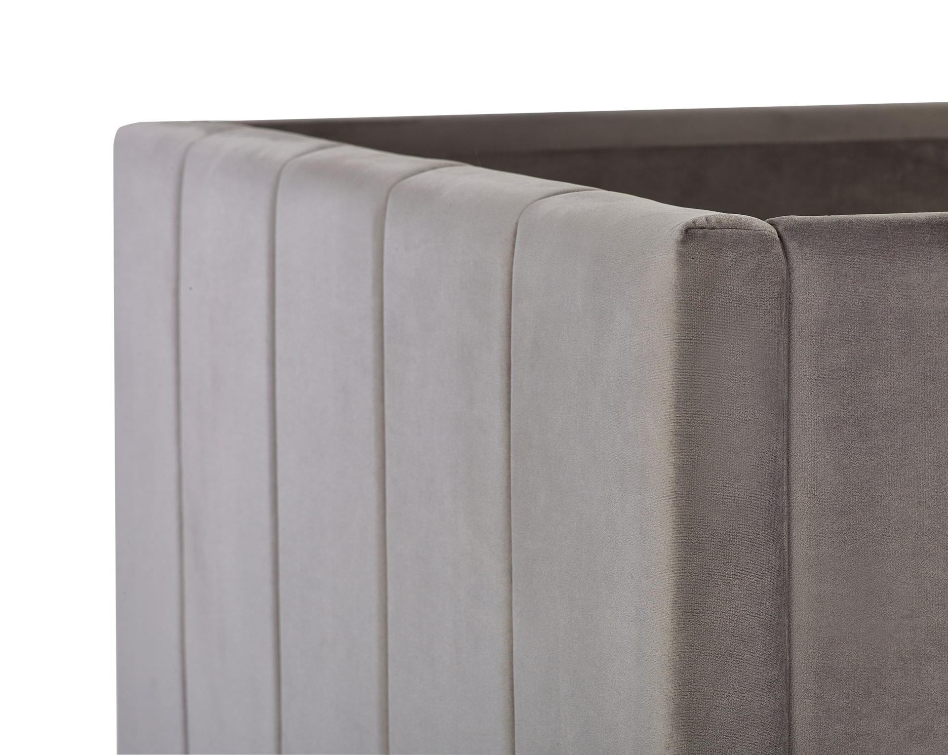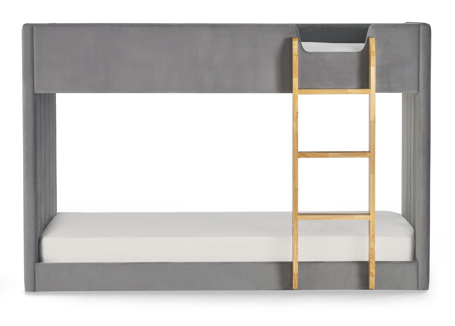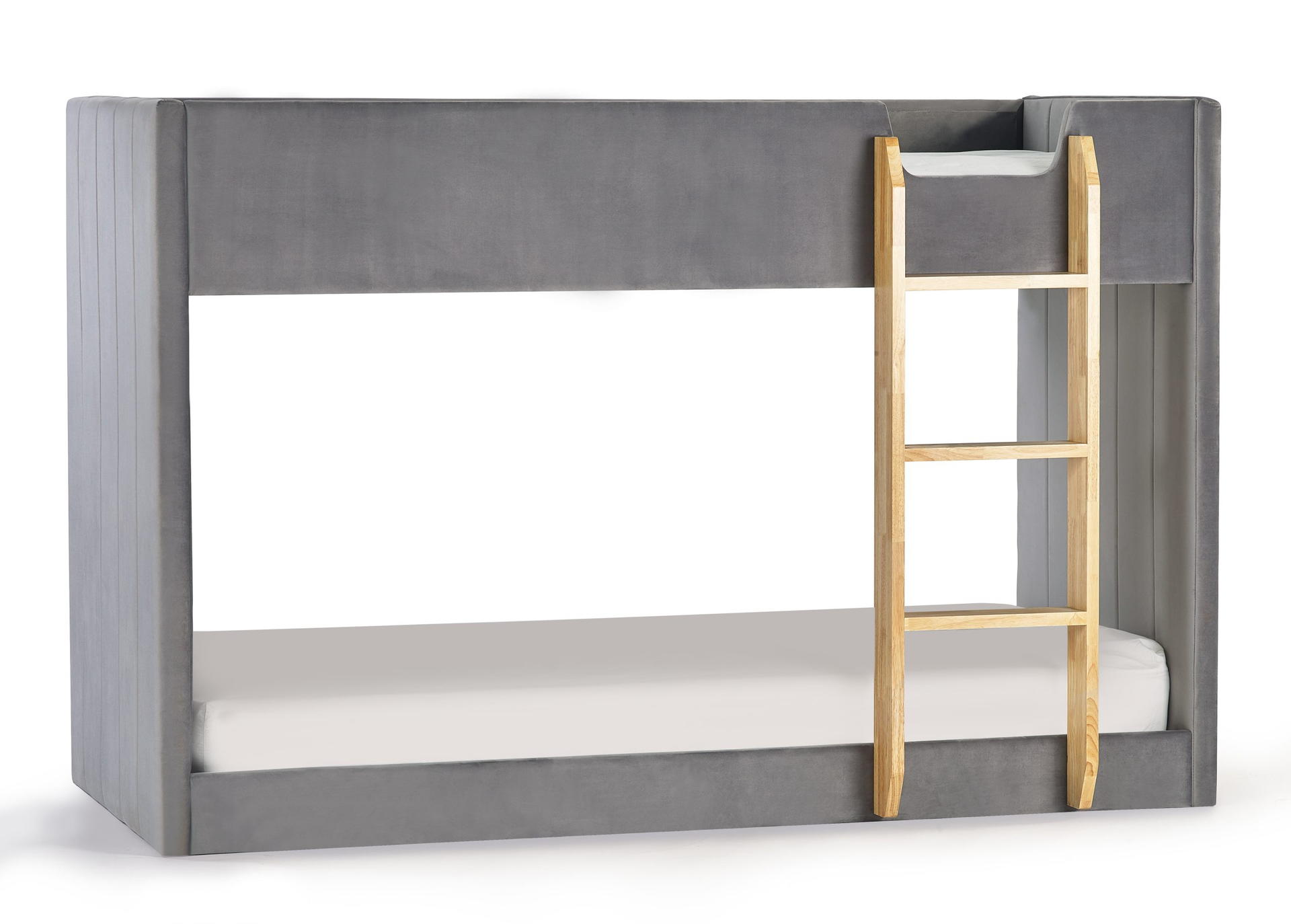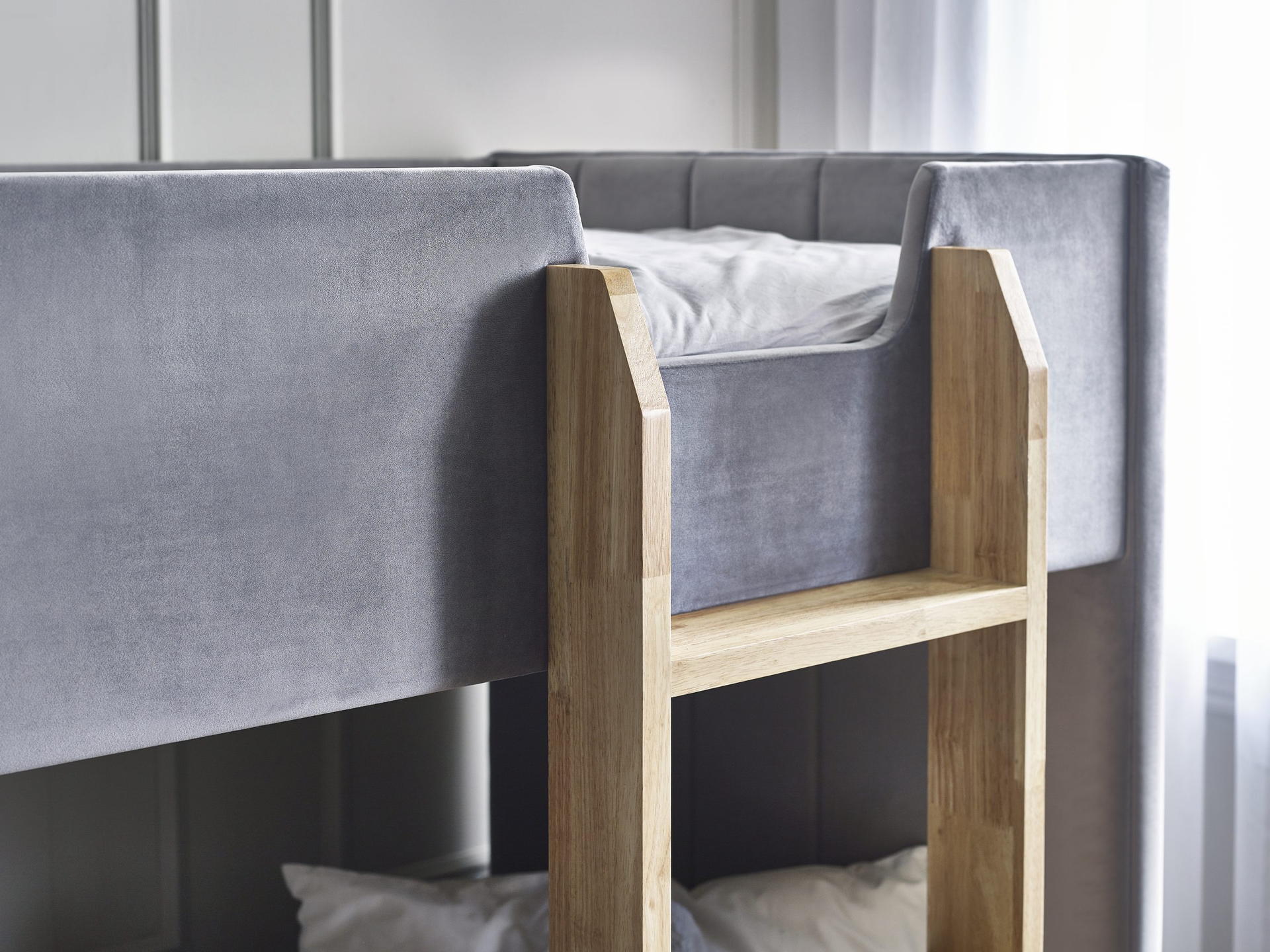 Wrapped in grey velvet, this bunk exudes a soft and inviting charm.