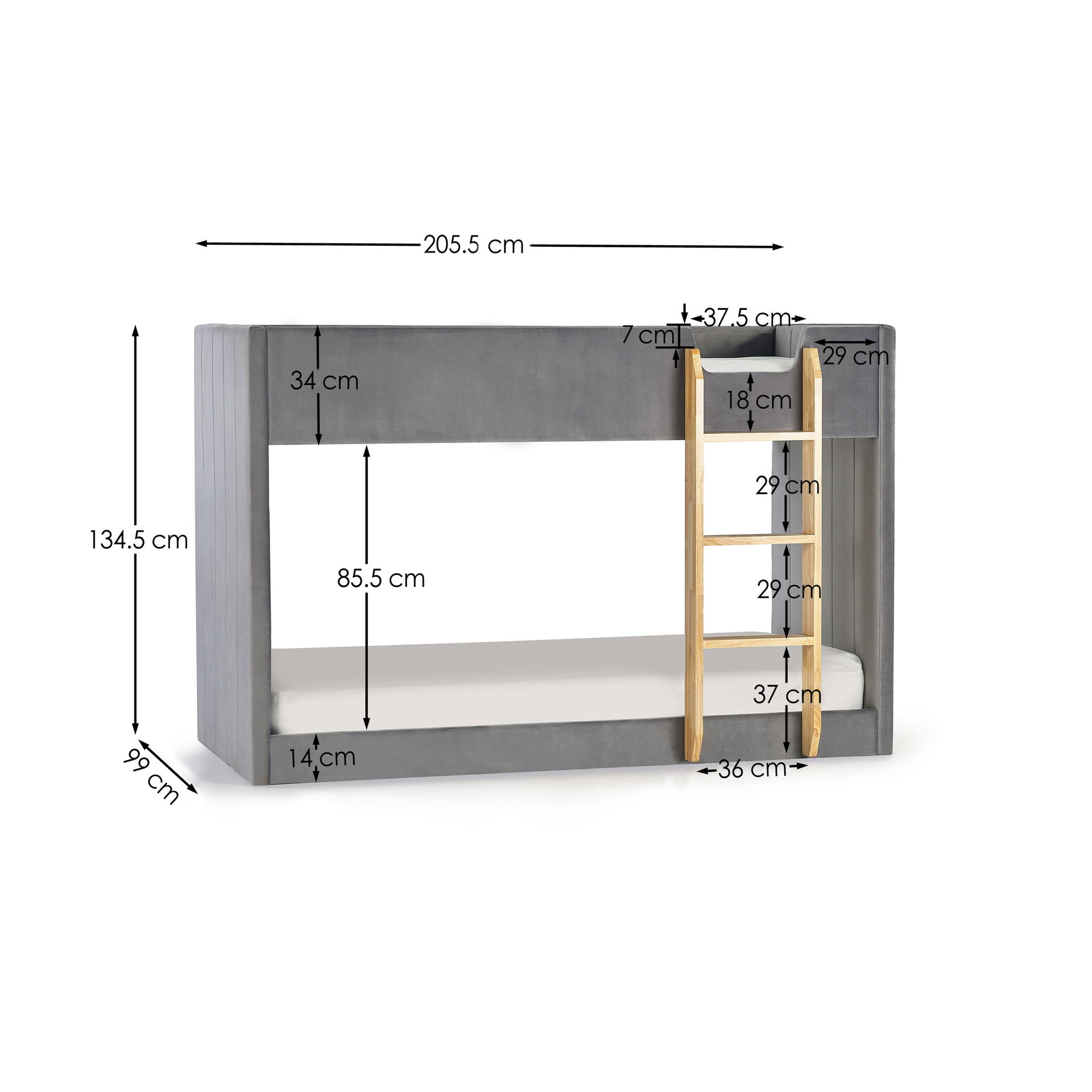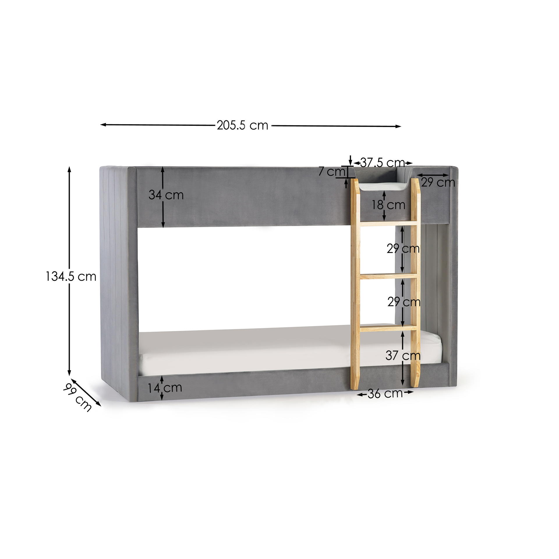 The Daytona Bunk is a dreamy haven for your little ones, meticulously crafted to infuse their space with comfort and style. Wrapped in luxurious grey velvet, this bunk exudes a soft and inviting charm. The woodgrain 3-step ladder provides easy access to the top bunk, ensuring safety and convenience for your youngsters. The paneled effect on both the front and back adds a touch of sophistication, creating a cosy cocoon for bedtime stories and sweet dreams.