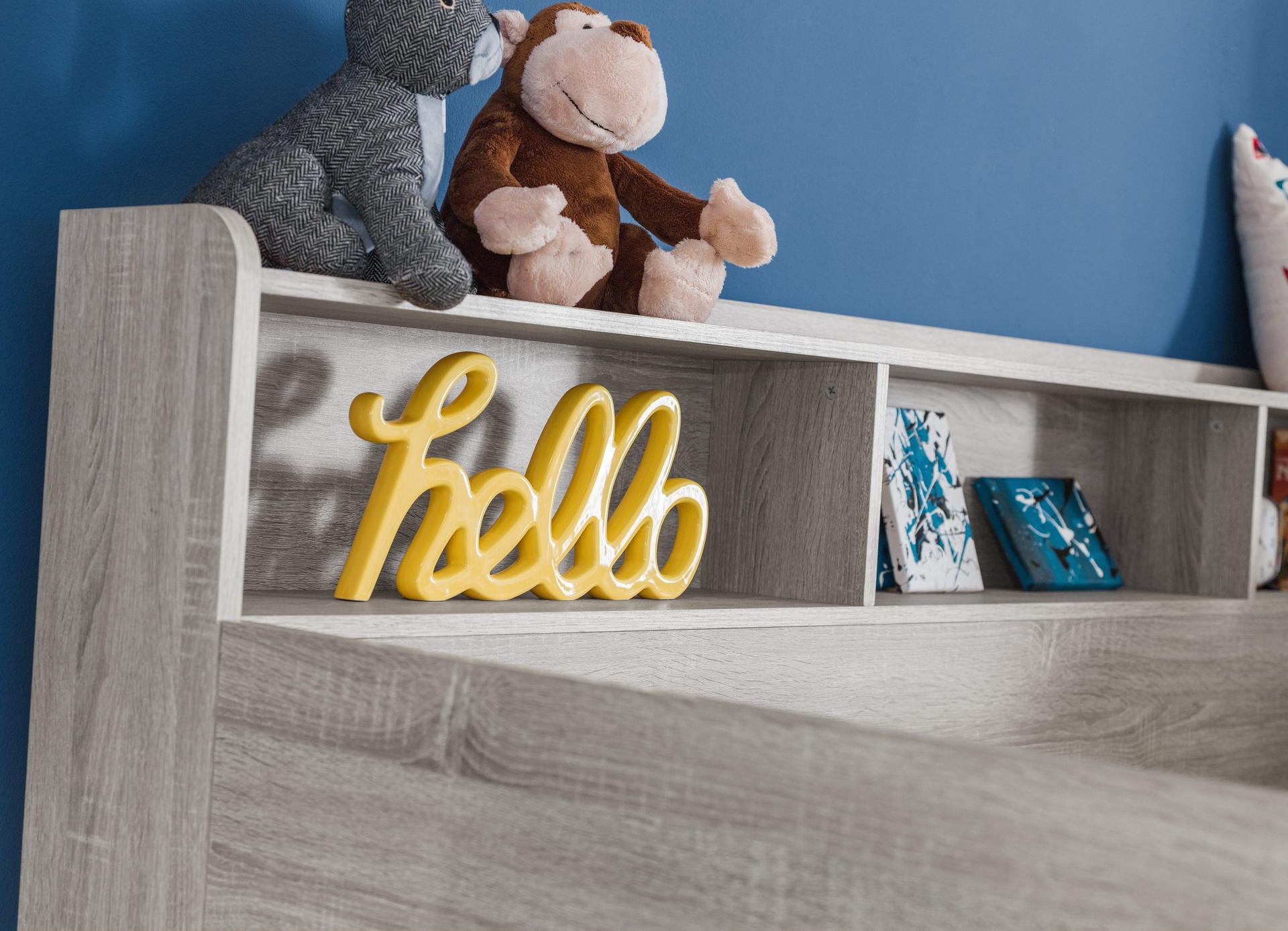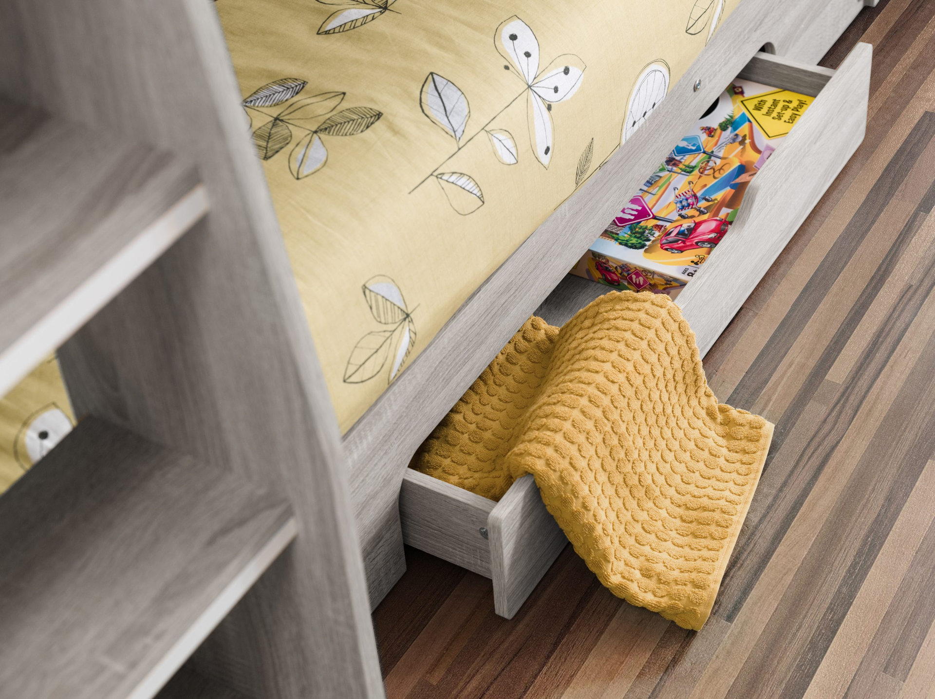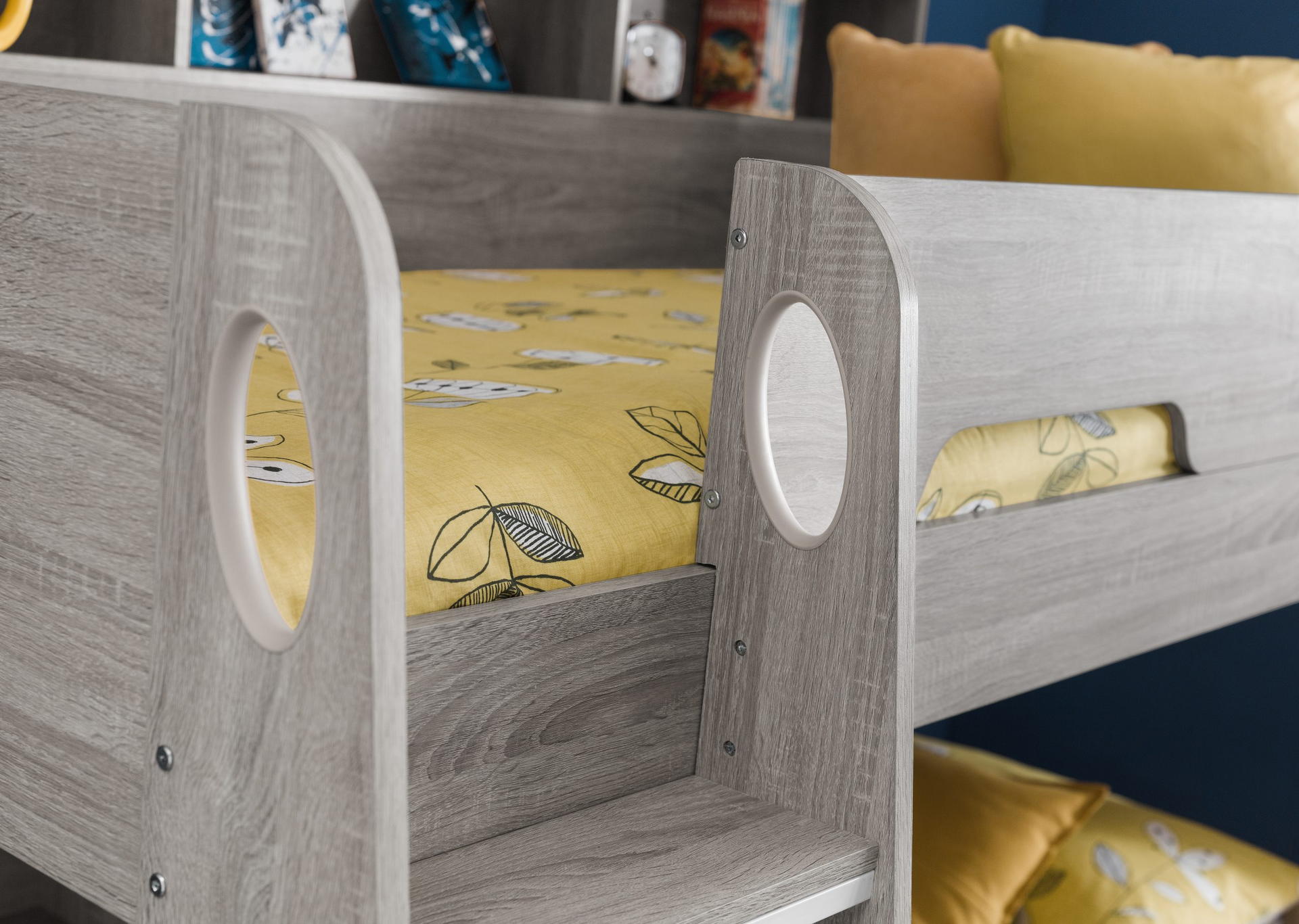 Orion is a contemporary, innovative bunk bed presented in an on-trend Grey Oak finish. Orion combines style with great practicality and includes a handy pull-out drawer and extensive shelving for kids’ books and toys, with a subtle raised lip to prevent anything slipping down the back. The lower bunk is positioned close to the ground, making it ideal for smaller children, while the robust ladder features attractive cut-out handles and optional glow-in-the dark strips on the steps for added safety.