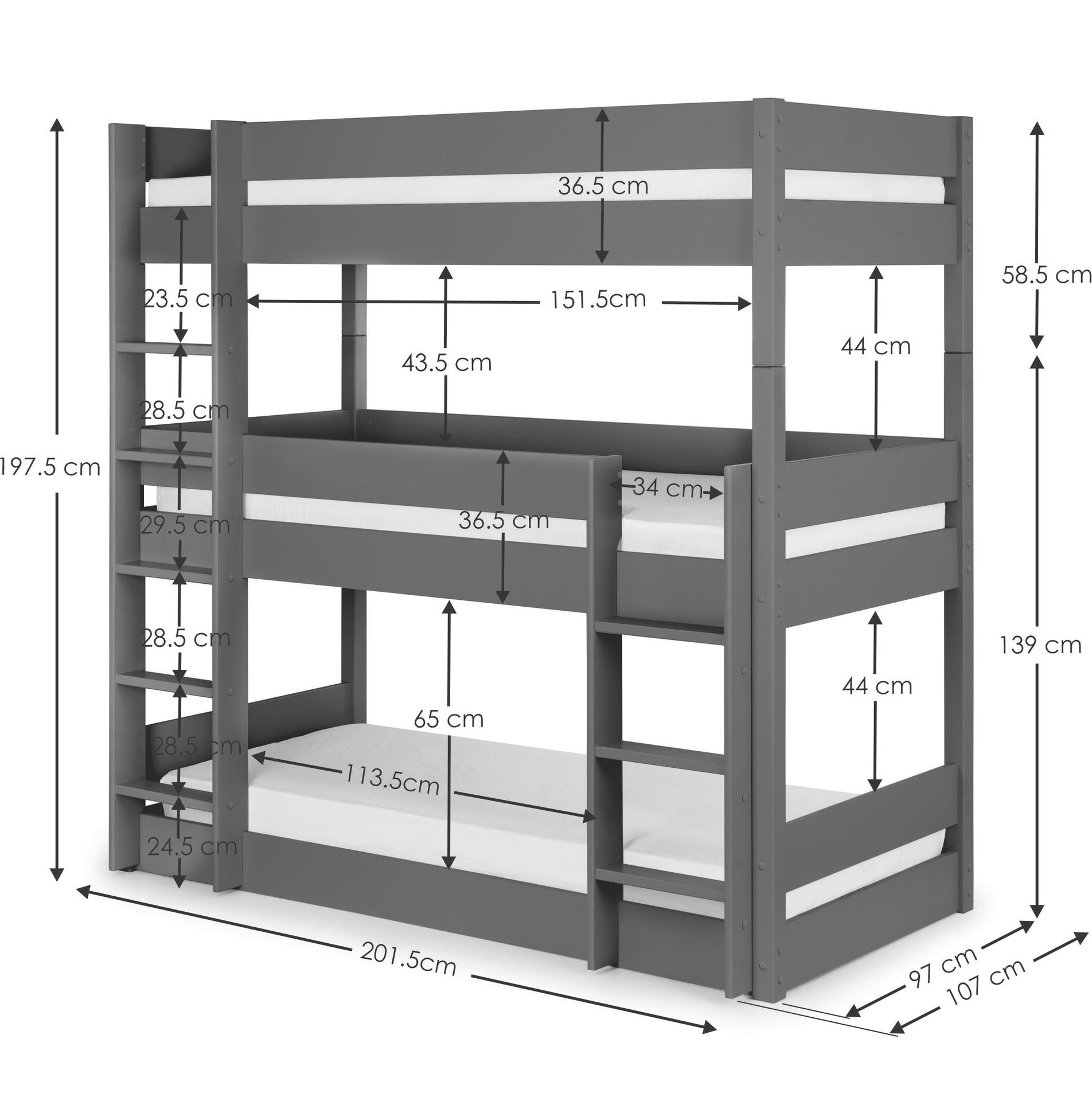 Accommodating 3 children whilst only using the space of one single bed, the Trio bunk bed is the perfect solution for those short on space in smaller bedrooms. Ideal for sleeping siblings, or regular sleepovers the durable Trio Bunk is finished in a stylish Surf anthracite, matching any bedroom decor. Crafted from solid pine and MDF, this safe and sturdy design is essential for maximising space.