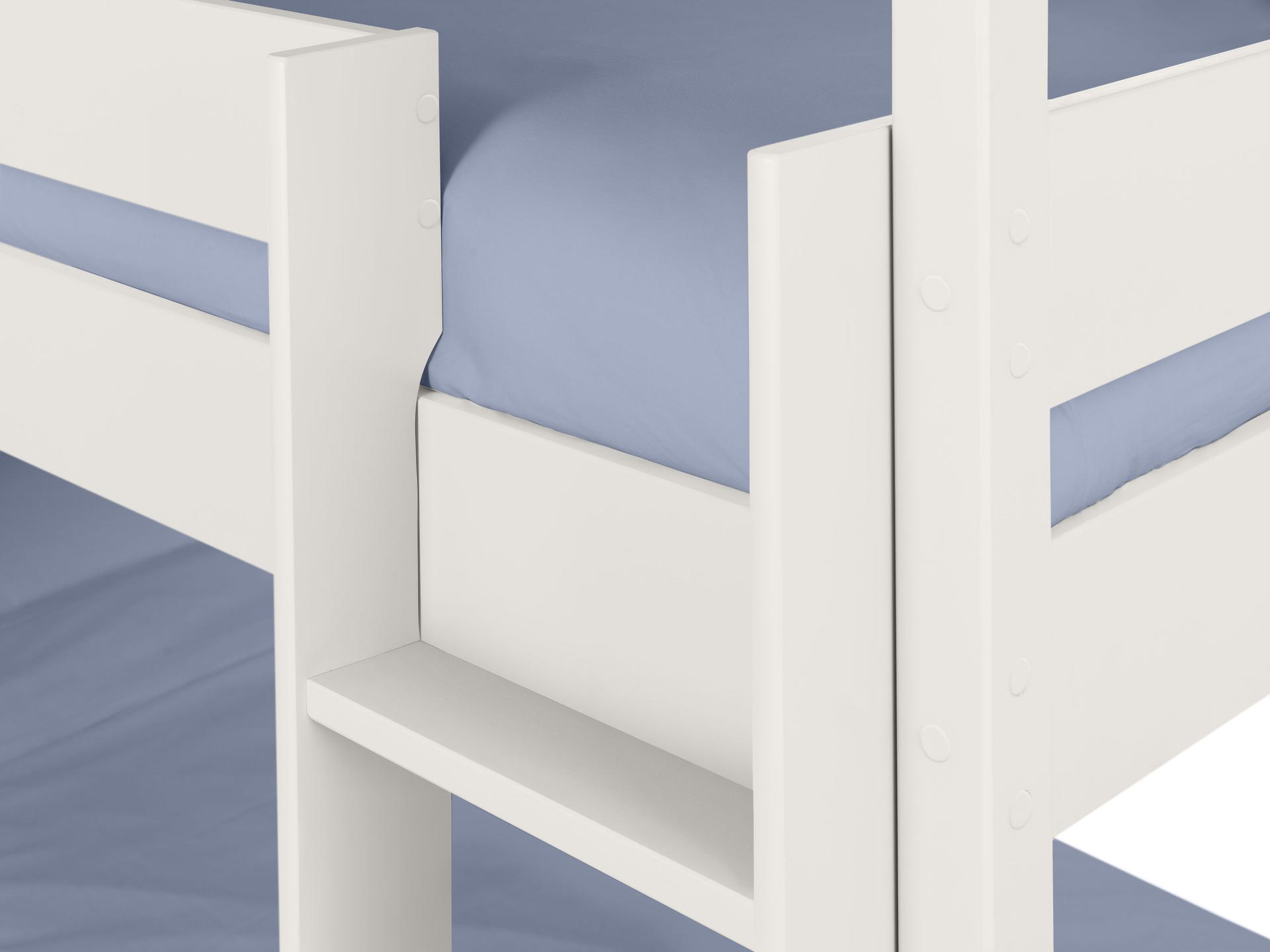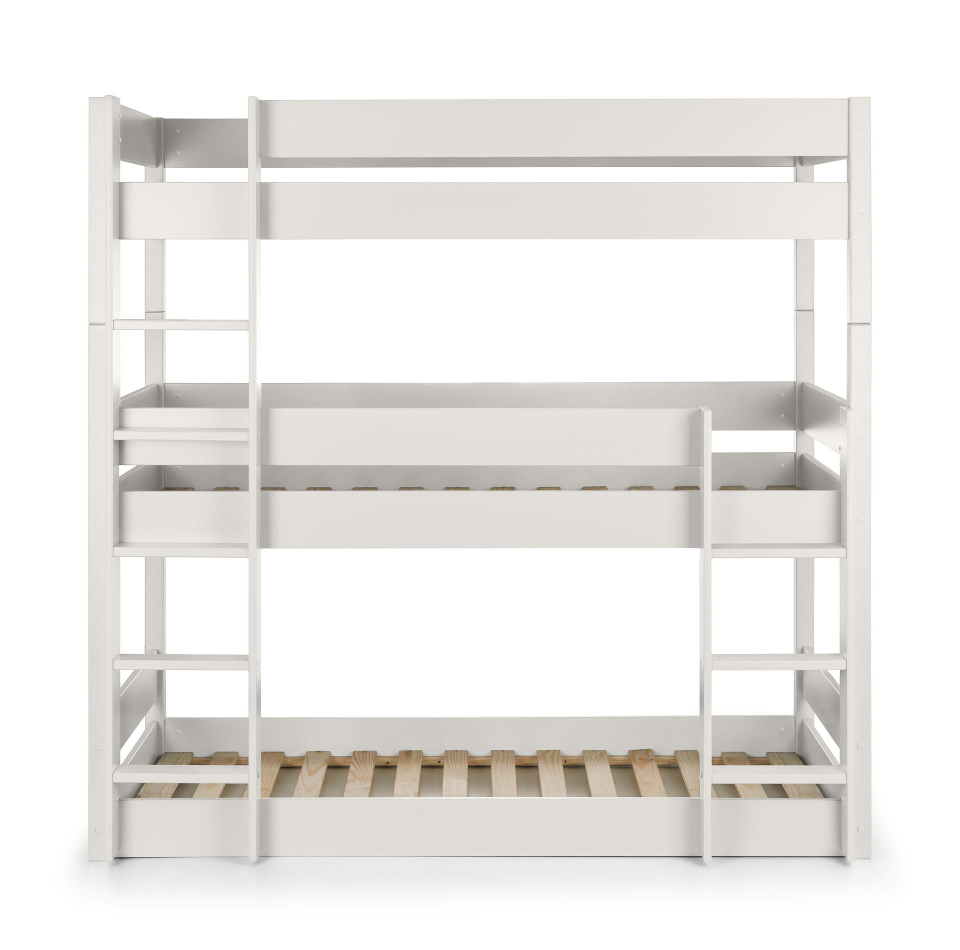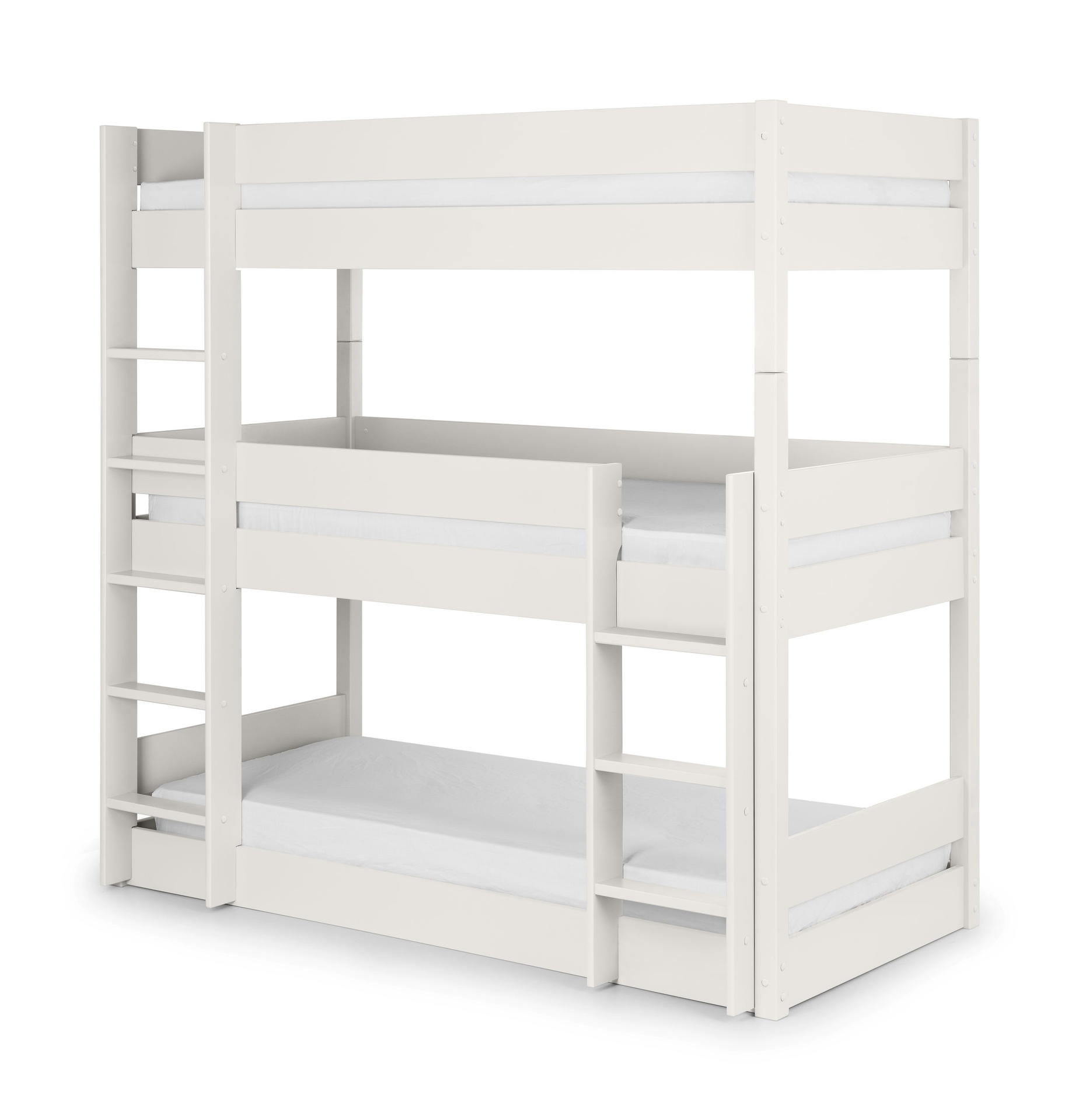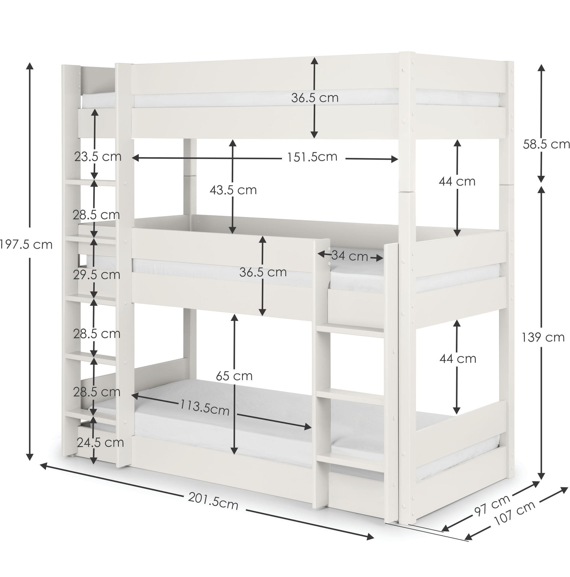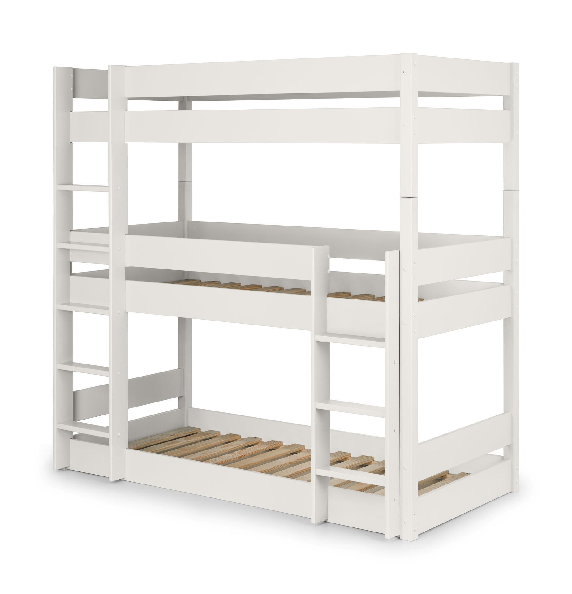 Accommodating 3 children whilst only using the space of one single bed, the Trio bunk bed is the perfect solution for those short on space in smaller bedrooms. Ideal for sleeping siblings, or regular sleepovers the durable Trio Bunk is finished in a stylish Surf White, matching any bedroom decor. Crafted from solid pine and MDF, this safe and sturdy design is essential for maximising space.