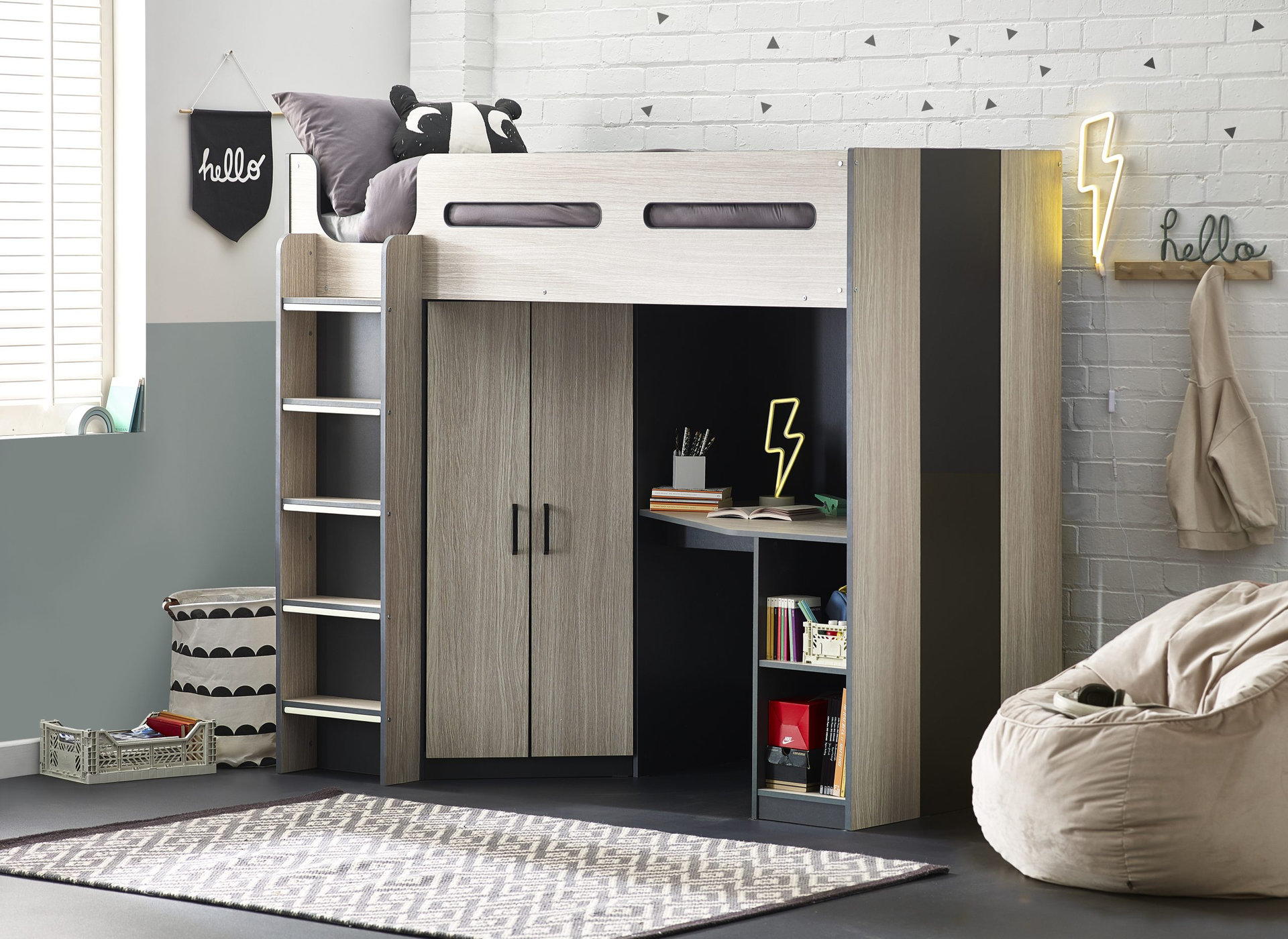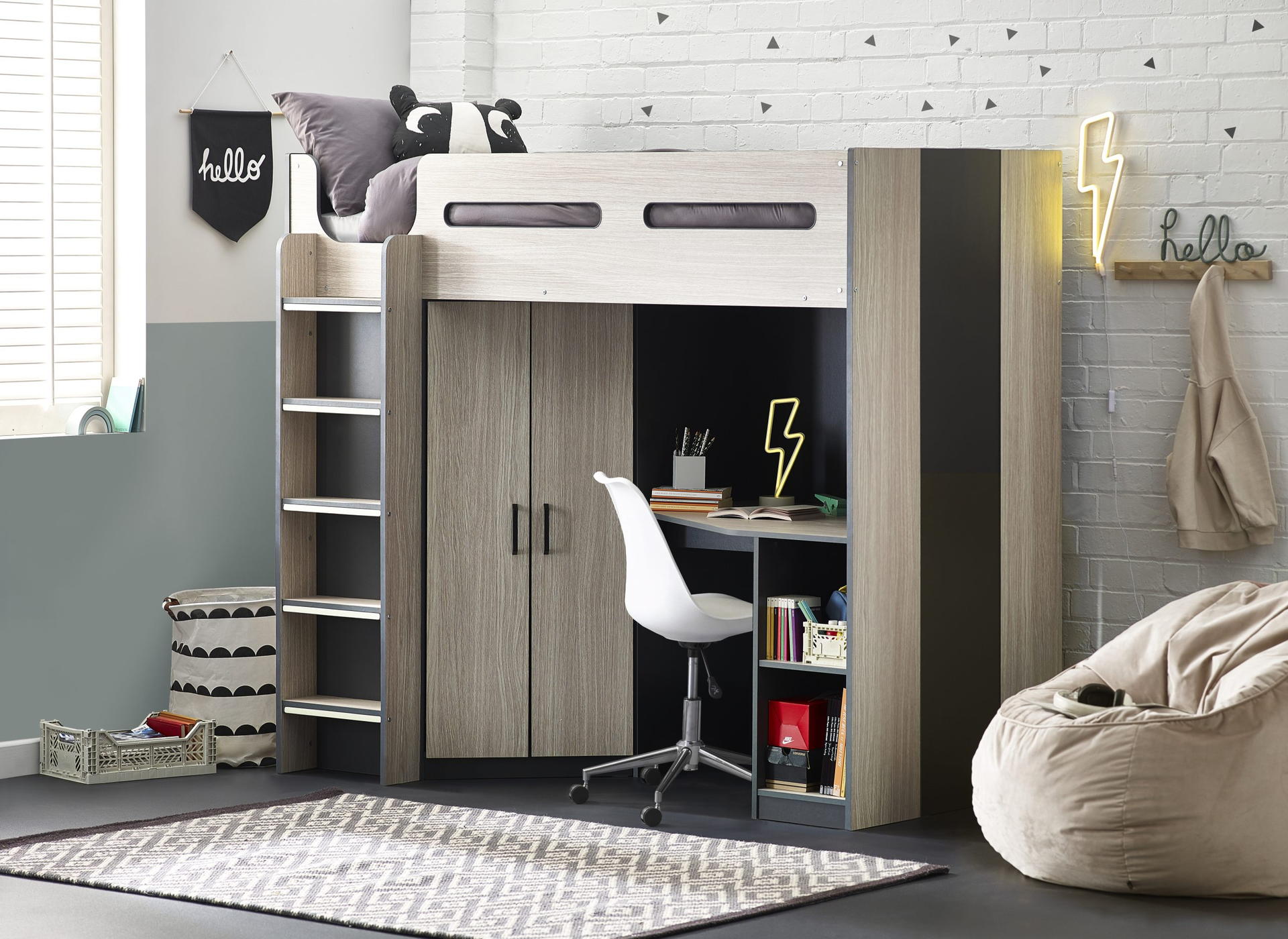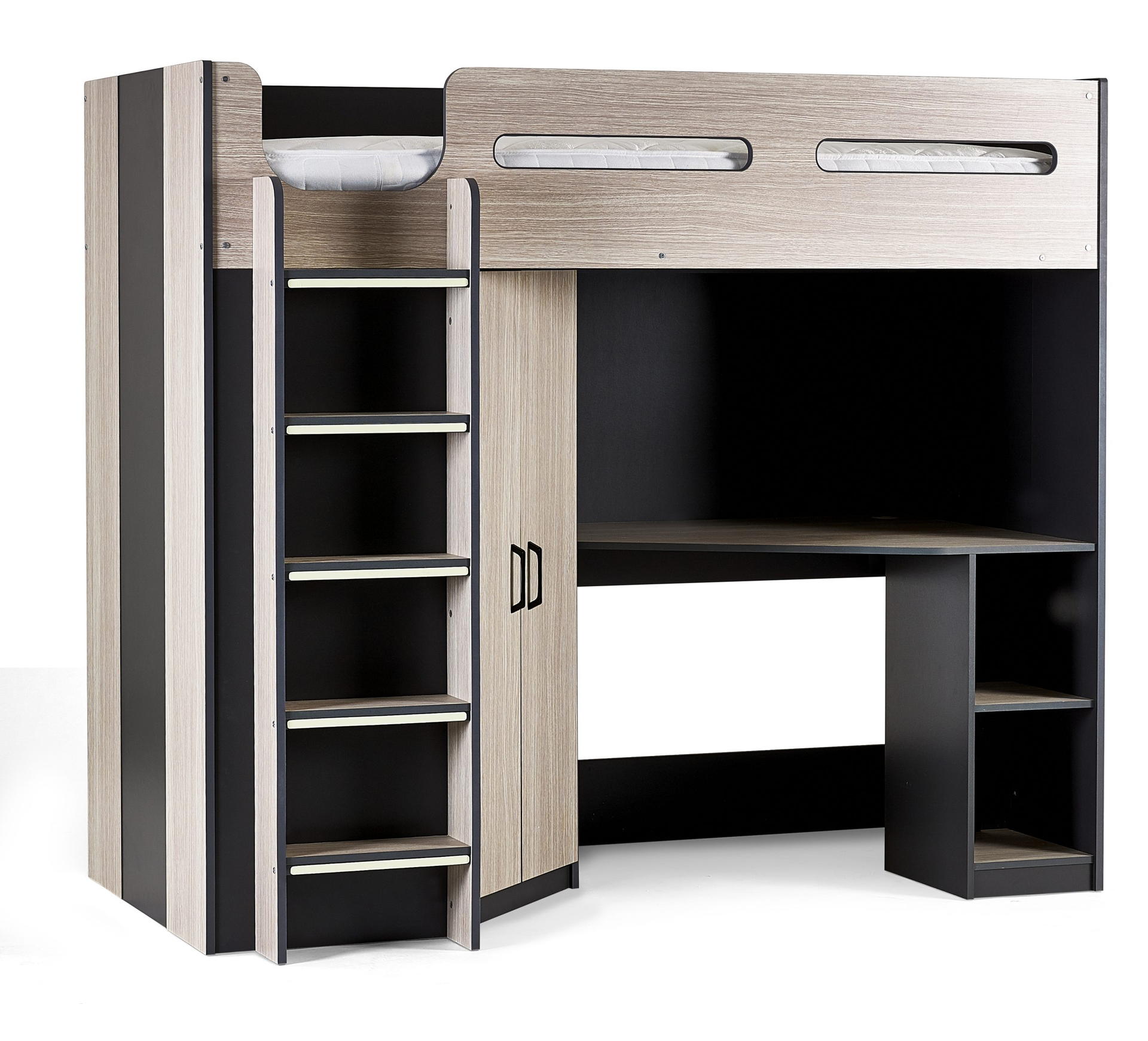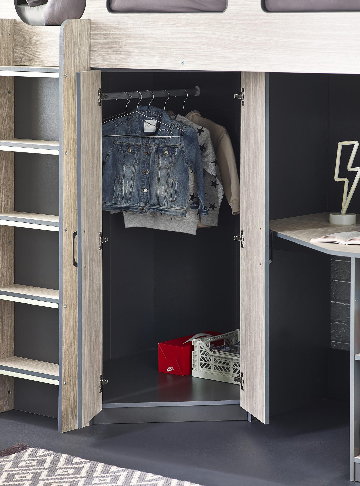 Designed with perfect functionality, the Hercules Highsleeper is the ultimate bed for your child. The angled wardrobe provides ample space for clothing, whilst the built-in shelving is great for all their files, folders, trainers, or games to stay organised. With glow-in-the-dark steps, and colourways of woodgrain and anthracite, white, and anthracite, there is an option for any interior style.
