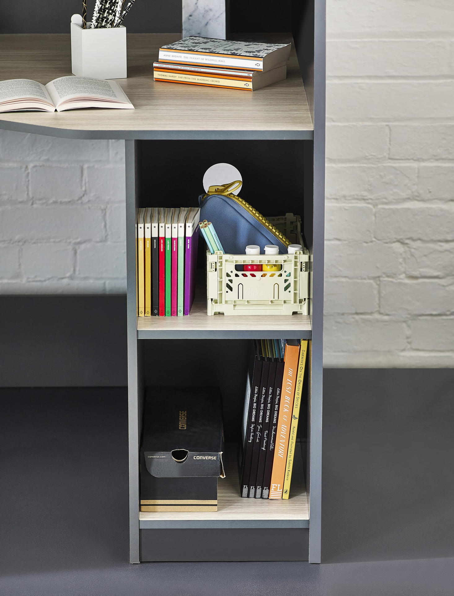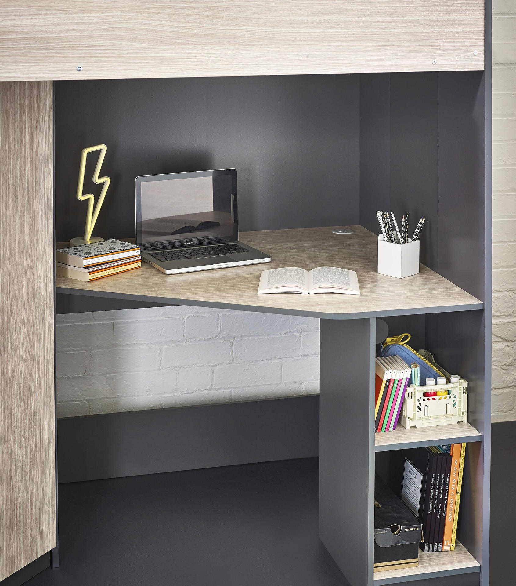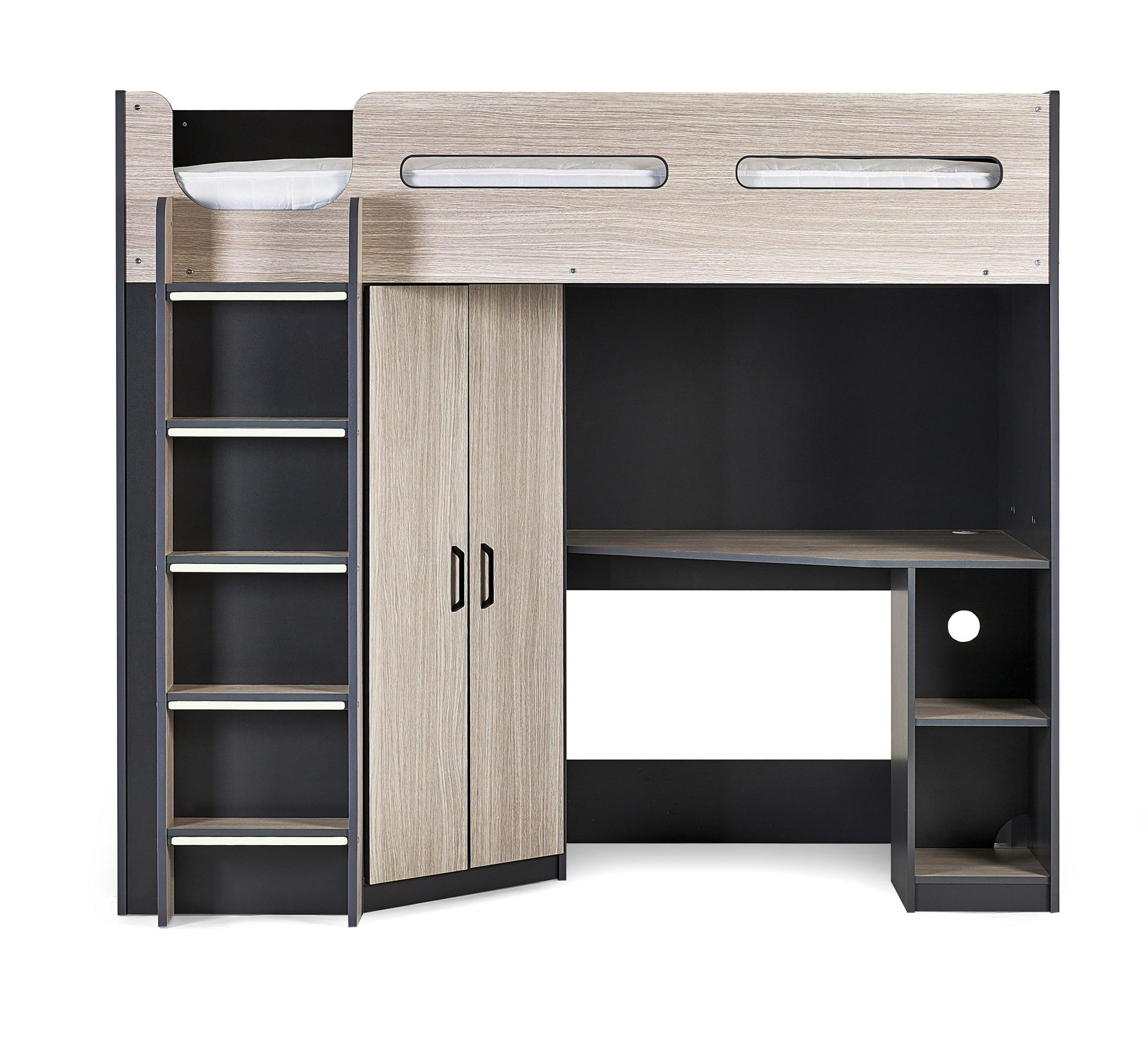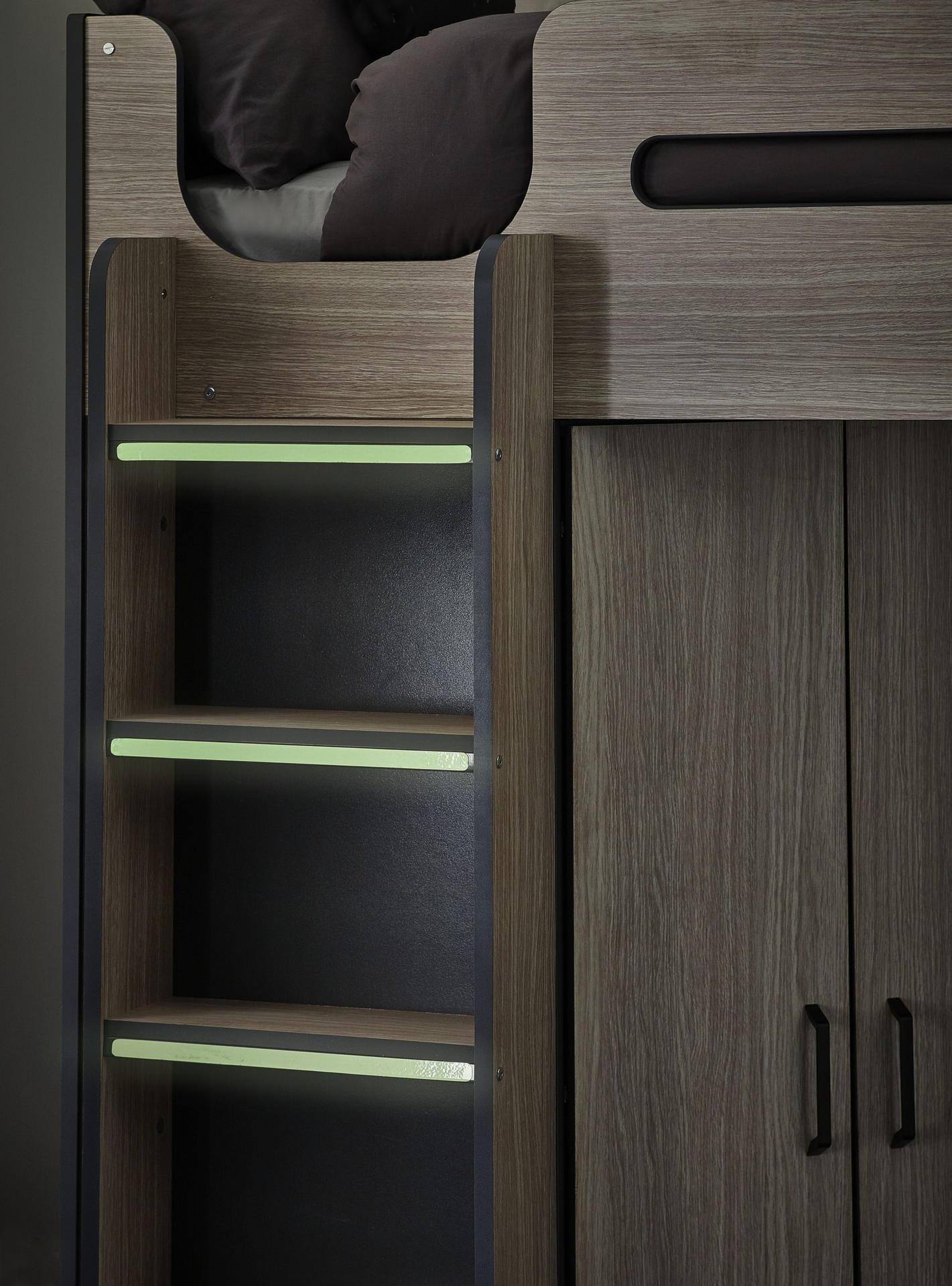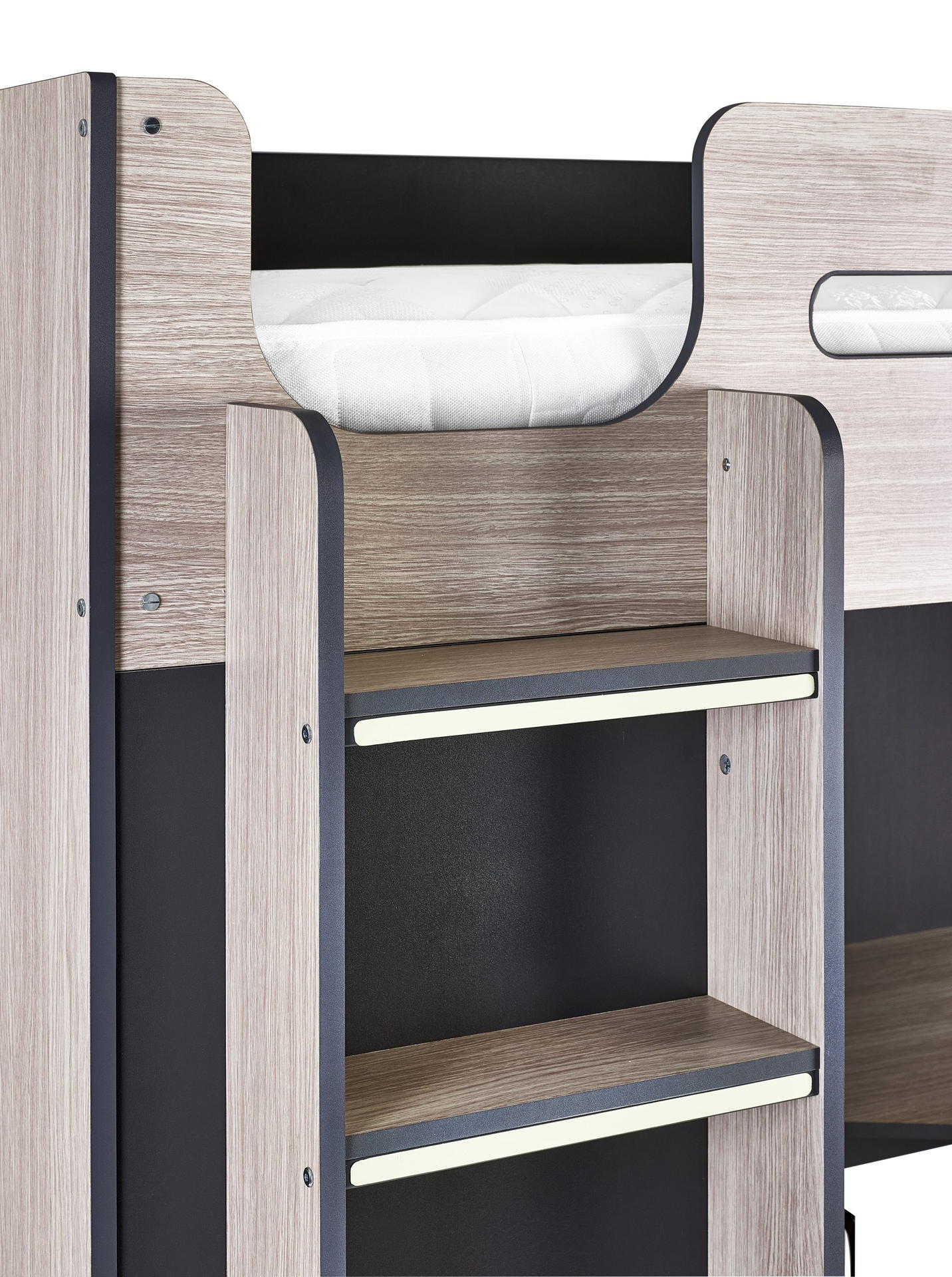 Designed with perfect functionality, the Hercules Highsleeper is the ultimate bed for your child. The angled wardrobe provides ample space for clothing, whilst the built-in shelving is great for all their files, folders, trainers, or games to stay organised. With glow-in-the-dark steps, and colourways of woodgrain and anthracite, white, and anthracite, there is an option for any interior style.