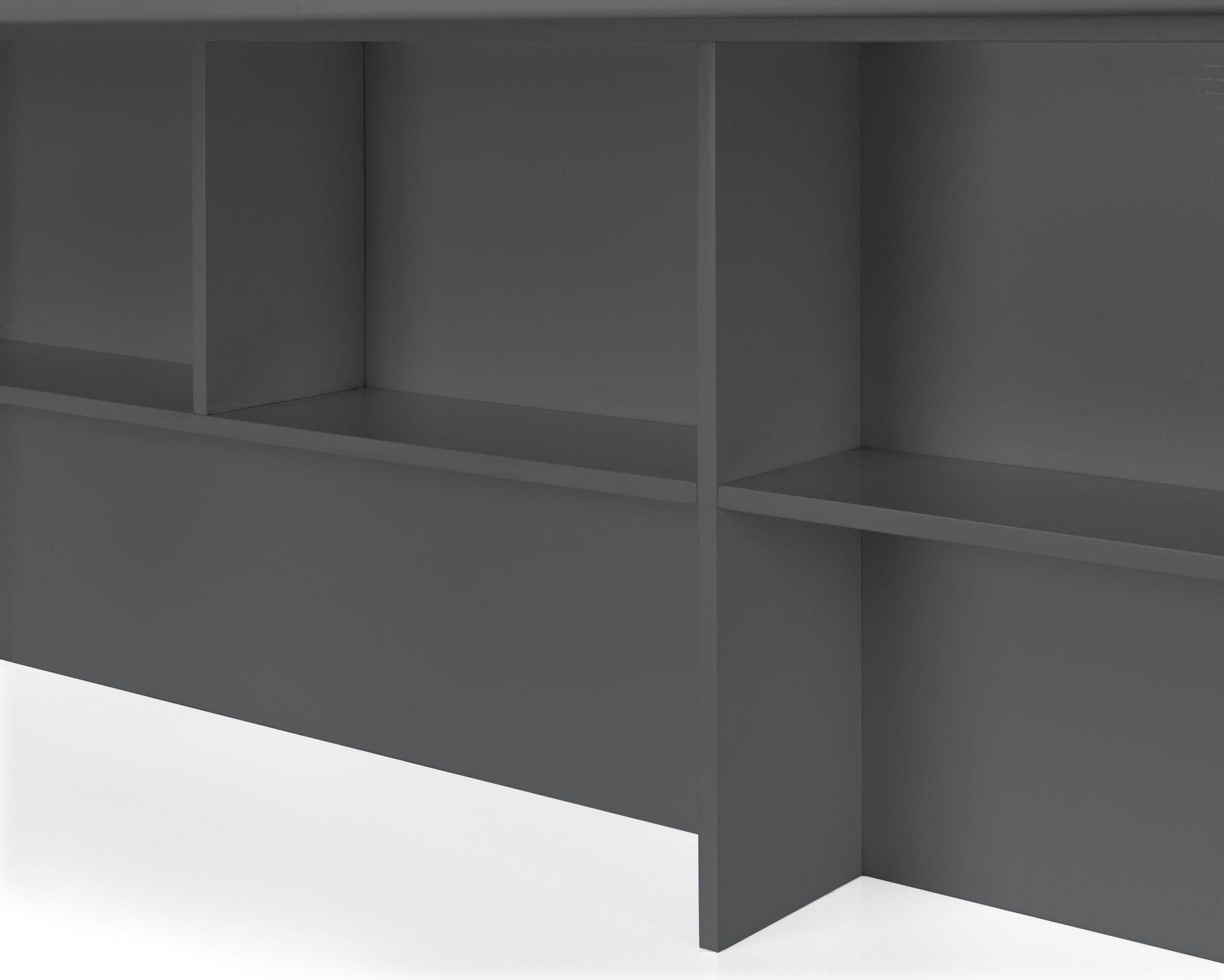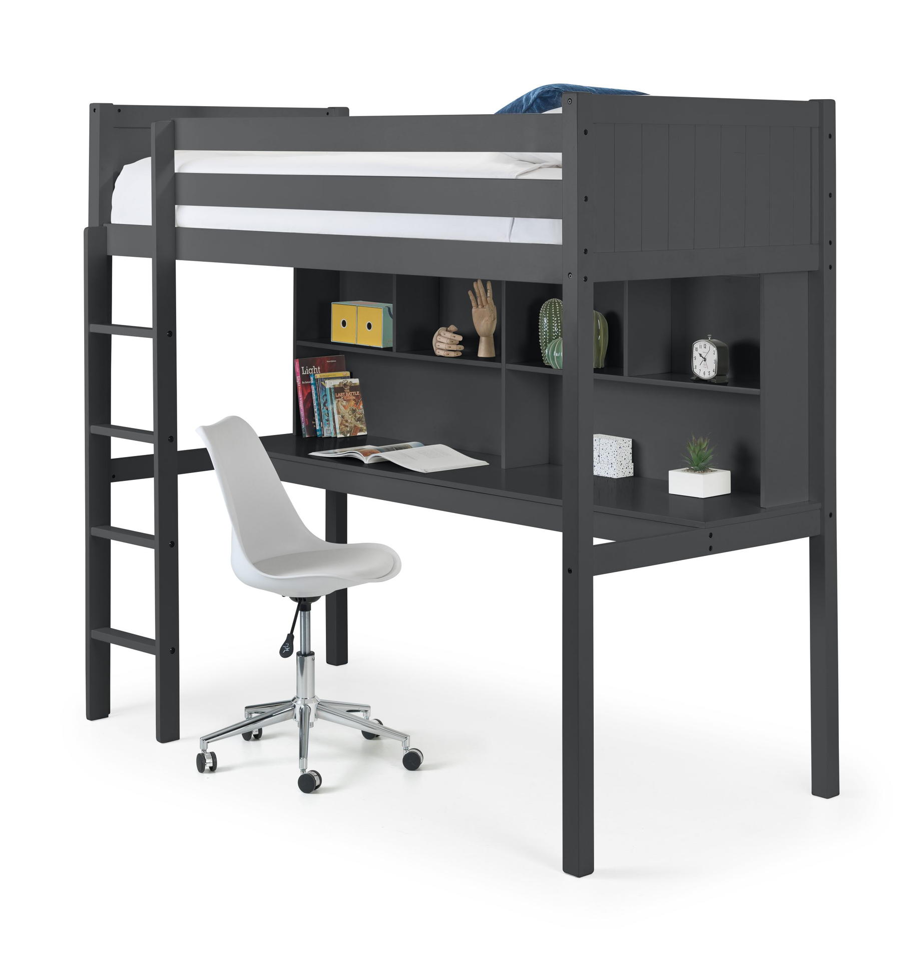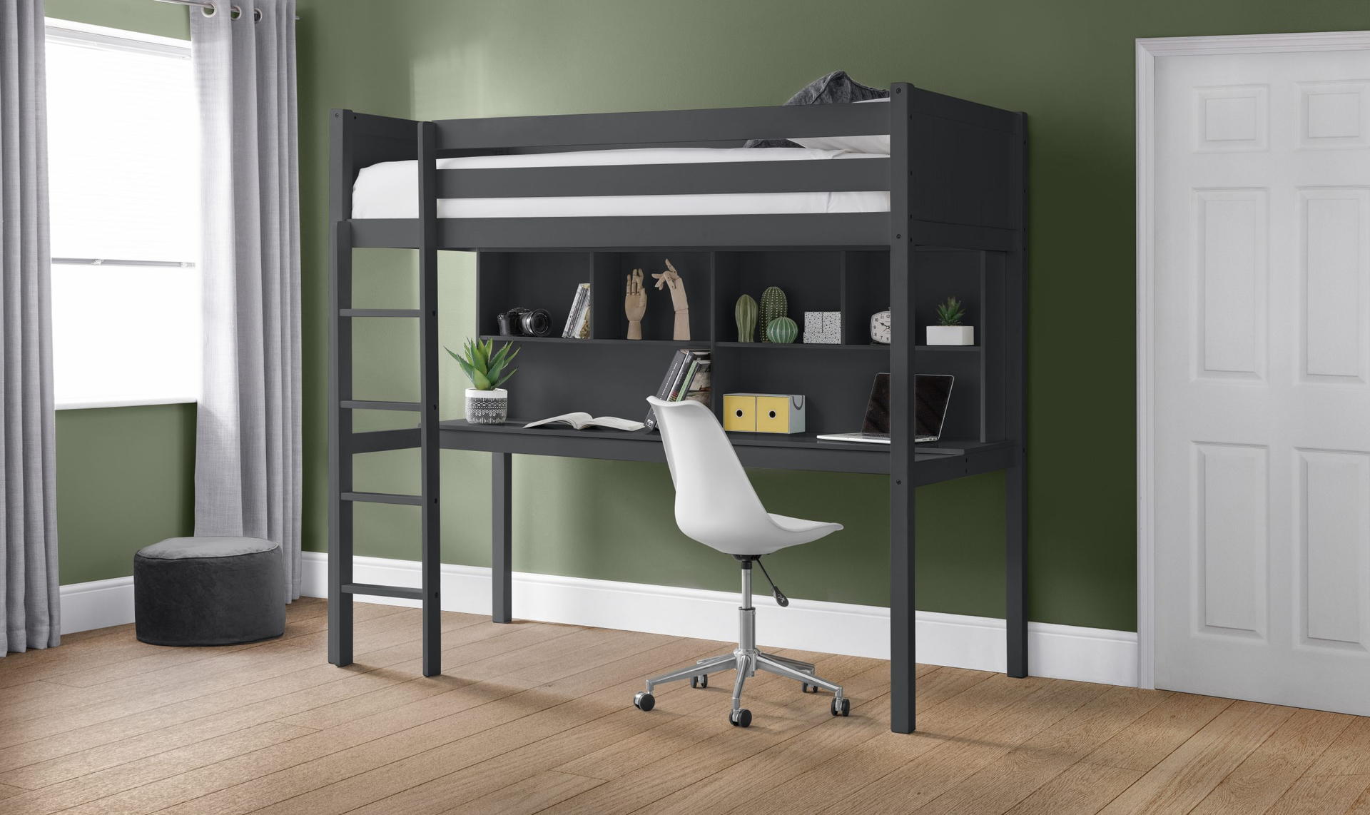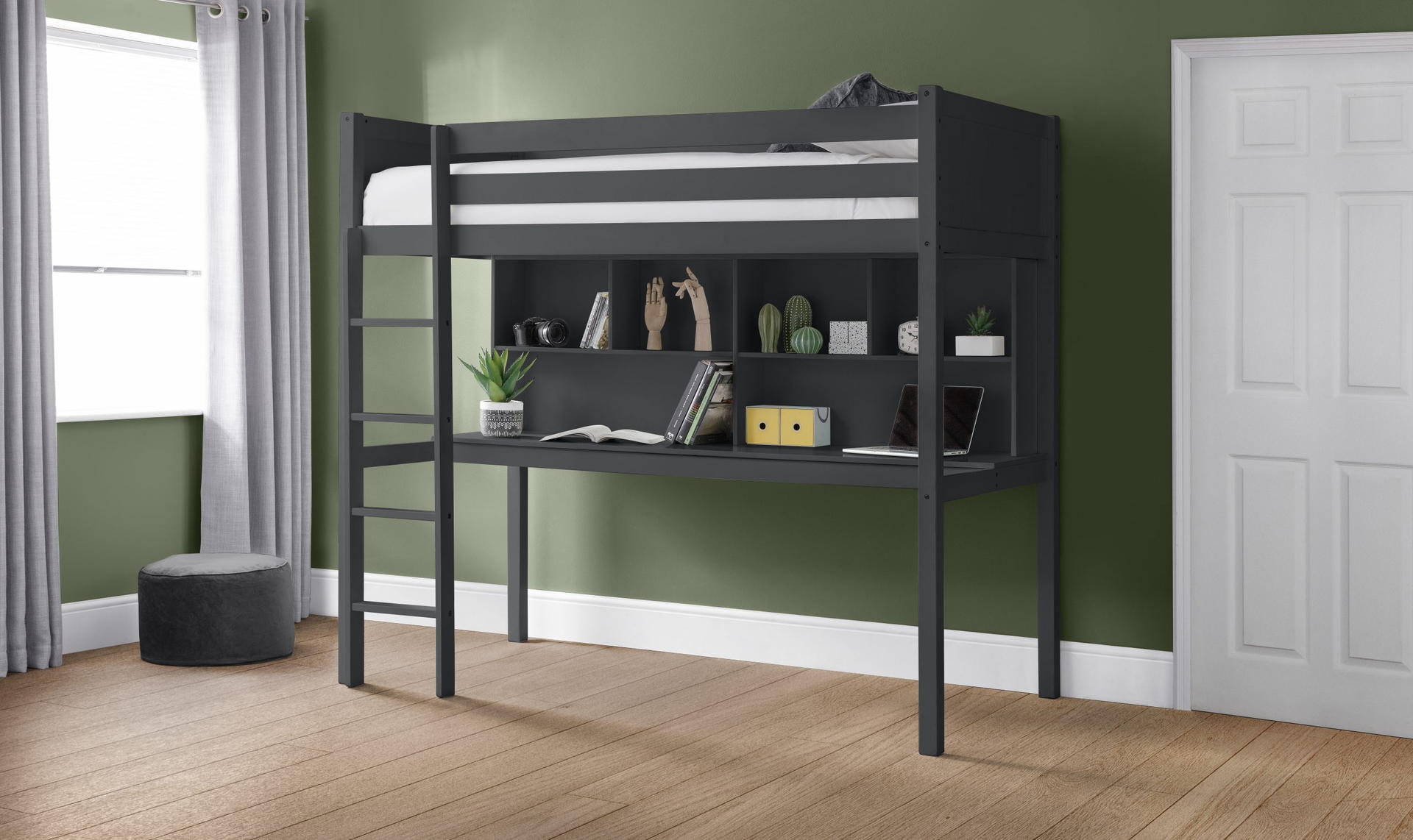 Crafted from Malaysian Hardwood and MDF, the Titan High sleeper is finished in a choice of White, Grey or Anthracite lacquer, matching with any bedroom décor as they grow. Offering a classic design with panelled detailing, this high sleeper features a workstation underneath, complete with shelves and room beneath for extra storage.