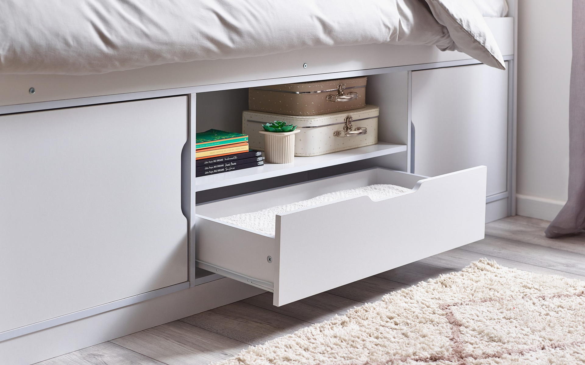 The Atom Low Sleeper provides plentiful storage within a small space, the perfect set up for kids and teenagers. Finished in all white, this low sleeper contains two cupboards, a drawer and a shelf, maximising space.