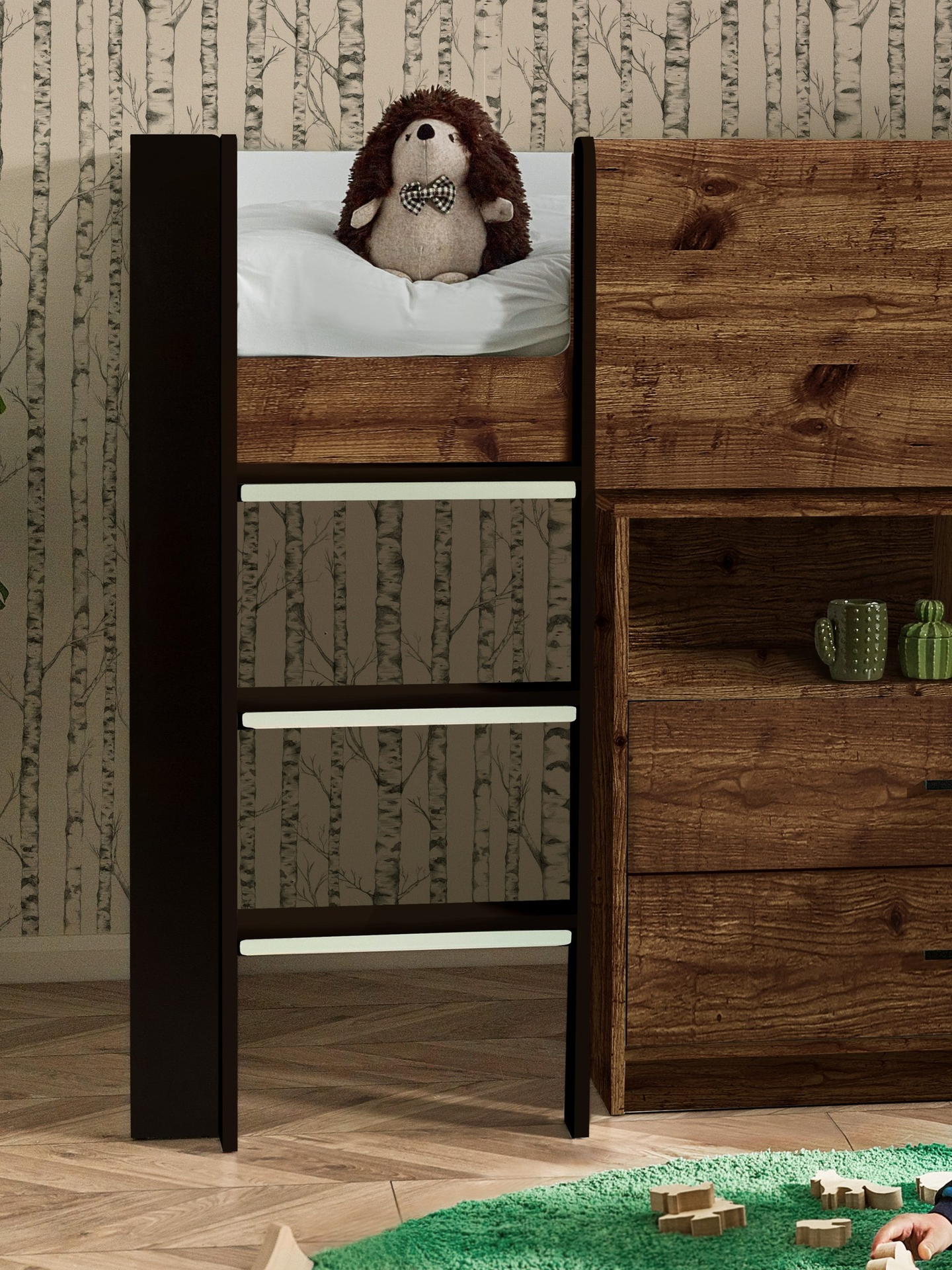 Three glow-in-the-dark steps add charm and secure ascent to the cozy sleeping area.
