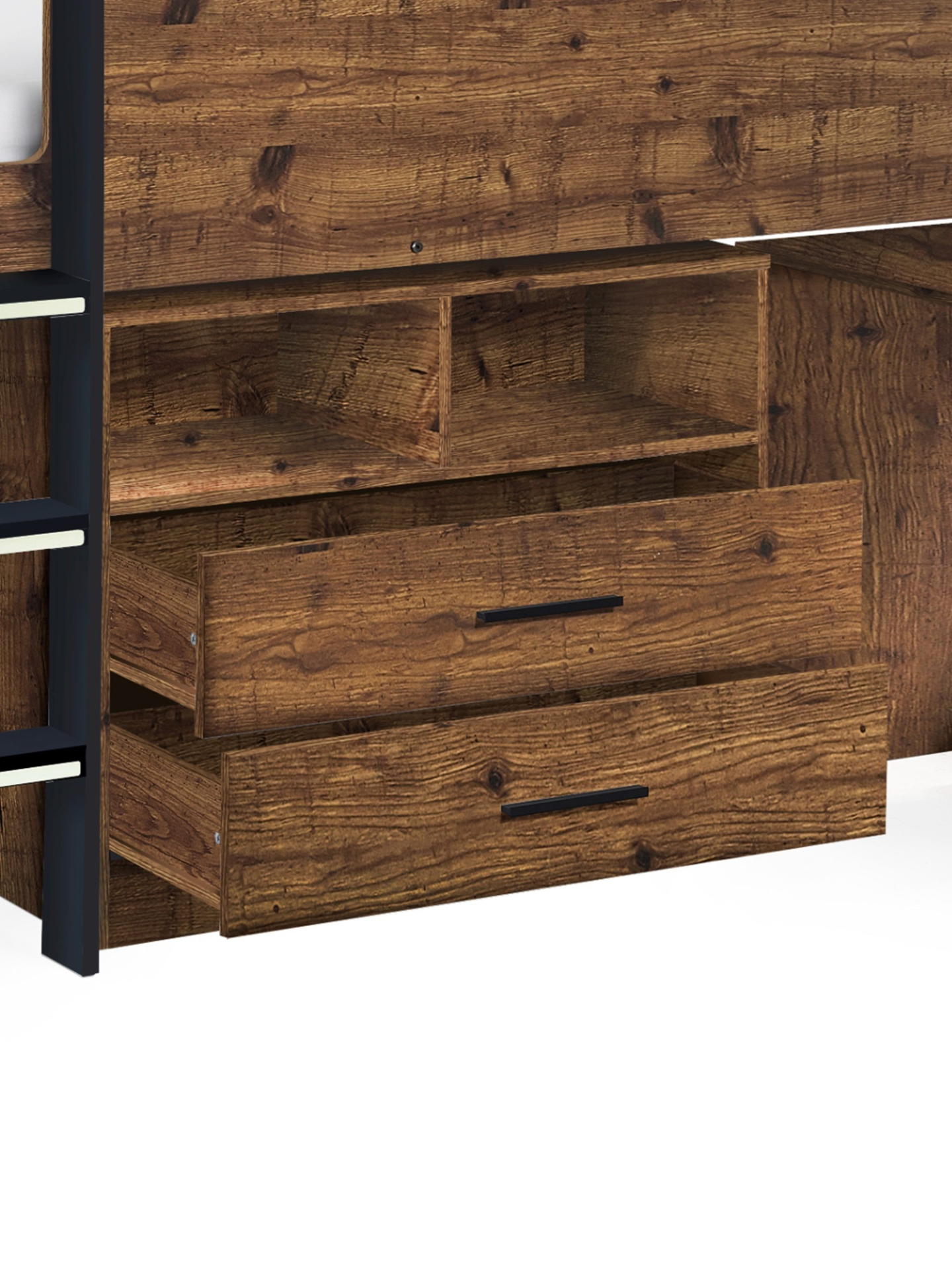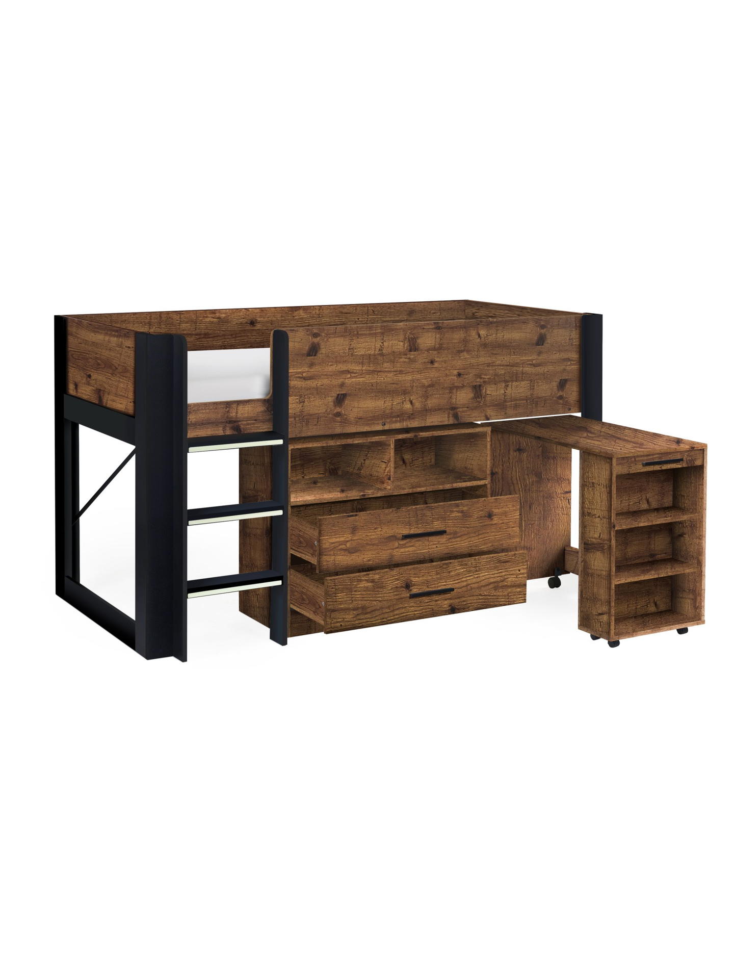 Embark on a bedtime adventure with the Otis Midsleeper, a versatile and stylish addition that transforms your child’s room into a haven of imagination. The urban rustic wood and black finish add a touch of modernity. Featuring two pull-out drawers with handles for convenient storage and shelving underneath for toys and essentials, this midsleeper is designed for practicality.The standout feature is the pull-out desk with wheels, providing a dedicated study space that can be effortlessly tucked away when not in use. Additional shelving ensures an organised and clutter-free environment for your little one. The three glow-in-the-dark steps add charm and safety, creating a playful and secure ascent to the cosy sleeping area.