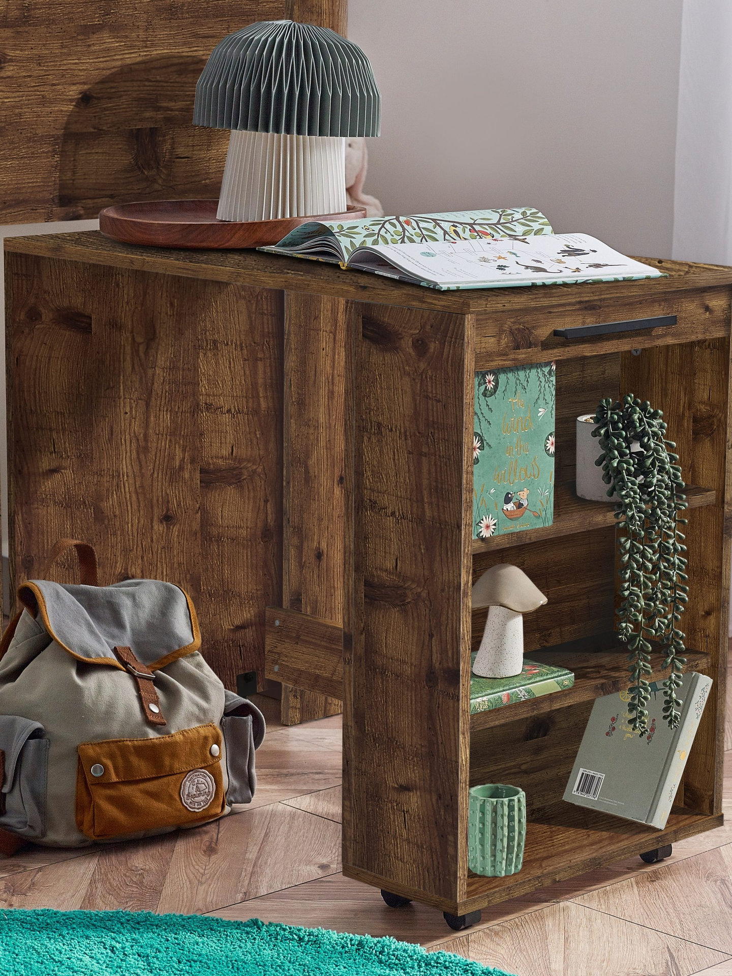 The pull-out desk with wheels offers a dedicated study space, maximizing space in the room.