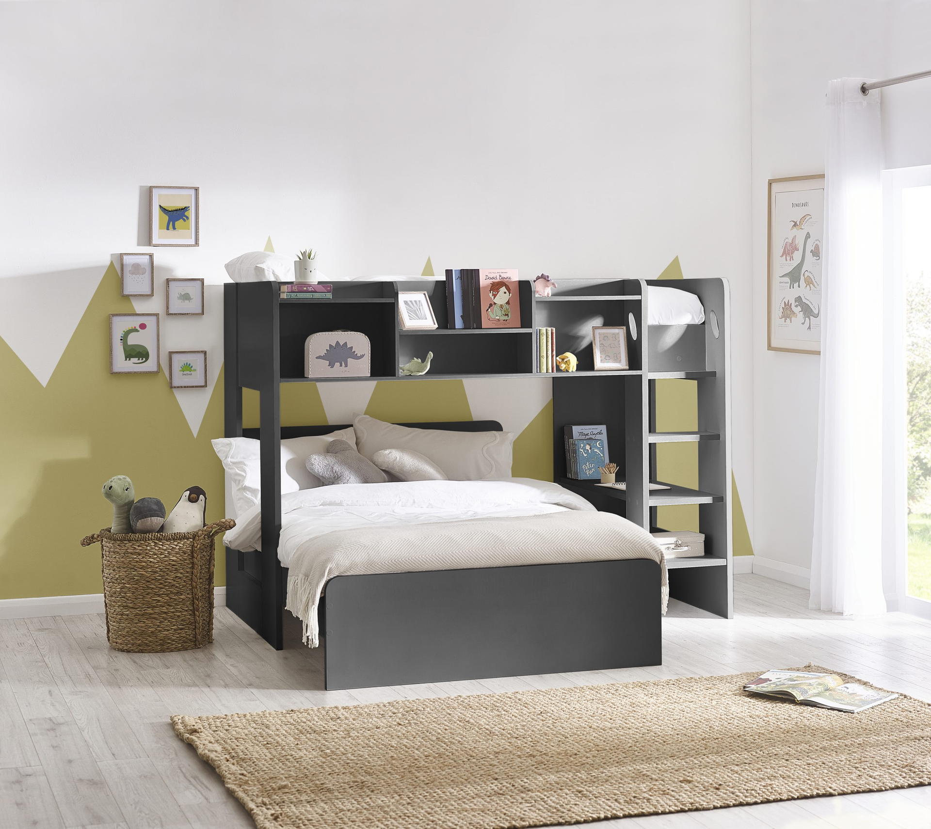 Experience the perfect blend of style, functionality, and fun with the Owen Bunk Bed in Anthracite. This versatile piece features a cosy single bed perched above a removable small double underbed, offering flexibility for sleepovers or extra lounging space. The built-in shelving, both inside and on the front, provides ample room to showcase decorative items, books, and toys, keeping your child’s room organised and vibrant. The study ladder ensures easy access to the top bunk while adding a touch of modern design. Transform any room into a stylish haven of creativity and comfort. Mattress sold separately.