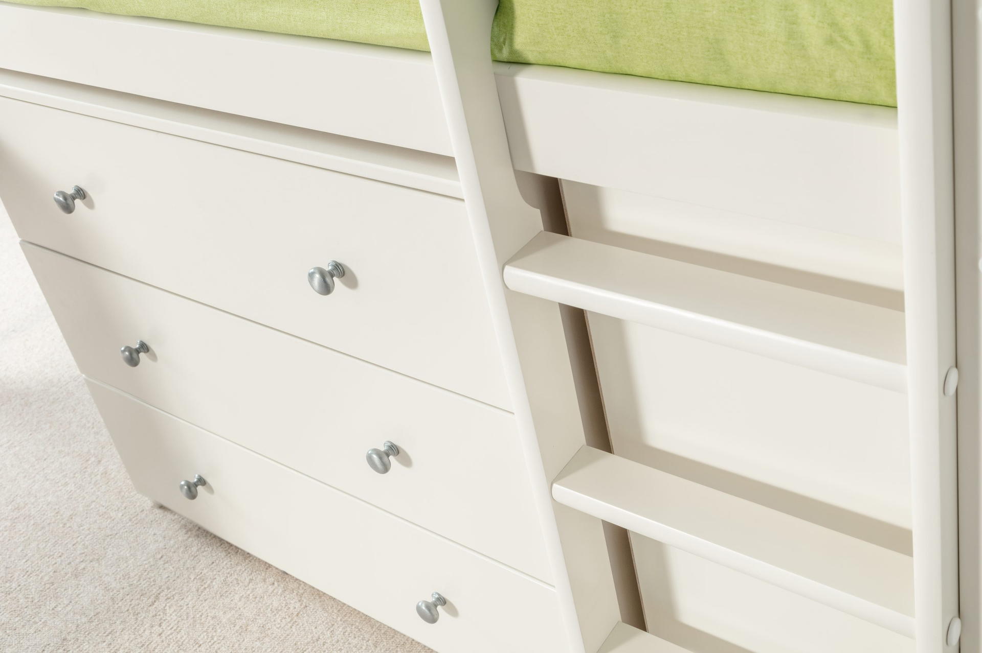 Roxy is an extremely clever and practical piece of children’s furniture that offers incredible functionality and great value for money. Roxy’s compact footprint is supported by a robust, solid pine framed construction and offers numerous useful features from a handy pull-out desk to ample shelving and cupboard space. Immaculately finished in a smooth stone white lacquer, Roxy comes with two choices of handle in either traditional painted wood, or a contemporary brushed steel finish. Roxy is the perfect accompaniment to Julian Bowen’s Cameo range of bedroom furniture in a matching stone white finish. Roxy is also available in Dove Grey