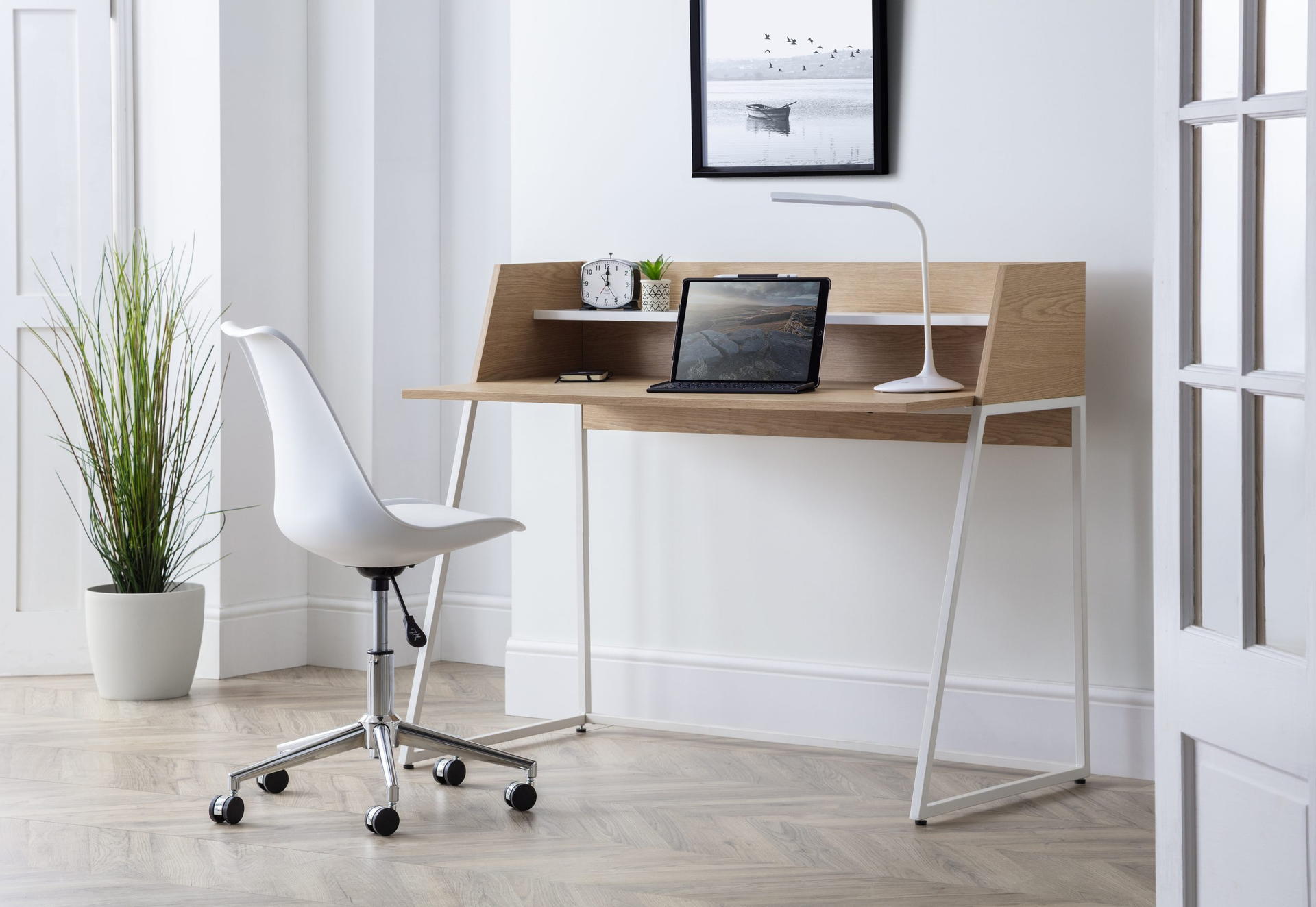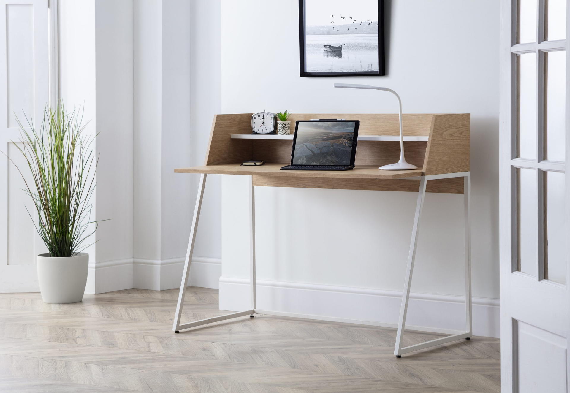 The Palmer Desk offers a simplistic, functional design. Offering a large surface area for your laptop and paperwork, along with an additional shelf for your stationary. This desk offers a space for your wires to sit neatly down the back of the desk, allowing you to keep your workspace tidy. Finished in an oak effect with a contrasting white shelf and legs, this desk suitable for a wide range of décor.