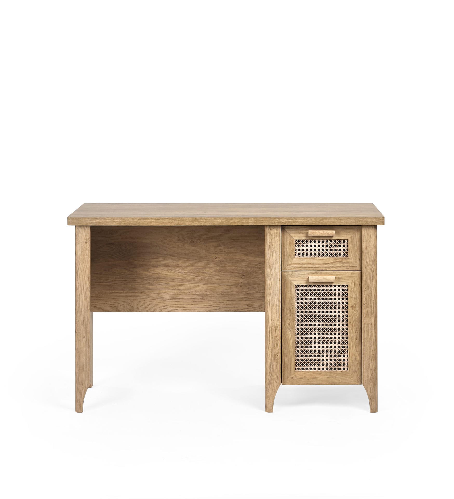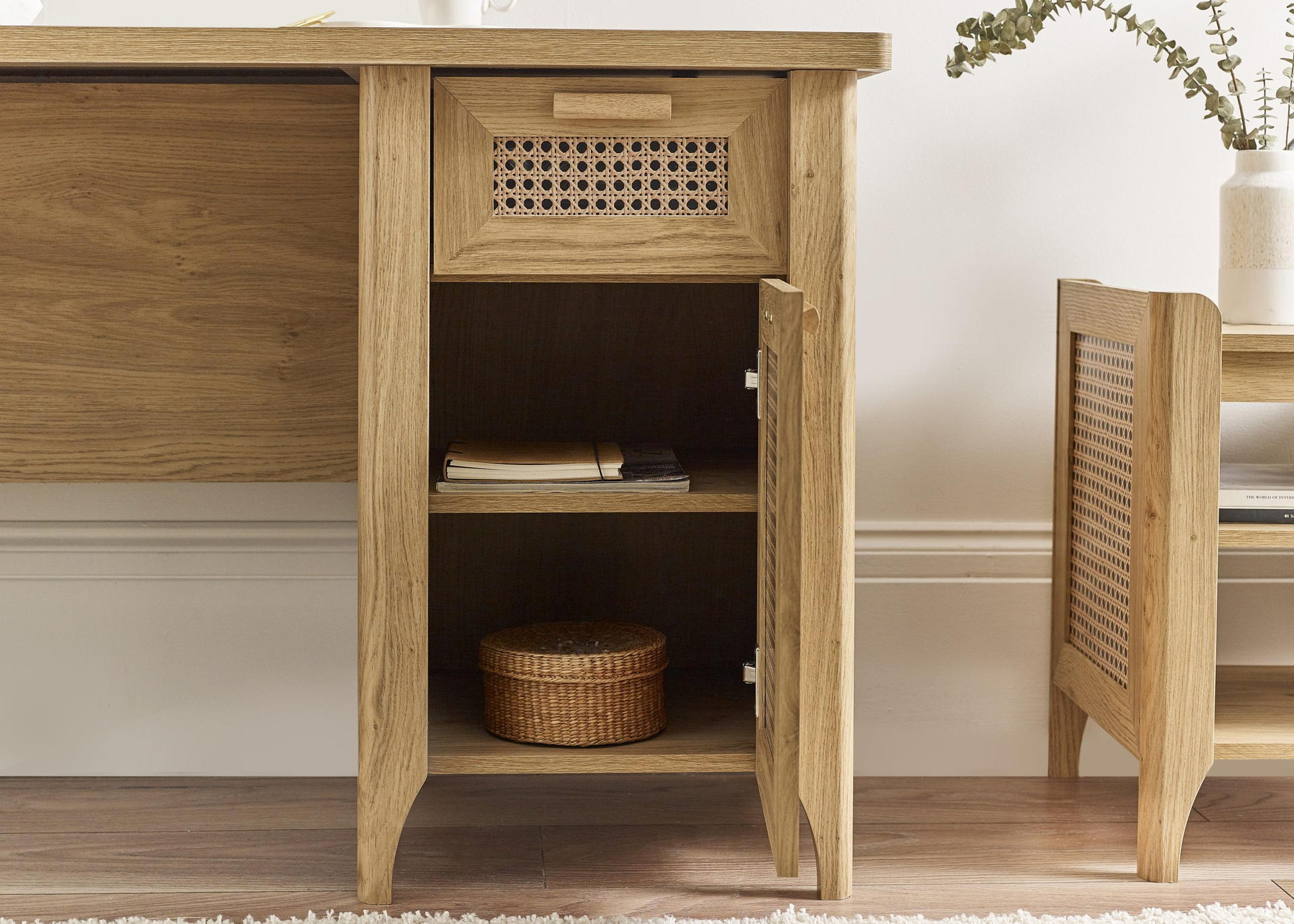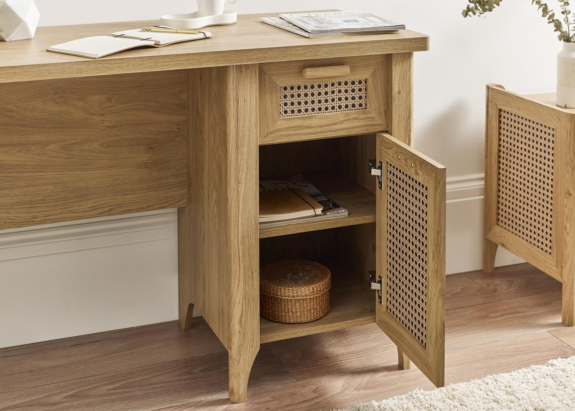 Showcasing a beautifully sleek design with a bohemian feel, the Sydney Desk offers exquisitely curved edging with gentle soft lines stunningly combined with a rattan-effect sticker front. Finished with a natural oak effect featuring one pull-out drawer and one cupboard providing the ideal storage space for stationary essentials. All around creating the perfect airy, warm feel within your home.