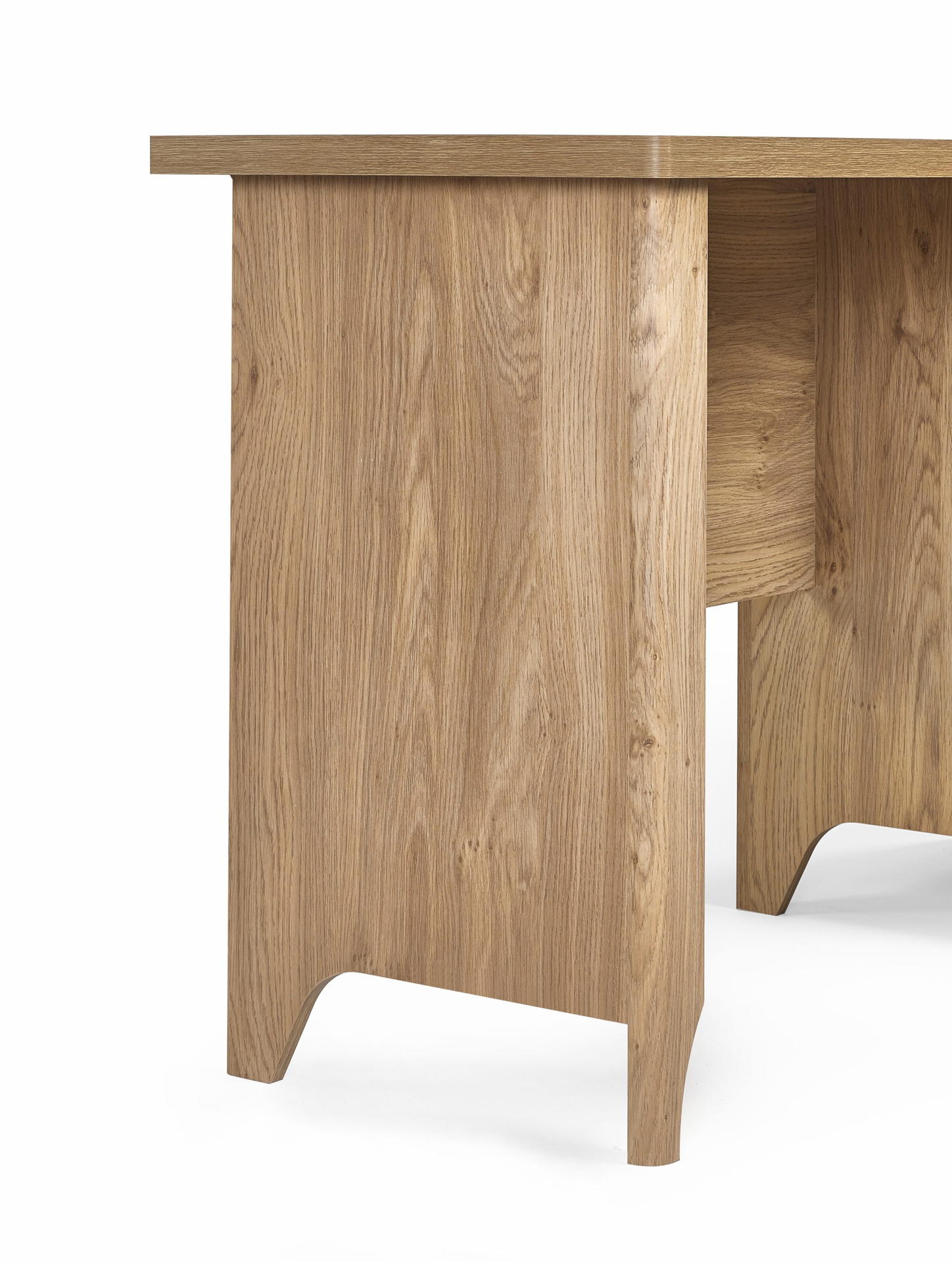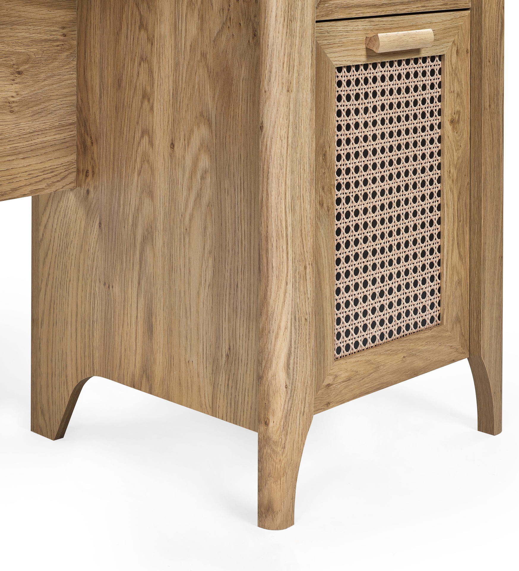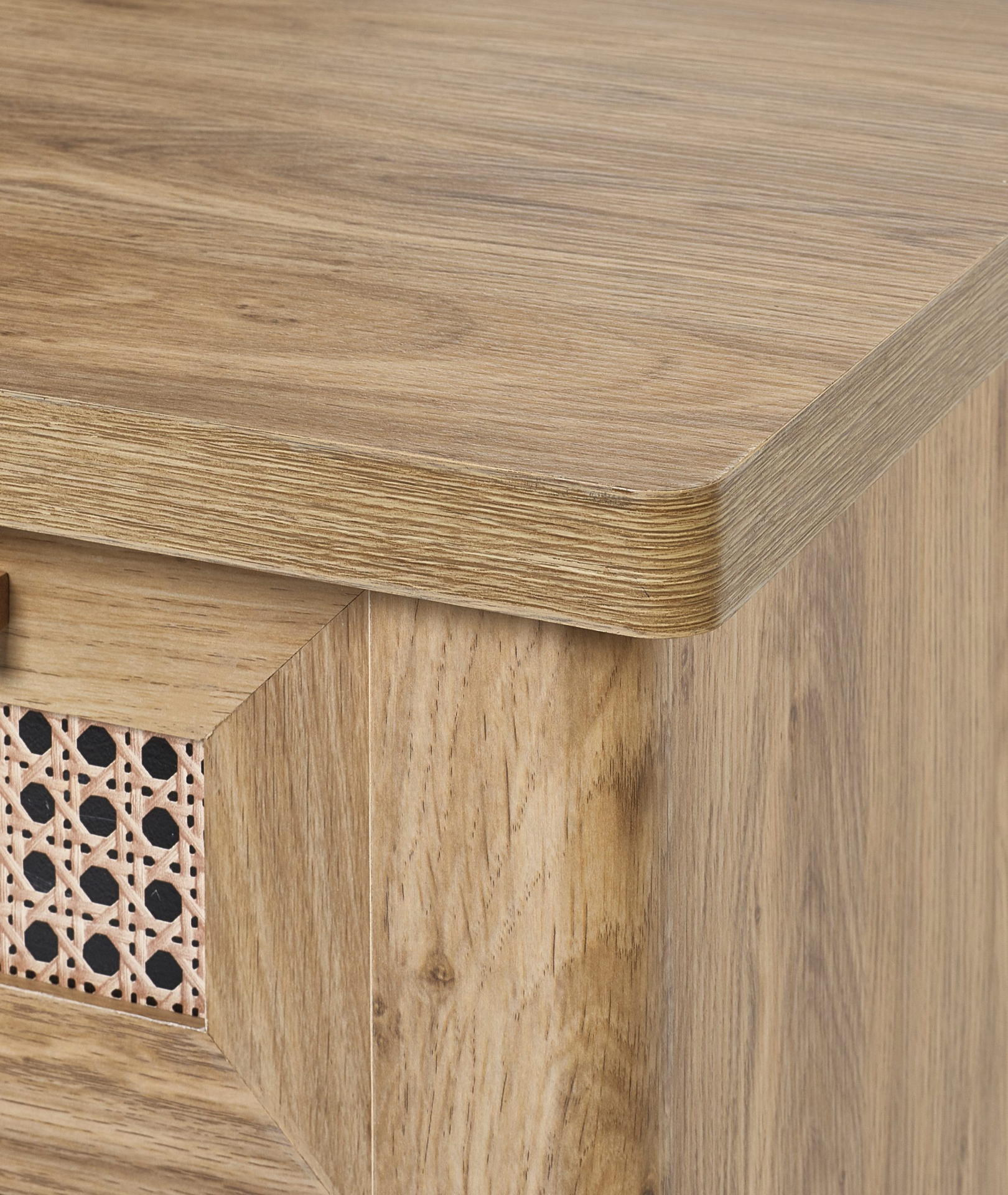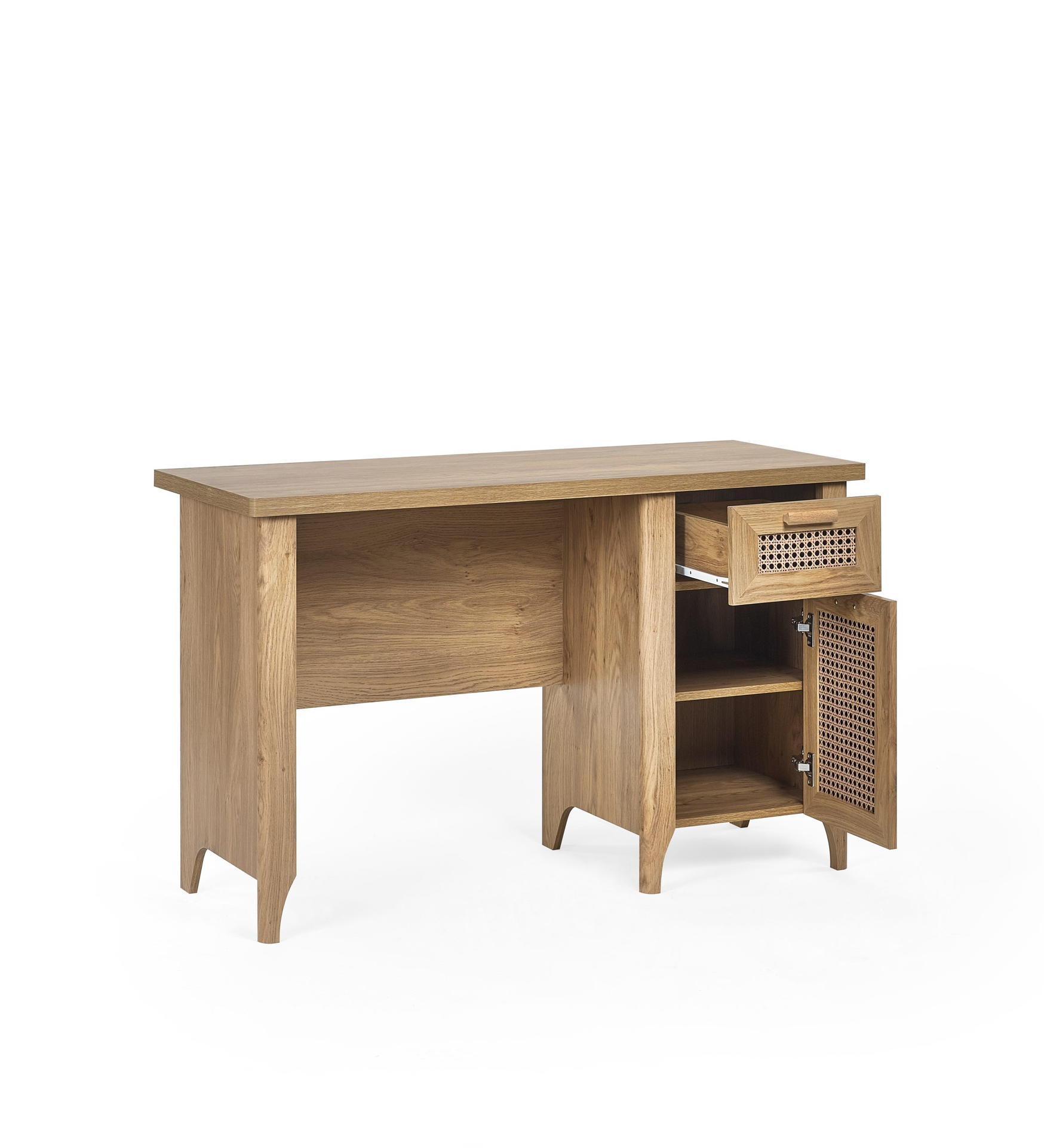 Showcasing a beautifully sleek design with a bohemian feel, the Sydney Desk offers exquisitely curved edging with gentle soft lines stunningly combined with a rattan-effect sticker front. Finished with a natural oak effect featuring one pull-out drawer and one cupboard providing the ideal storage space for stationary essentials. All around creating the perfect airy, warm feel within your home.