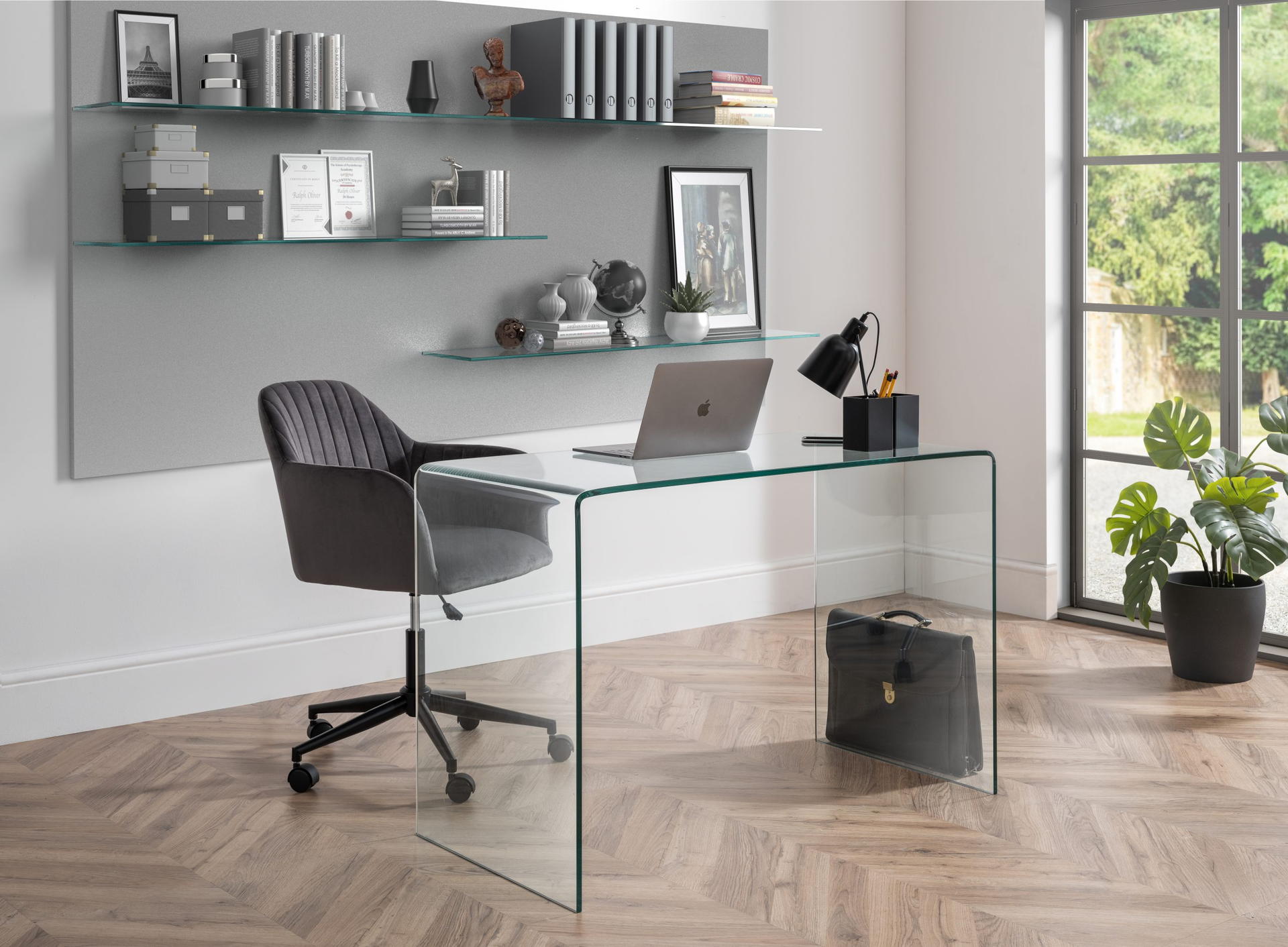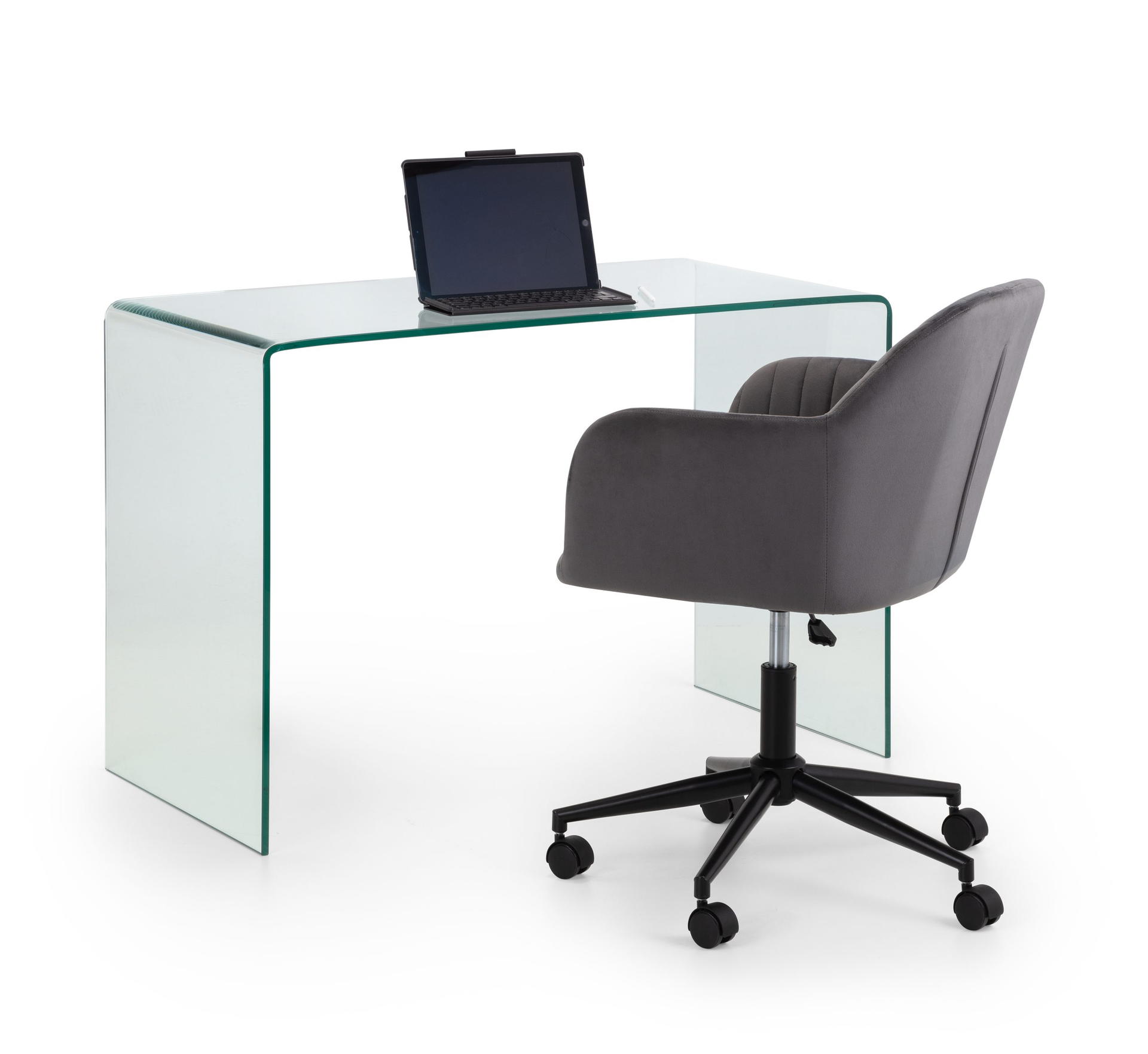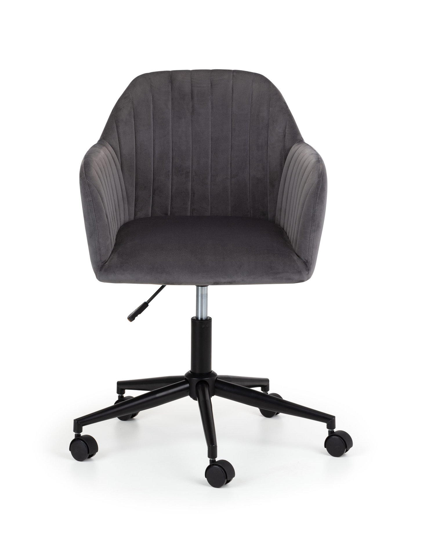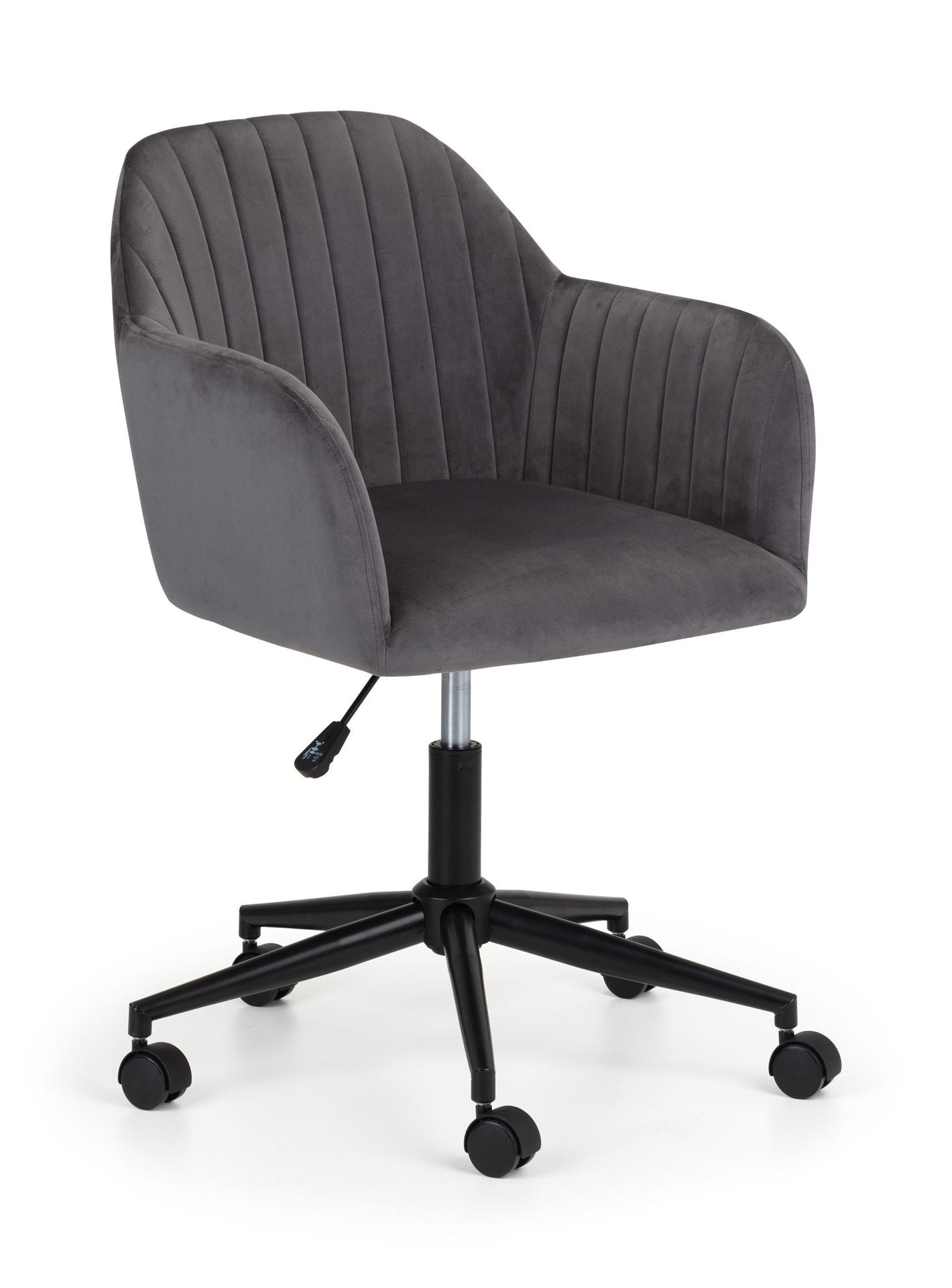 Finished in soft velvet, the Kahlo swivel office chair features a filled seat with a curved backrest, giving a beautiful look as well as maximum comfort. The height adjustable gas lift mechanism and wheeled swivel base provides practicality, whilst the pleated back adds to the traditional art deco design. Available in two beautiful colour options of blue or grey.