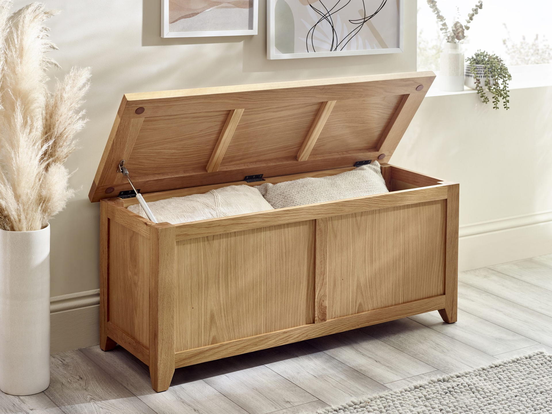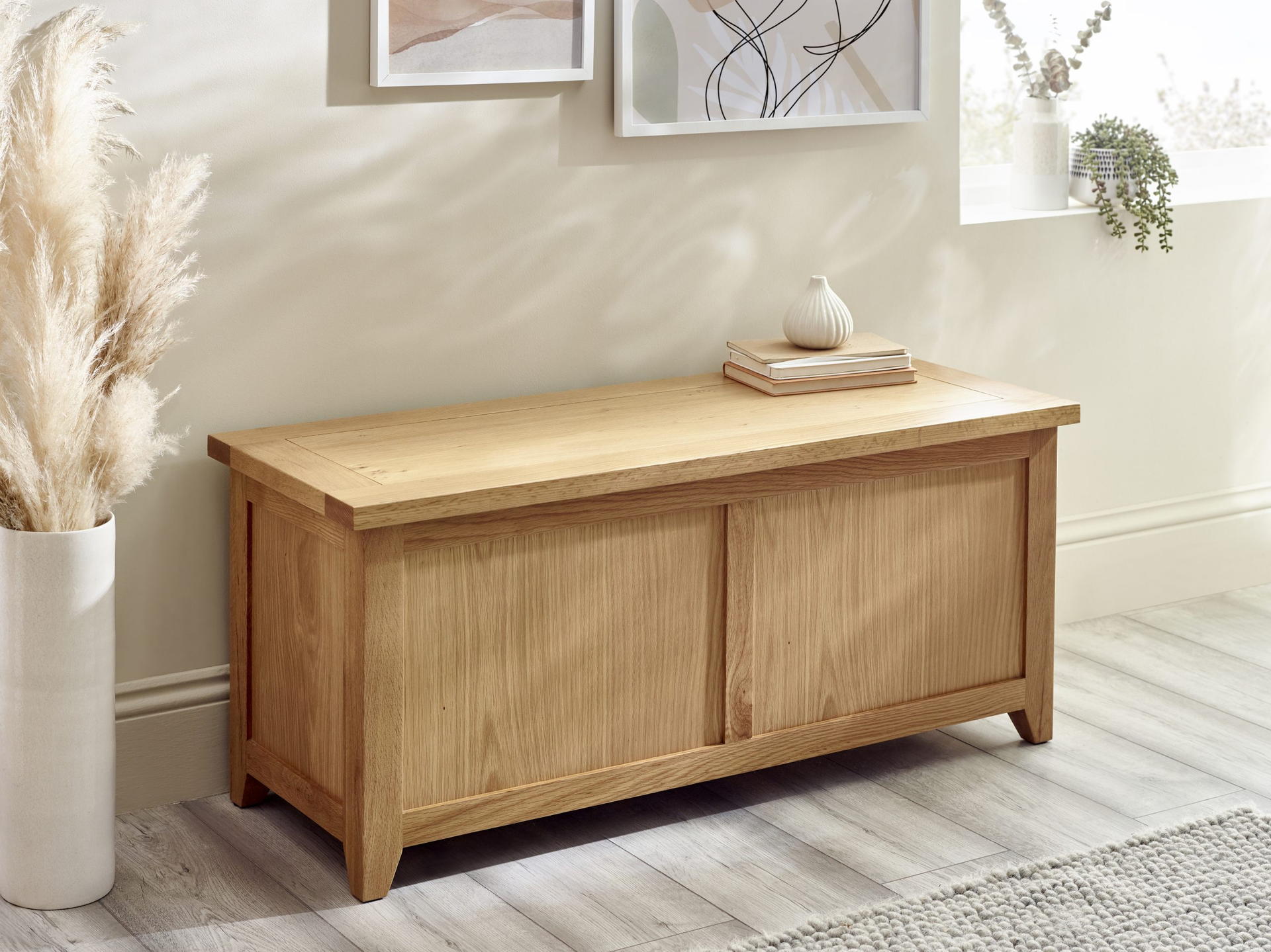 Experience both style and functionality with the Mallory Storage Bench. Crafted from solid oak and oak veneers, this bench boasts a clean and simple design that effortlessly complements any decor. Its seamless opening mechanism allows for easy access, while the generous storage space inside provides ample room for all your essentials. Whether placed in the entryway, bedroom, or living room, this versatile piece adds both charm and practicality to your space. Minimal assembly is required, ensuring a hassle-free setup.