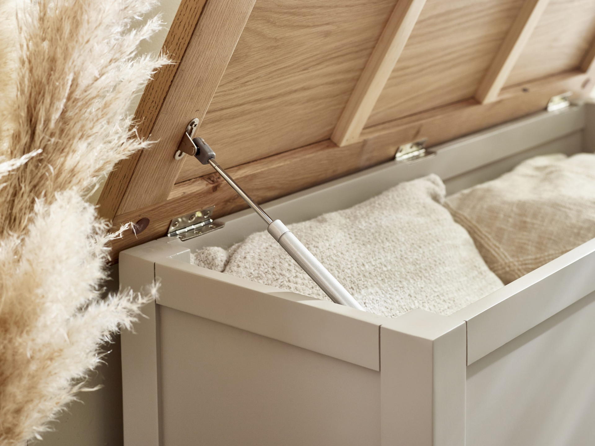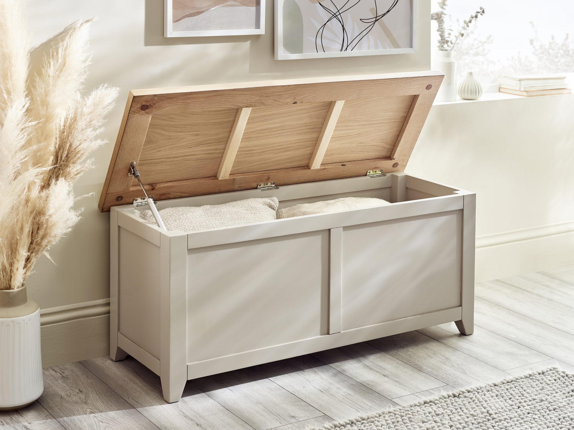 The hinged lid ensures easy access and serves as a comfortable seating surface.