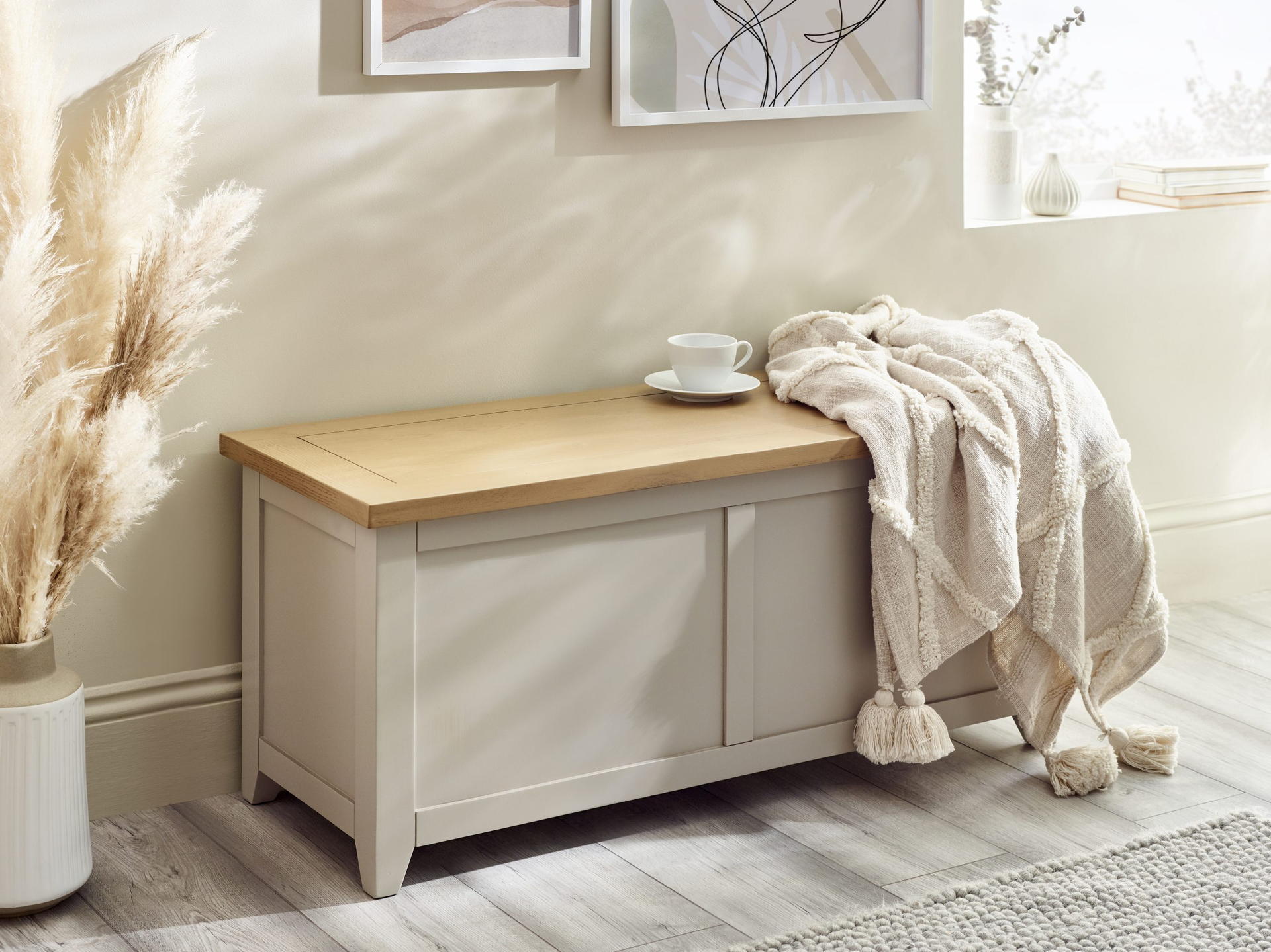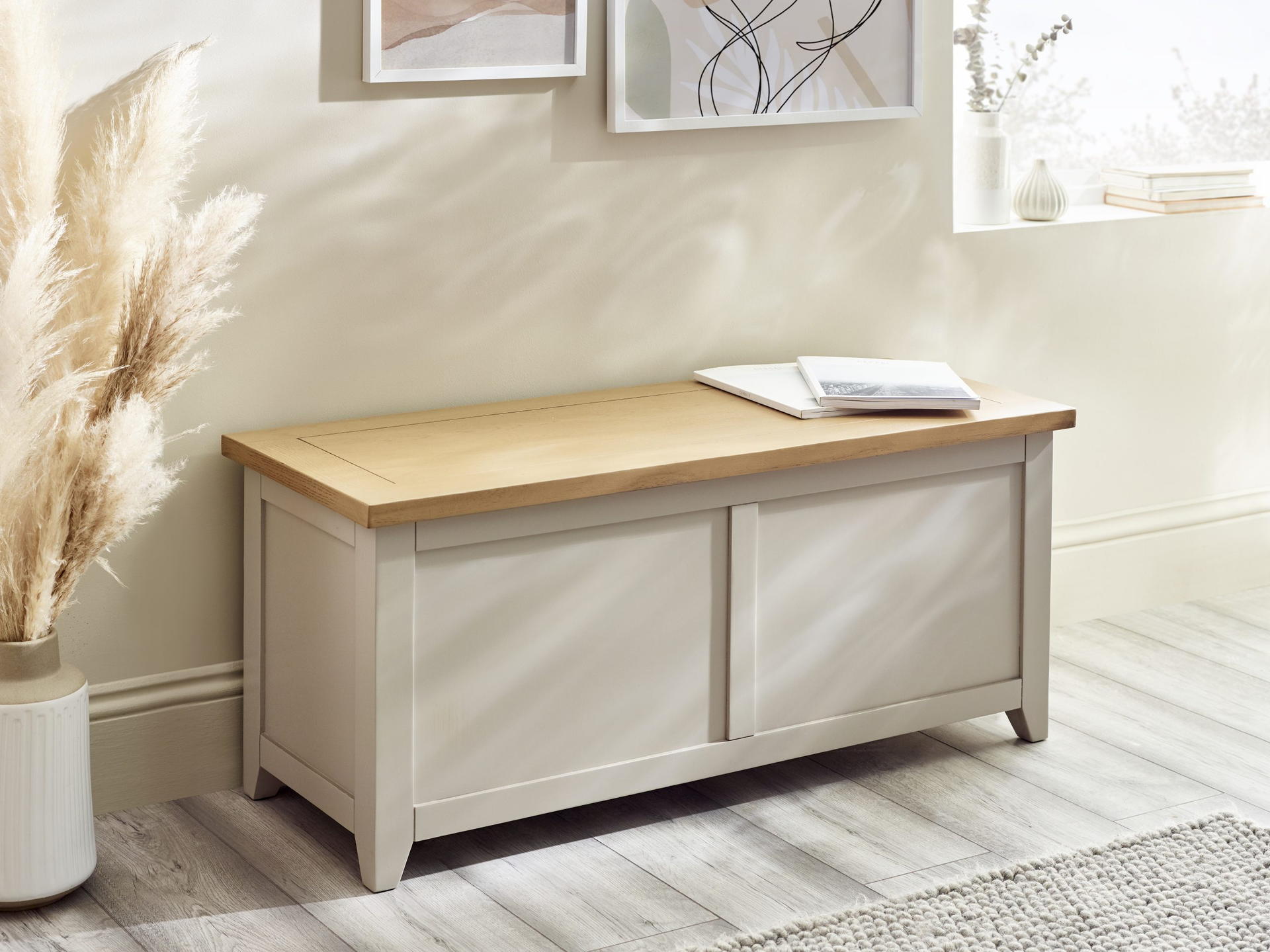 Designed with practicality in mind, the Richmond storage bench features a spacious storage compartment beneath the seat. Perfect for stowing away shoes, blankets, or other household items, this storage solution helps you maintain a clutter-free environment. The hinged lid allows for easy access to your belongings while providing a comfortable seating surface. The neutral color palette and versatile design make this storage bench a seamless addition to various interior styles. Whether you’re aiming for a modern, farmhouse, or transitional look, this bench effortlessly adapts to your decor.