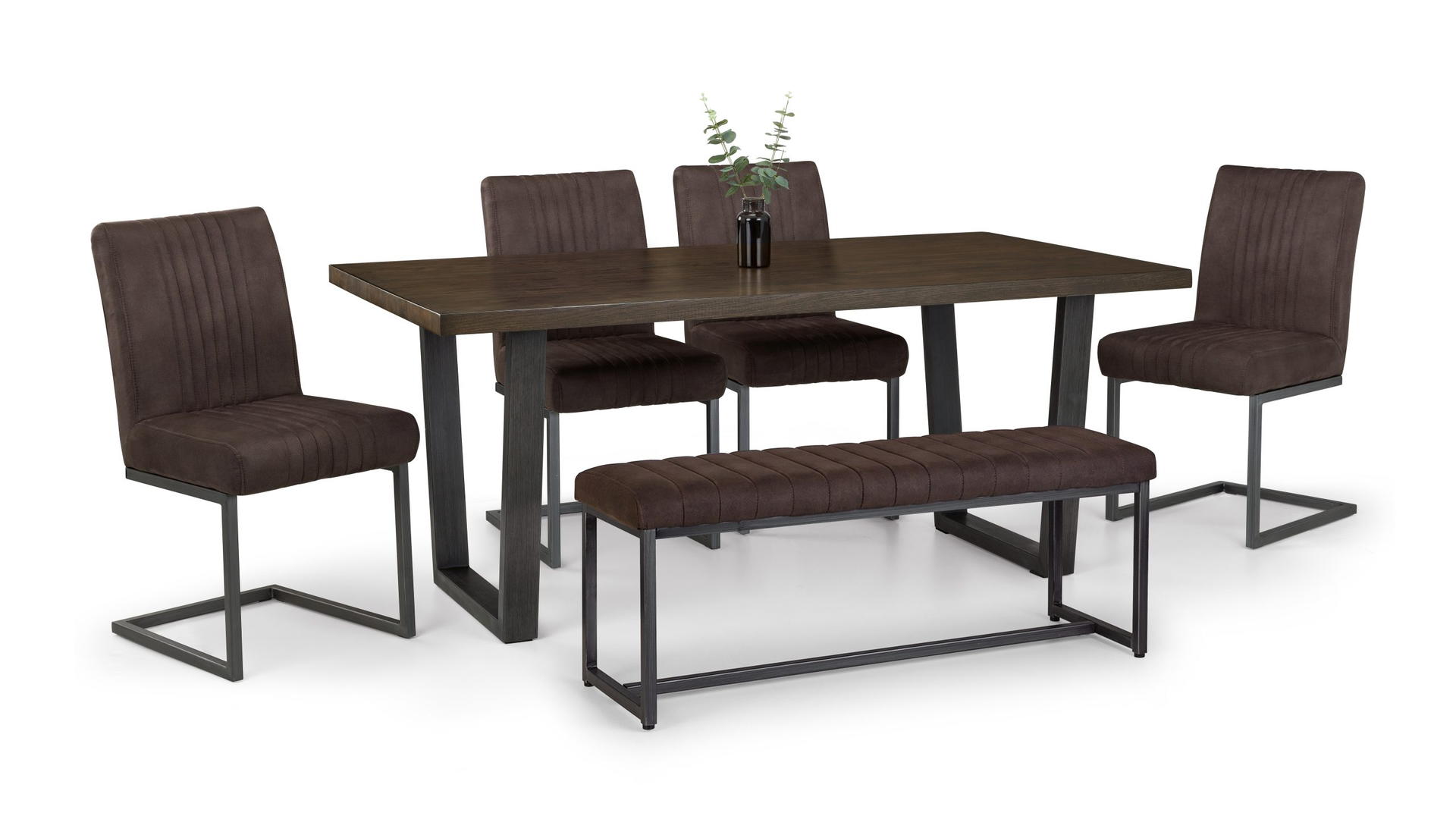 Brooklyn Dark Oak Table, 4 Charcoal Chairs and Upholsterd Bench