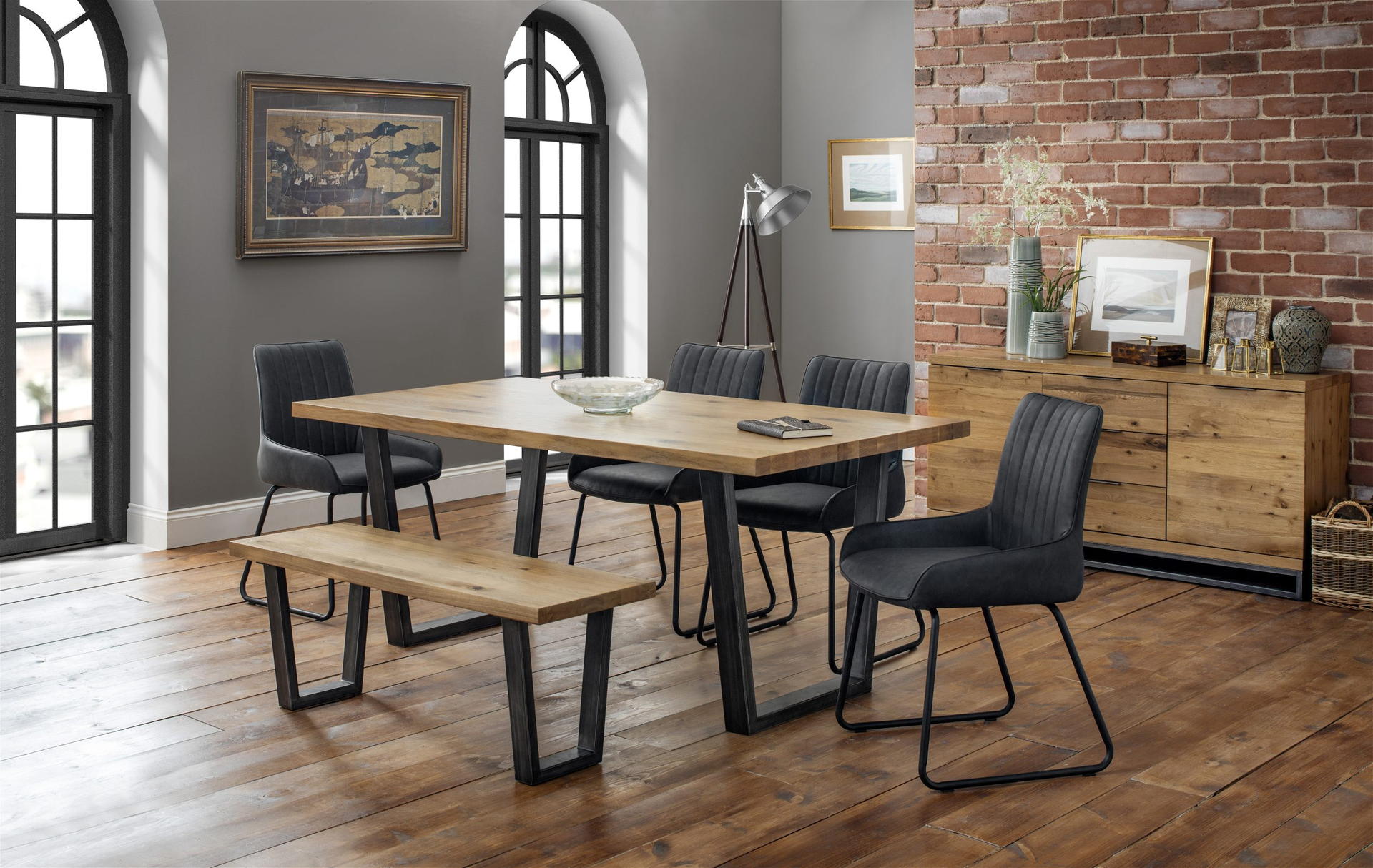 Brooklyn Oak Rectangular Table, 1 Oak Brooklyn Bench and 4 Grey Soho Chairs