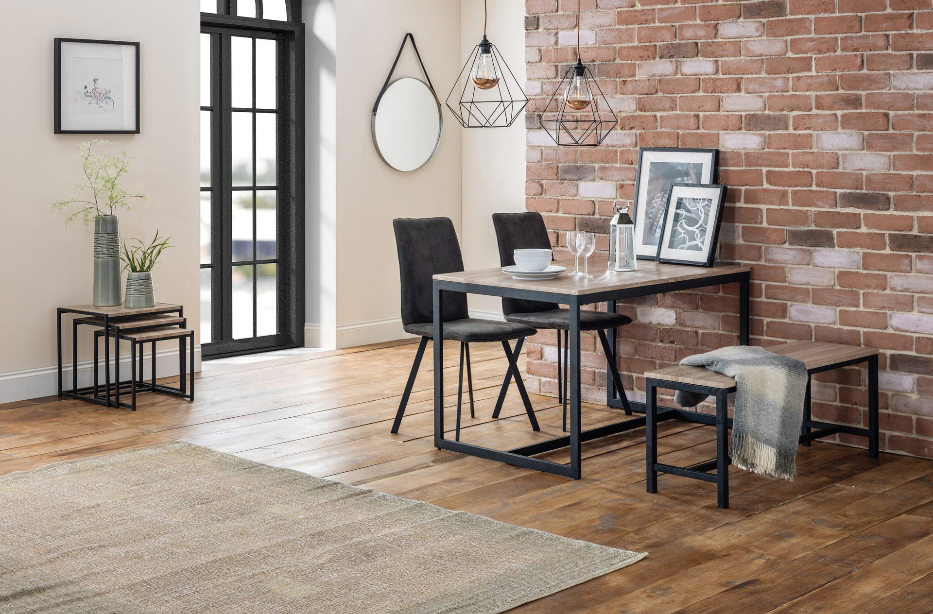 Tribeca Oak Table, 1 Oak Tribeca Bench and 2 Monroe Chairs