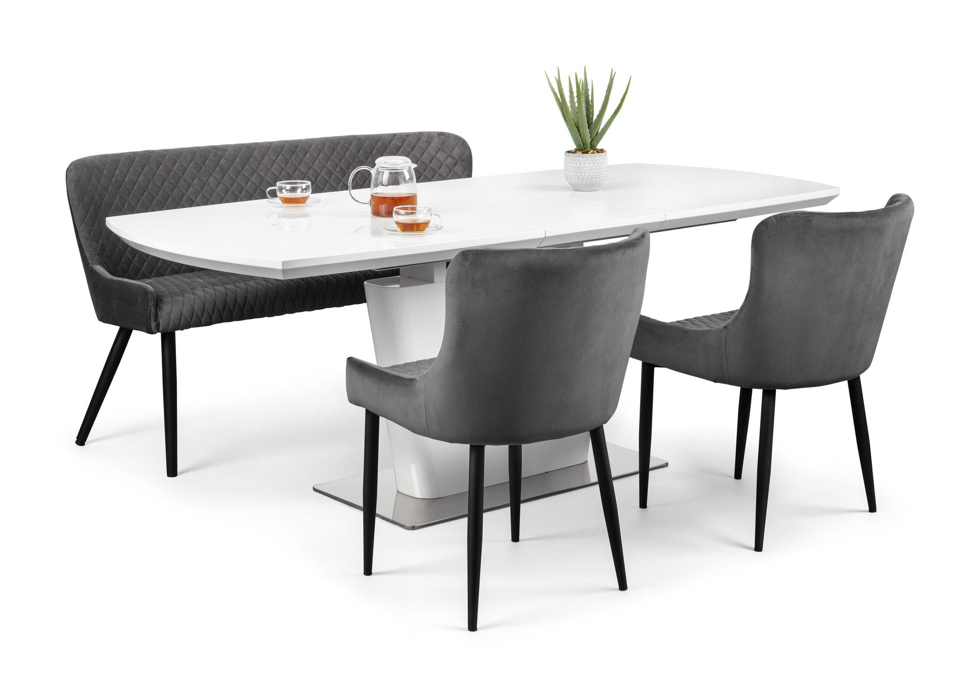 The Luxe High Back Bench offers a classic style with a modern twist, beautifully upholstered in a modern grey velvet with a luxuriant quilted finish offering depth and texture. This bench is perfect use for dining or a striking focal point for any room.