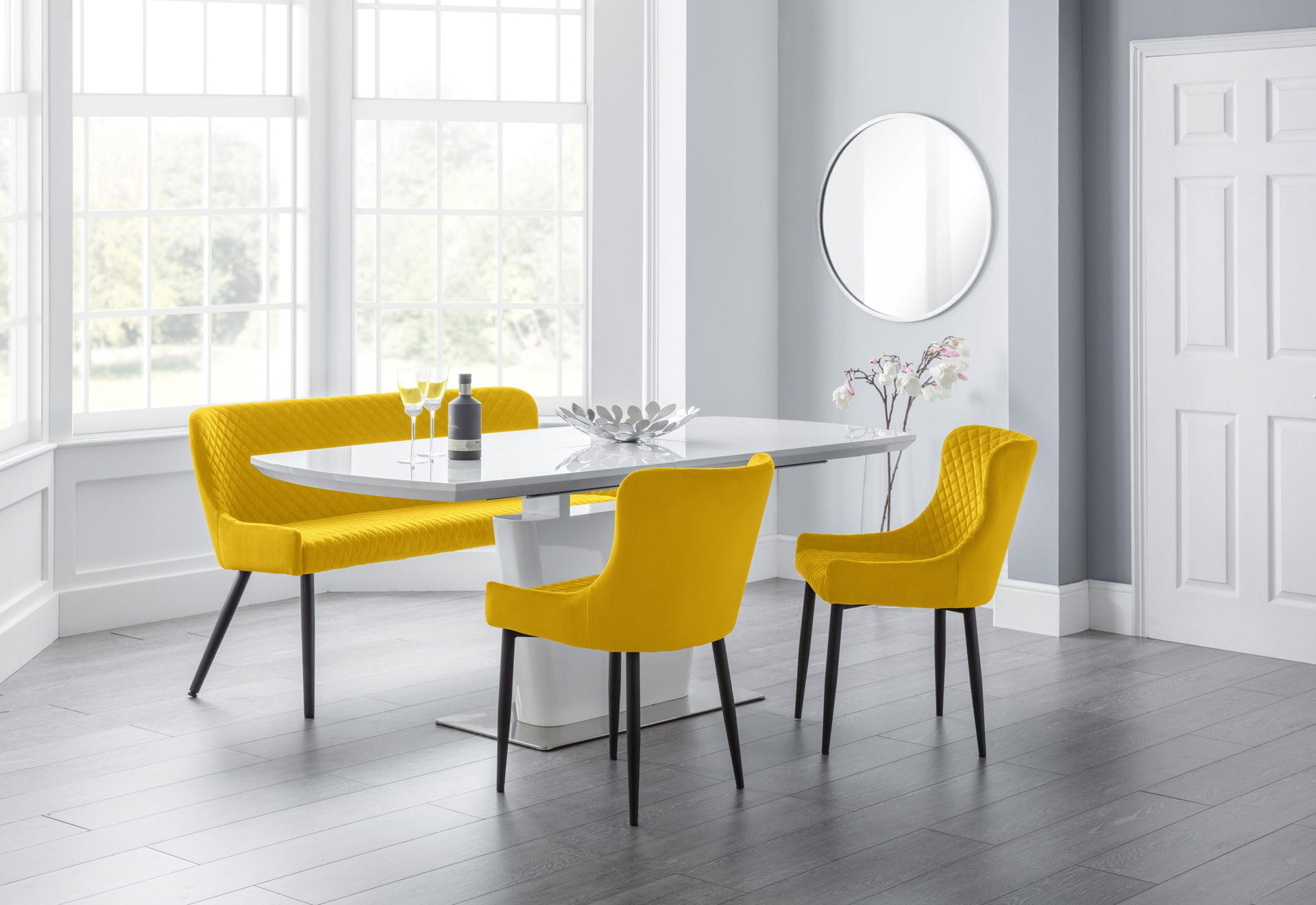 The Luxe High Back Bench offers a classic style with a modern twist, beautifully upholstered in a modern mustard velvet with a luxuriant quilted finish offering depth and texture. This bench is perfect use for dining or a striking focal point for any room.