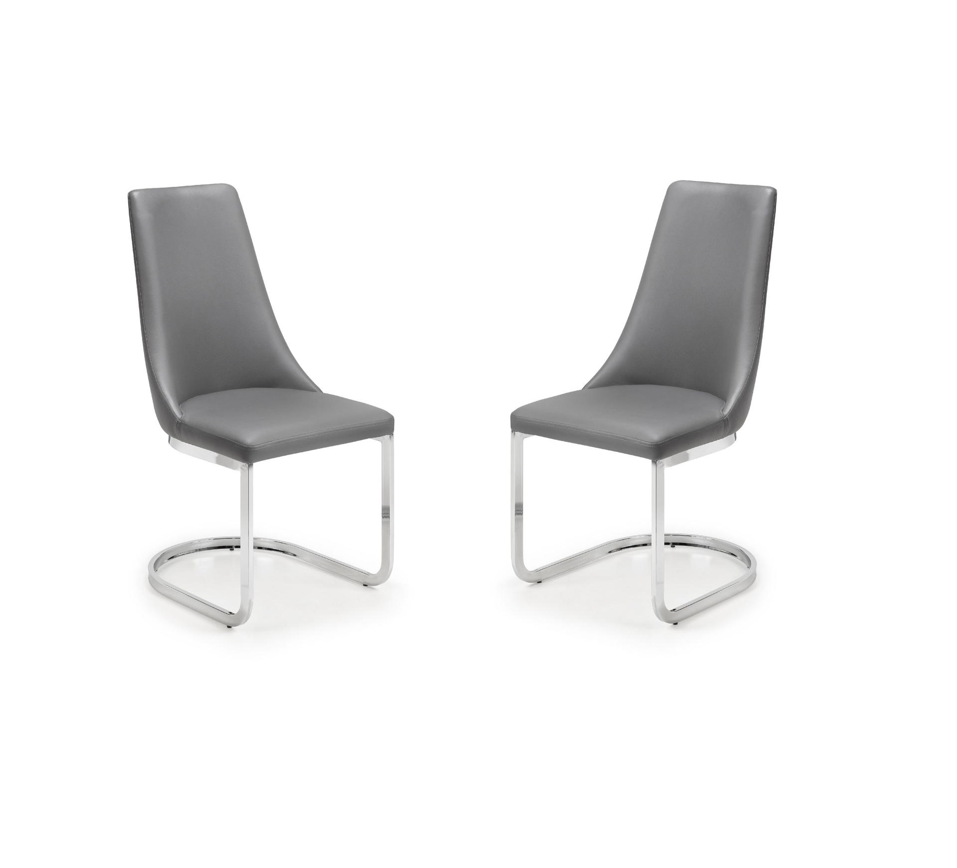 Upholstered in a grey faux leather, the Como Cantilever dining chair offers luxurious comfort. Featuring a chrome curved base, this chair adds class and sophistication to any dining room decor. Simply pair with the Como Extending Dining Table for an sleek, modern look.