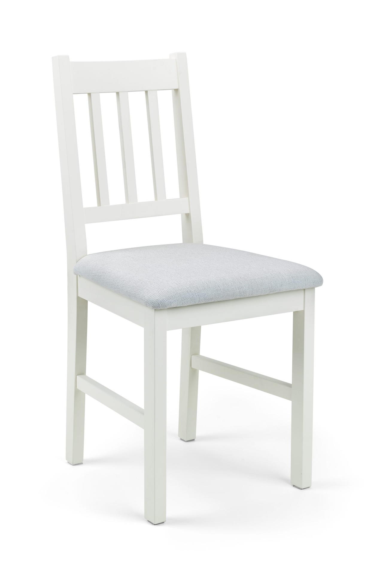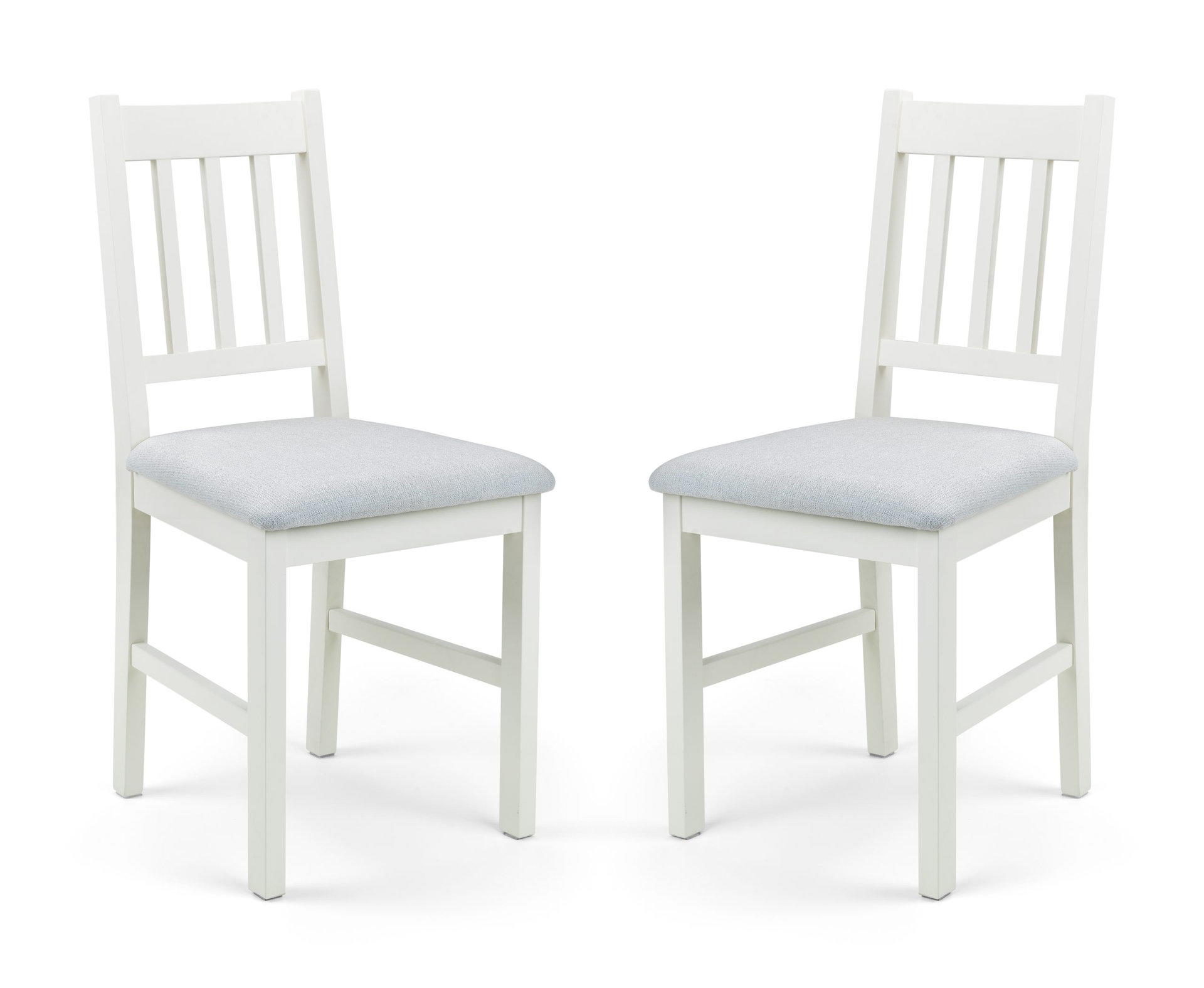 Solid White Oak Dining Chairs in a durable lacquered finish and featuring a padded grey linen seat..