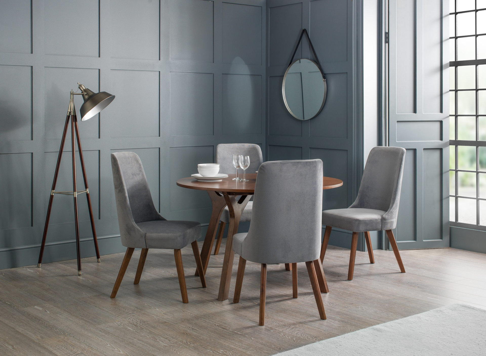 The Huxley Dining Chair features a glamourous curved back, with modern tapered walnut legs. Finished in dusk grey chenille fabric, this dining chair adds a touch of elegance to any dining area, the perfect match for the Huxley Round Table.