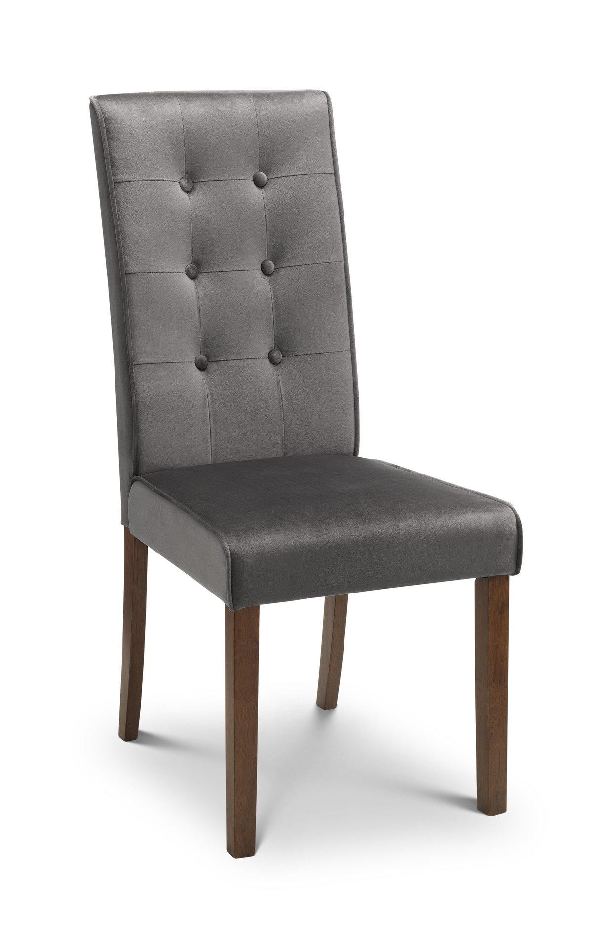 Upholstered in luxurious grey velvet, the Madrid dining chair adds a touch of class to any room. Featuring a high tufted back and walnut coloured legs, this dining chair is suitable for a variety of dining tables and décor. The perfect match for the Julian Bowen Kensington and Chelsea dining tables.