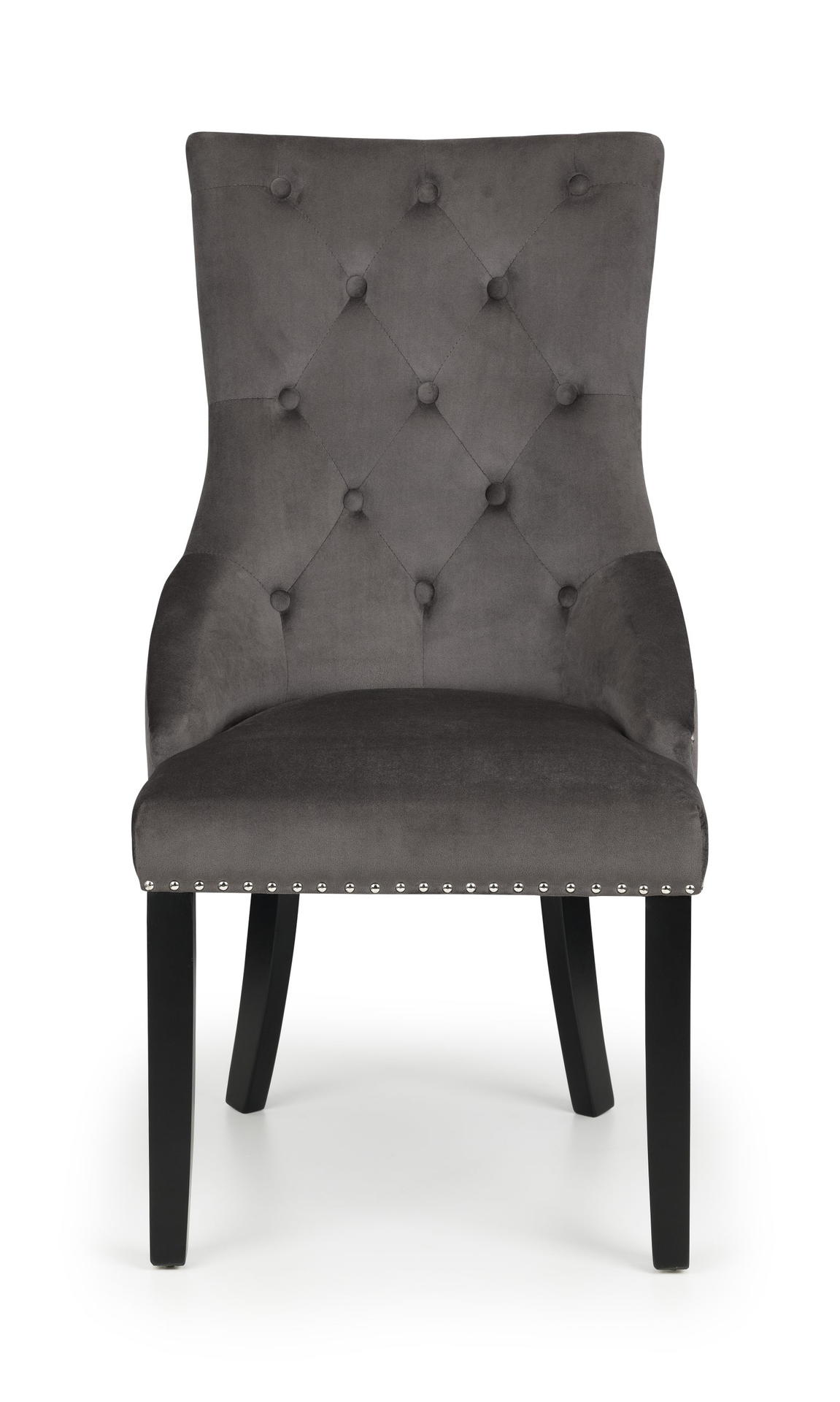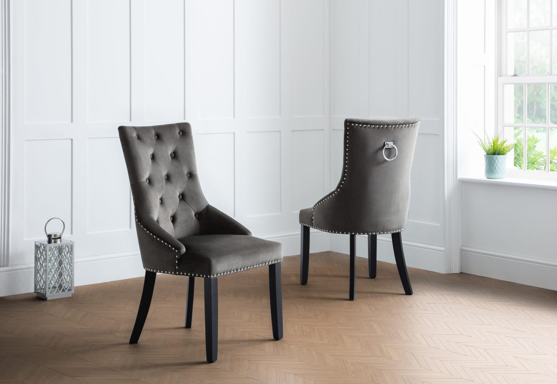 Upholstered in a soft touch luxurious grey velvet fabric, the Veneto Knocker back chair has a metal ring detail on the back along with glamourous deep buttoning and a metal stud trim. Finished with sturdy black lacquered legs, this chair is perfect as a statement standalone or as part of a dining set