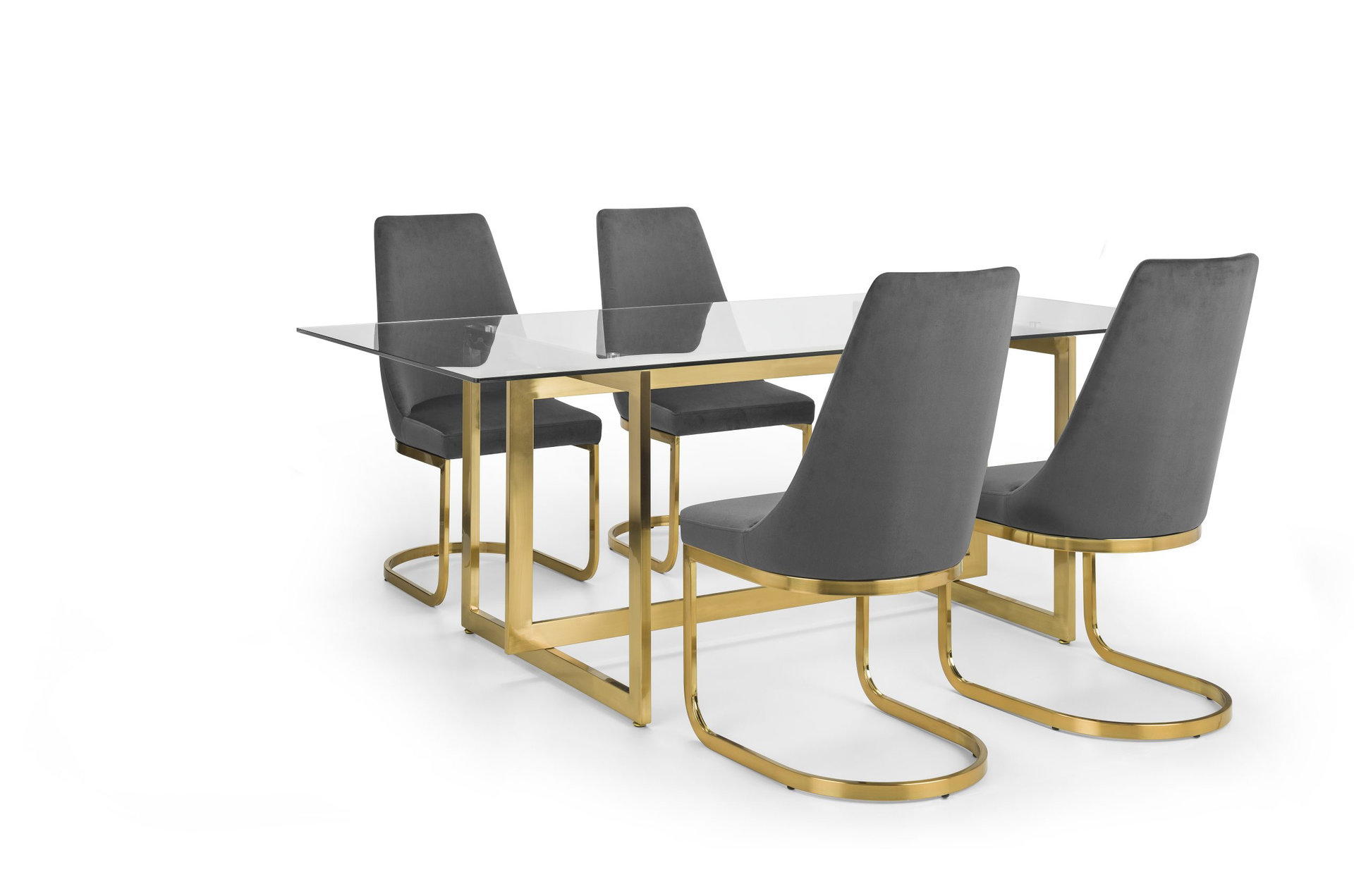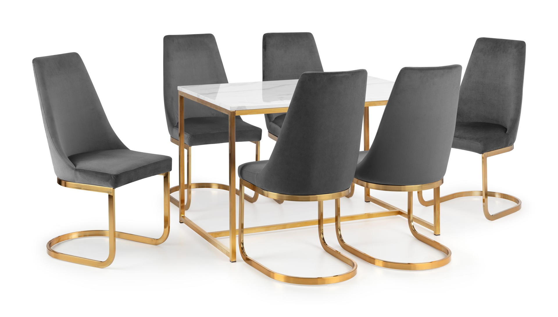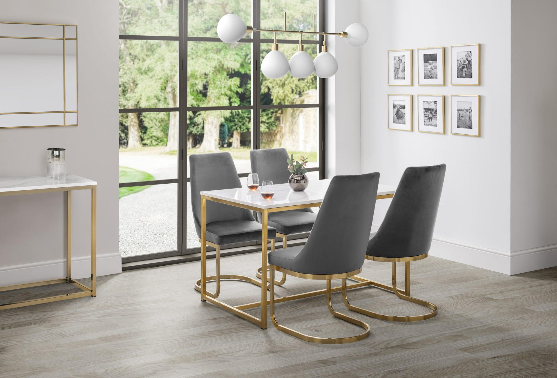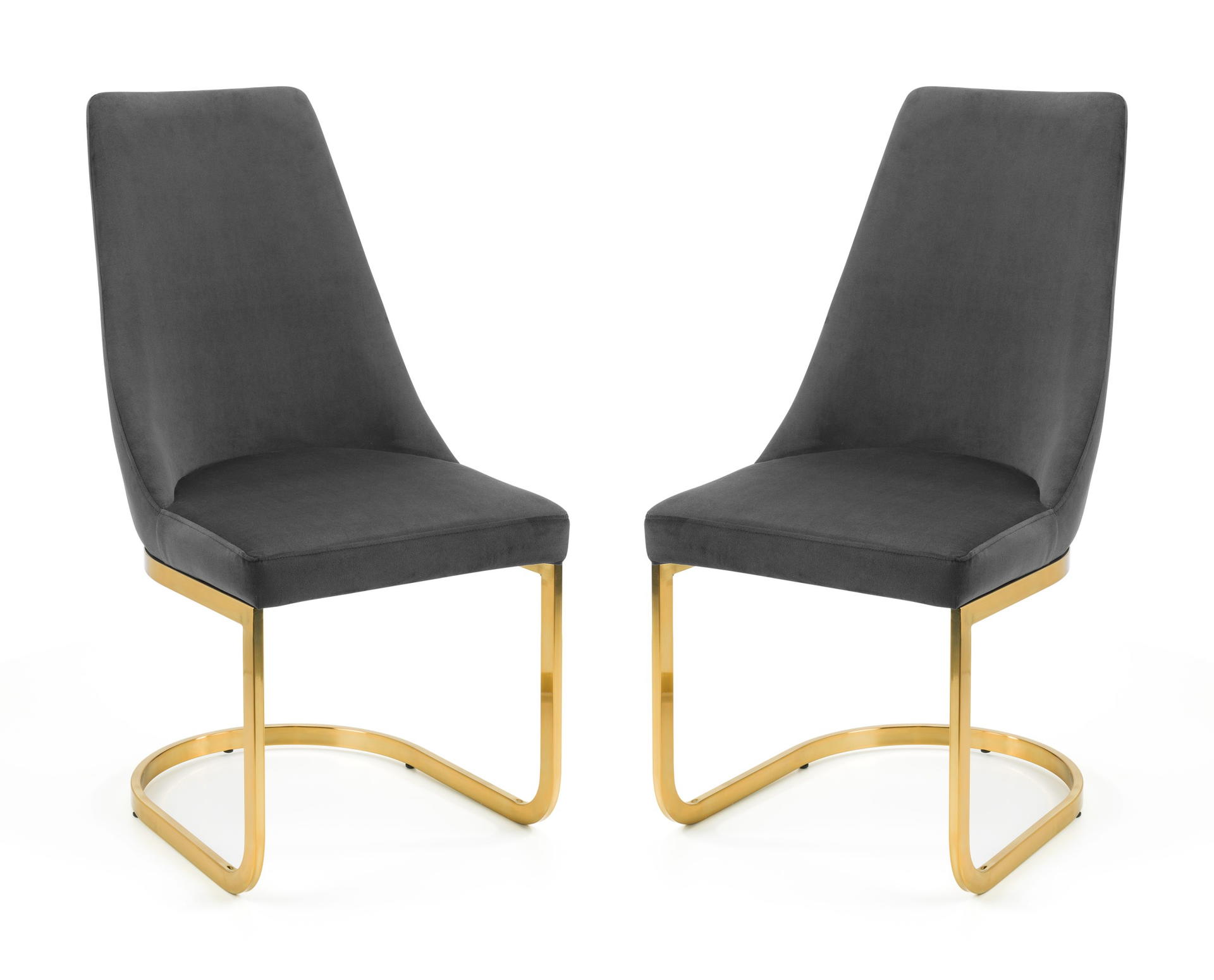 The Vittoria Cantilever chair brings sophistication and class to your home. With a golden U-shaped base and elegant velvet upholstery – this chair provides a classic touch to any dining area. The solid metal base adds great stability whilst the high backrests are supportive and comfortable. Available in grey or blue.