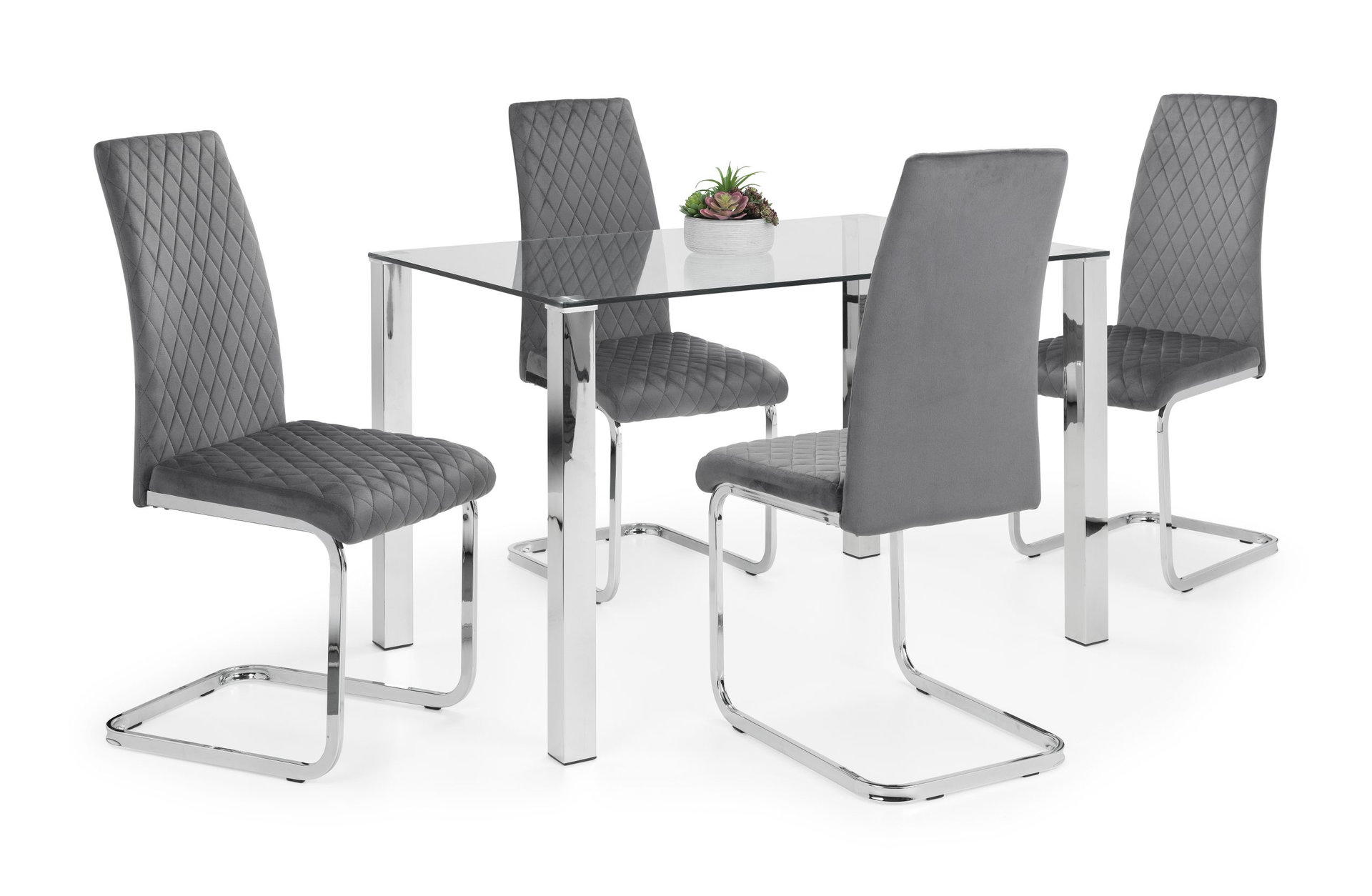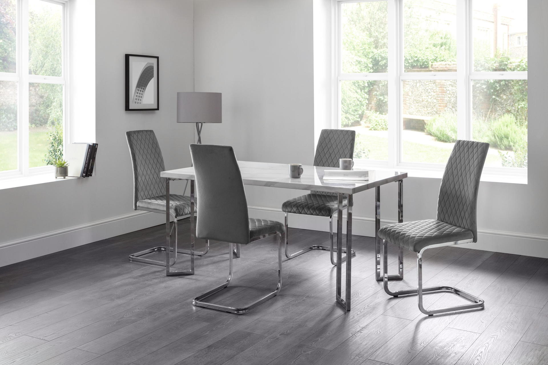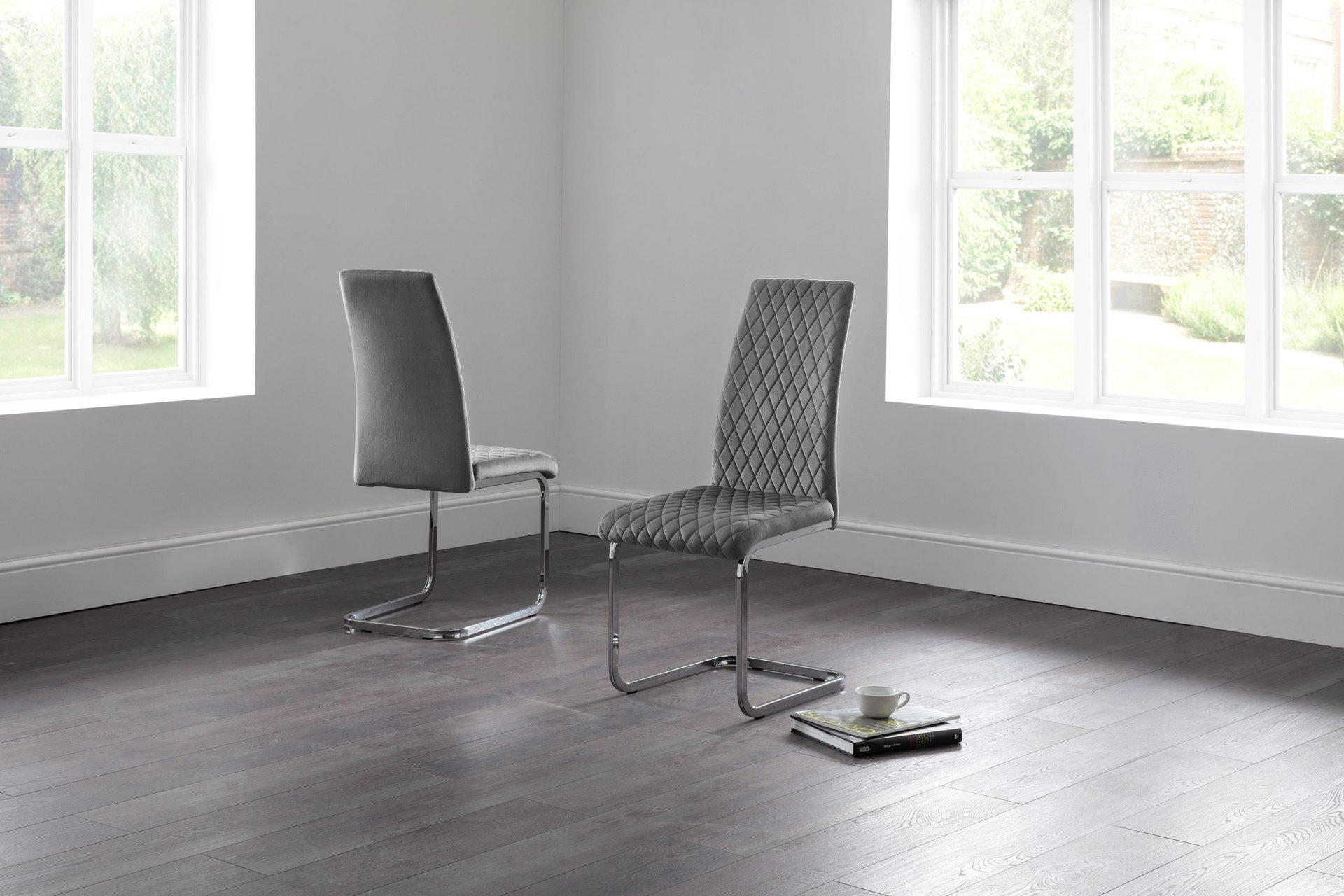 The modern Calabria Dining Chairs offering an elegant touch to any dining area. Upholstered in a choice of grey or blue rich velvet, with delicate diamond stitching upon a high, curved back rest for added comfort. Finished with a chrome plated cantilever frame, this dining chair is perfect for a wide range of Julian Bowen dining tables.